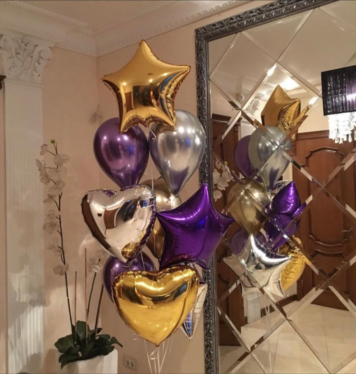 В композицию входит : Коробка с вашей надпись 5 фонтанов ( по 2 фольгированные звезды + 1 фольгированное сердце + 2 шара с конфетти + 8 шаров постель ) 2 шара гигант с конфетти 1 шар гигант белый 2 цифры 50 шаров постель под потолок 10 грузиков