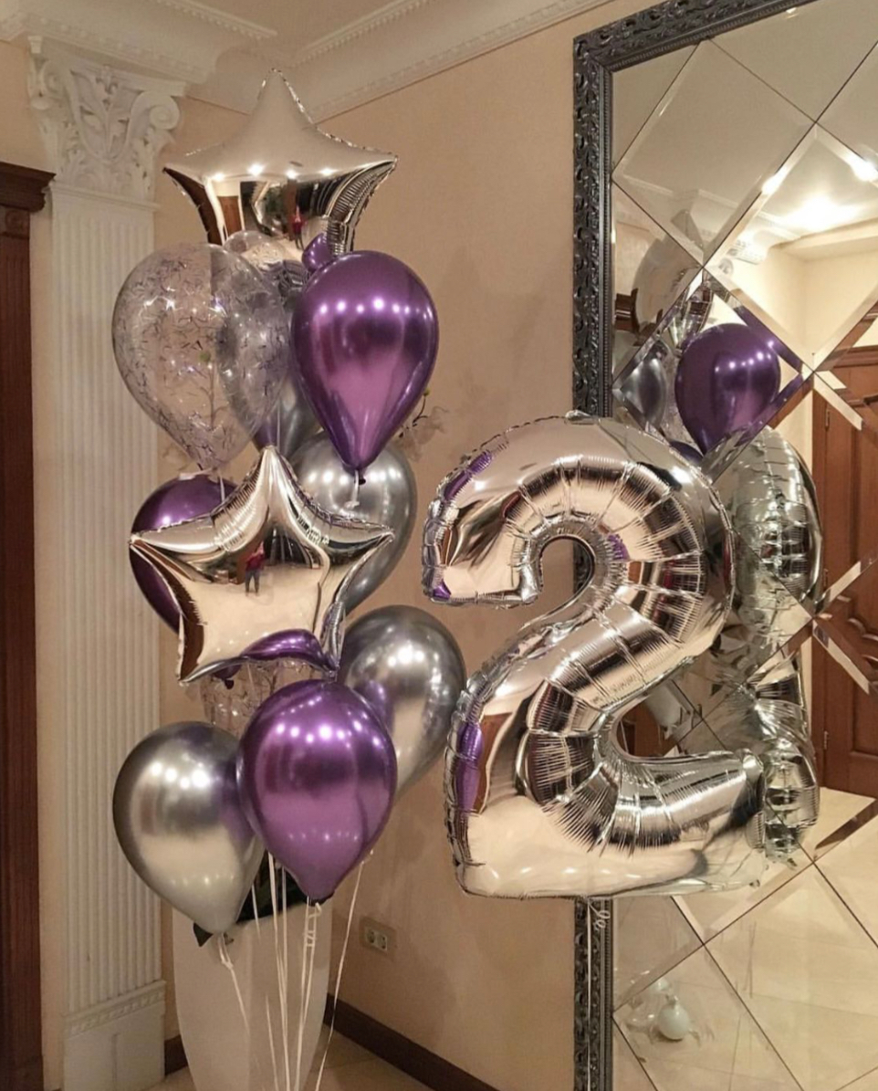 В композицию входит : 2 фонтана ( по 3 фольгированные звезды + 2 шара с конфетти + 2 шара хром + 7 шаров постель ) Цифра 3 грузика