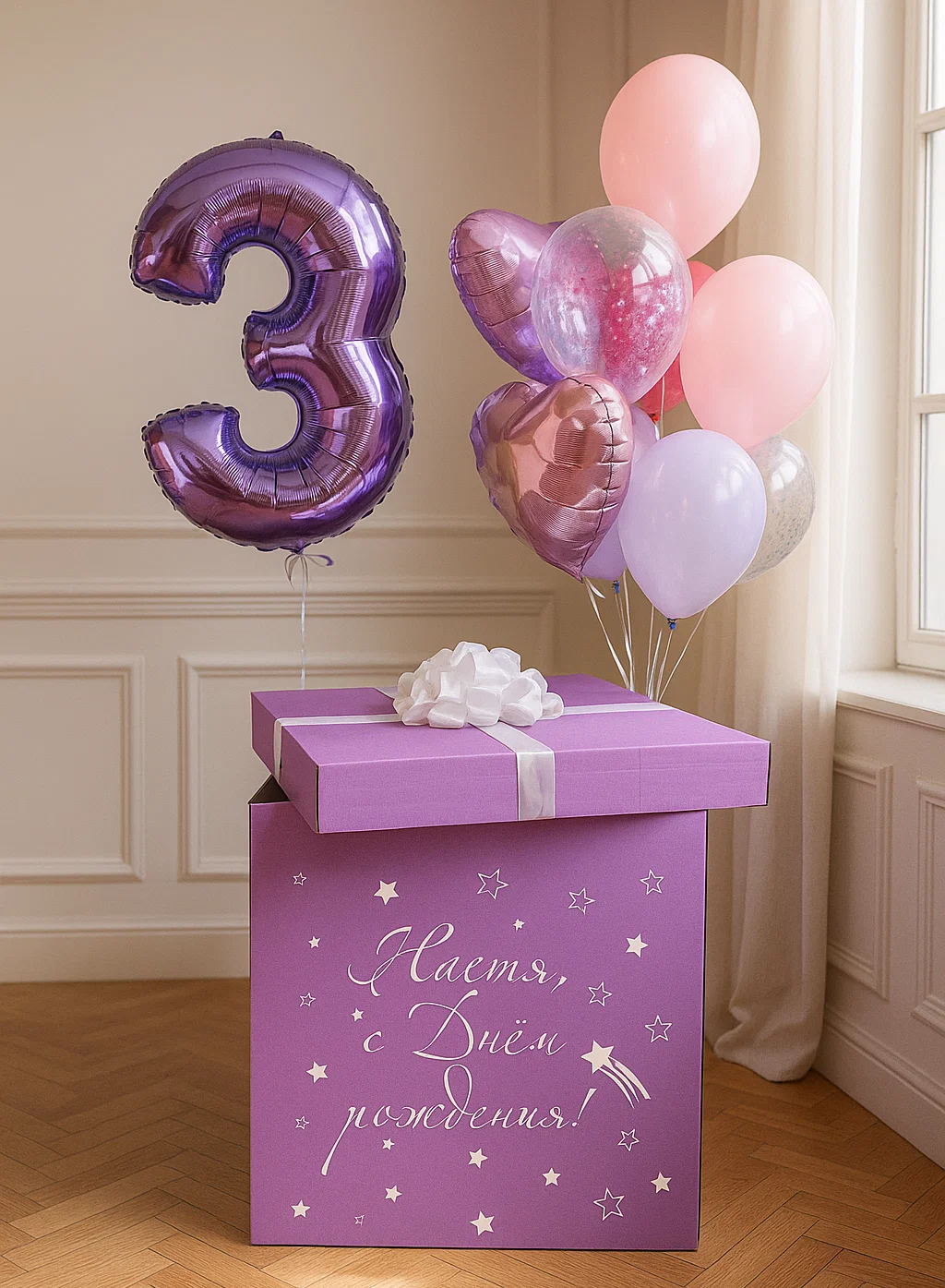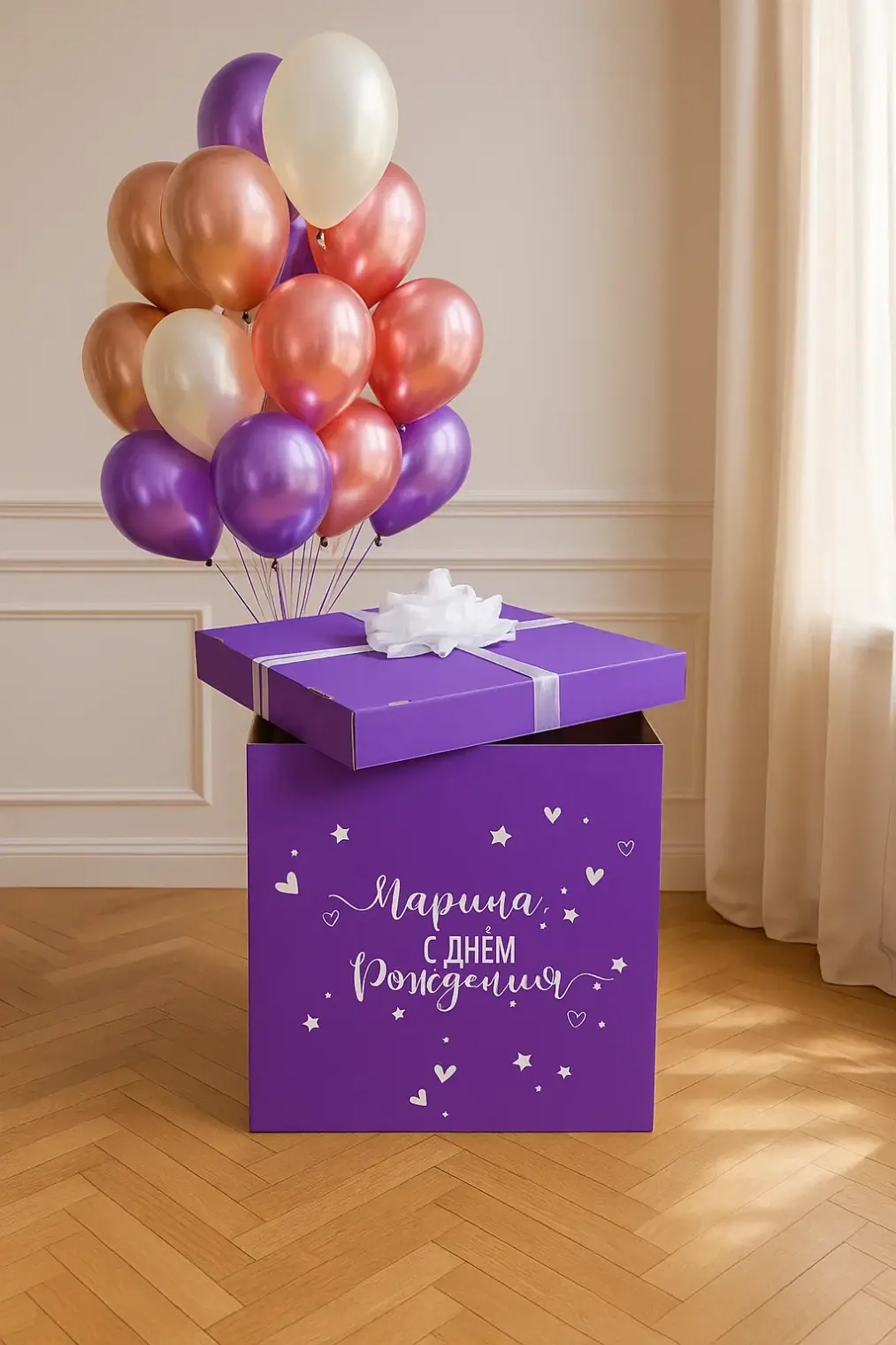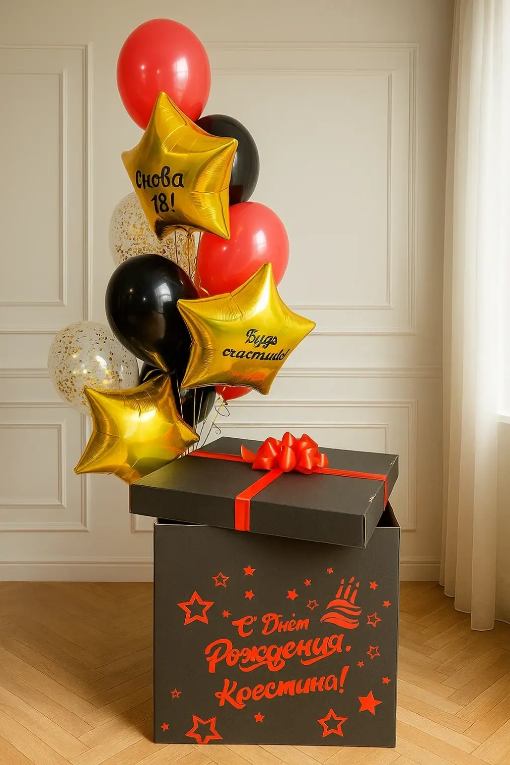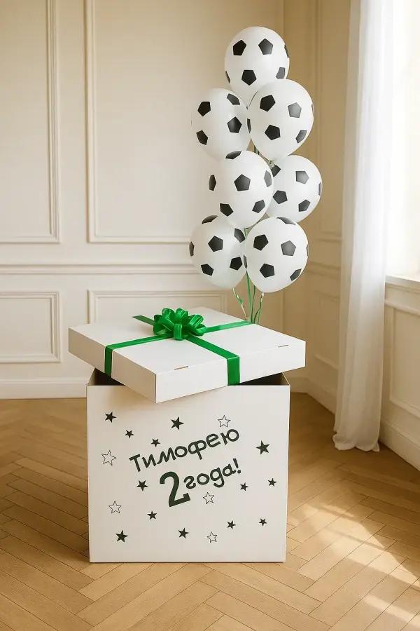 В композицию входит : Коробка с вашей надписью Фонтан ( 2 фольгированные звезды, 1 фольгированное сердце, 2 шара с конфетти, 1 шар хром, 3 шара пастель ) 1 грузик