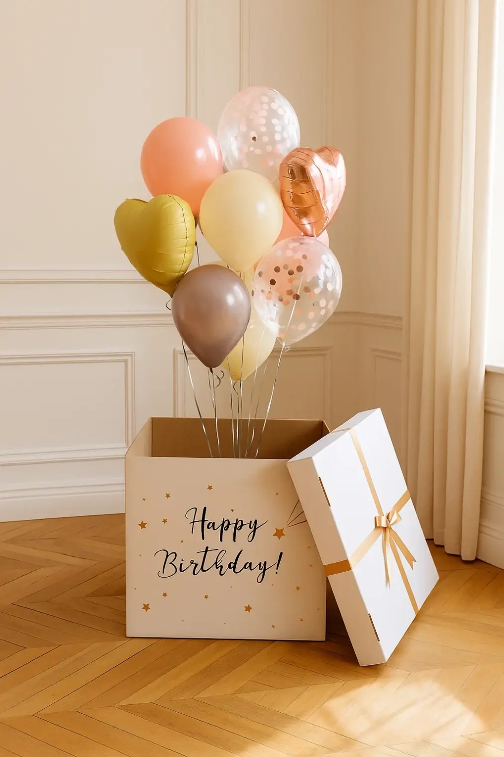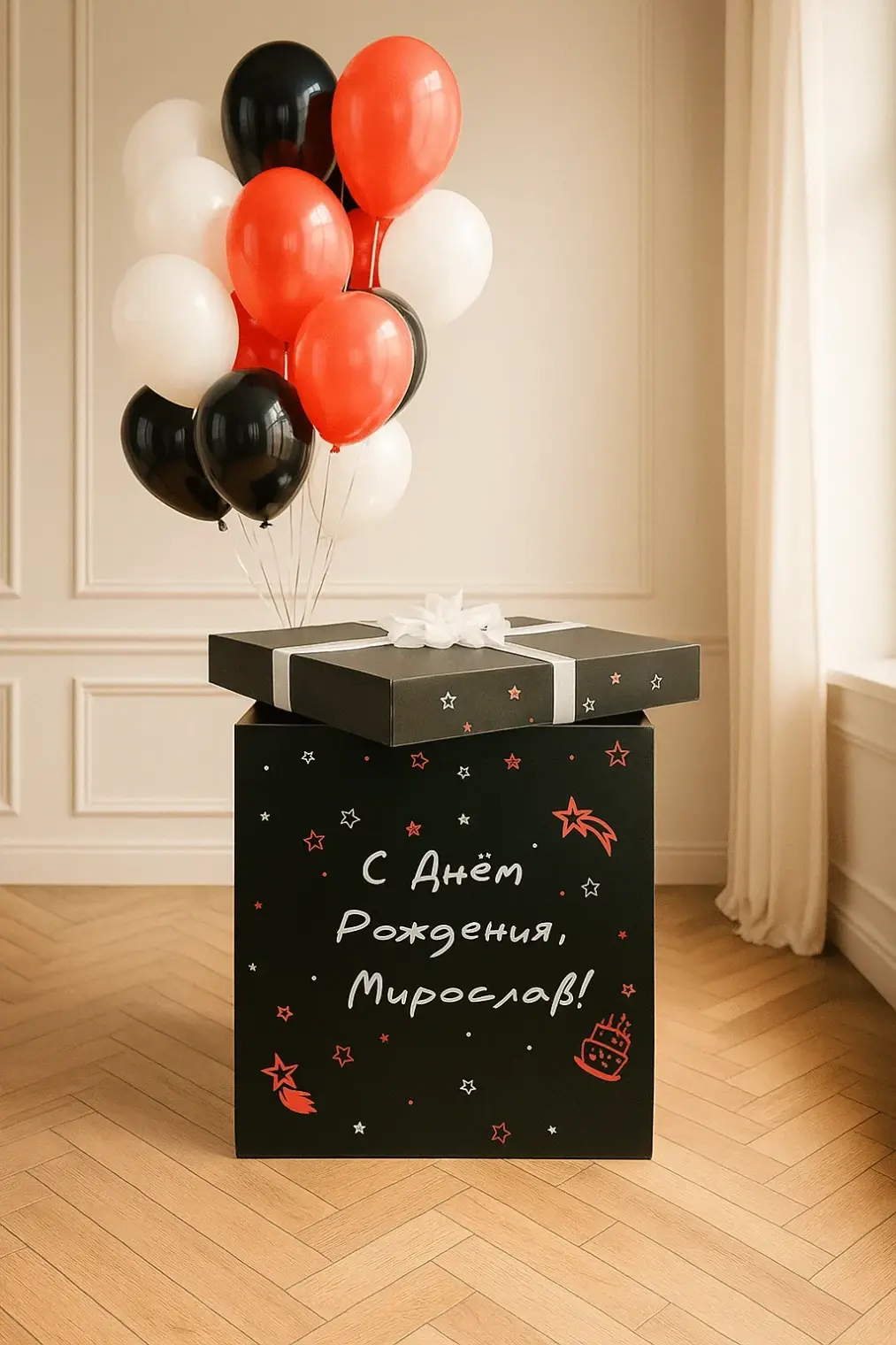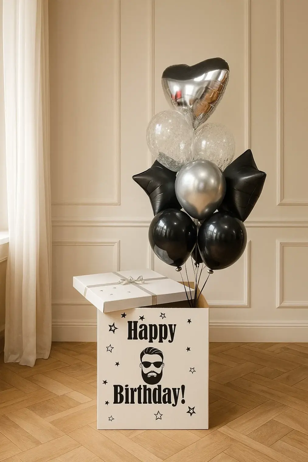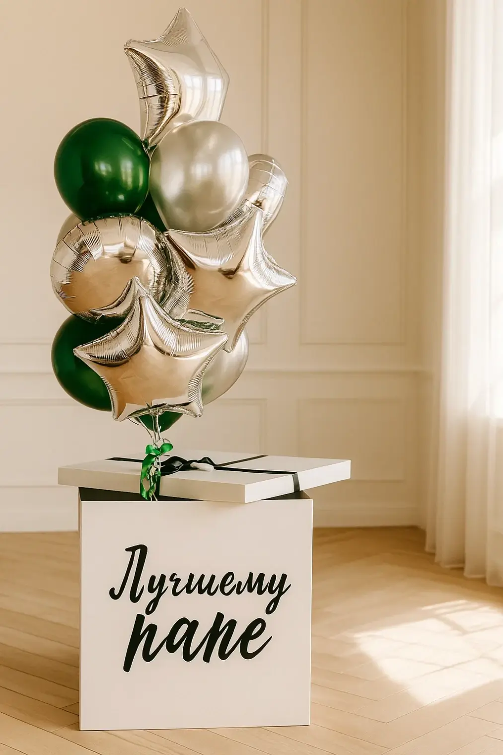 В композицию входит : Коробка с вашей надписью Фонтан ( 2 фольгированные звезды, 1 фольгированное сердце, 2 шара с конфетти, 1 шар хром, 3 шара пастель ) 1 грузик