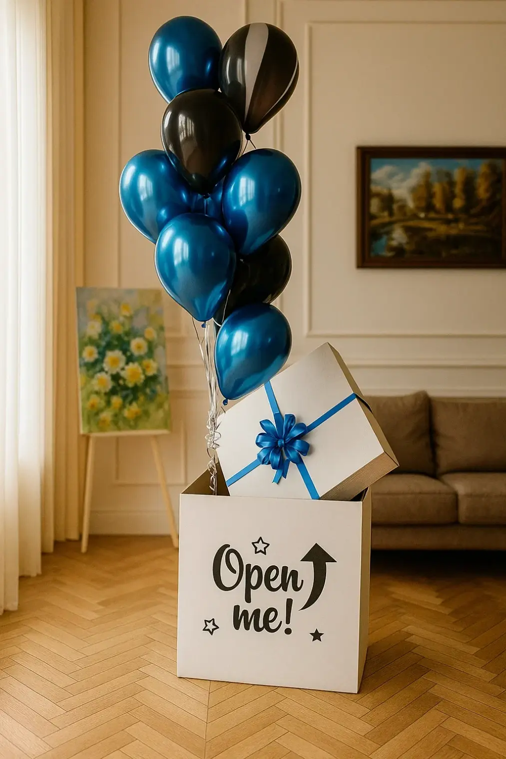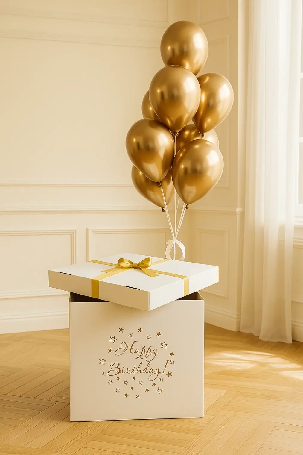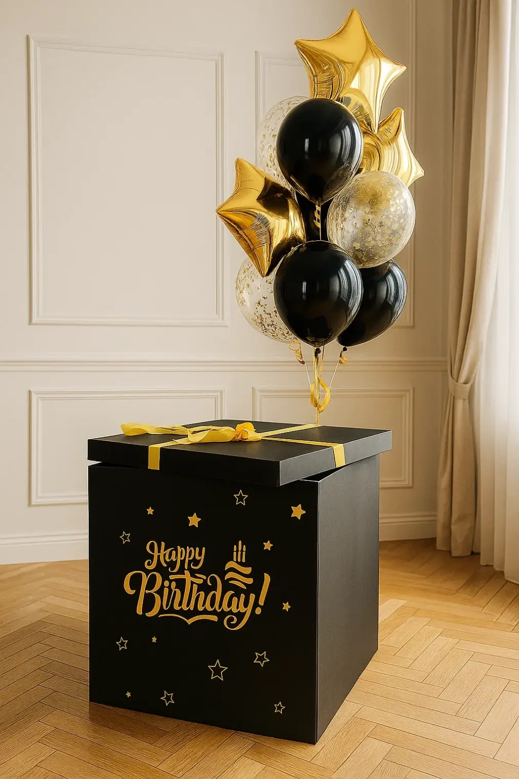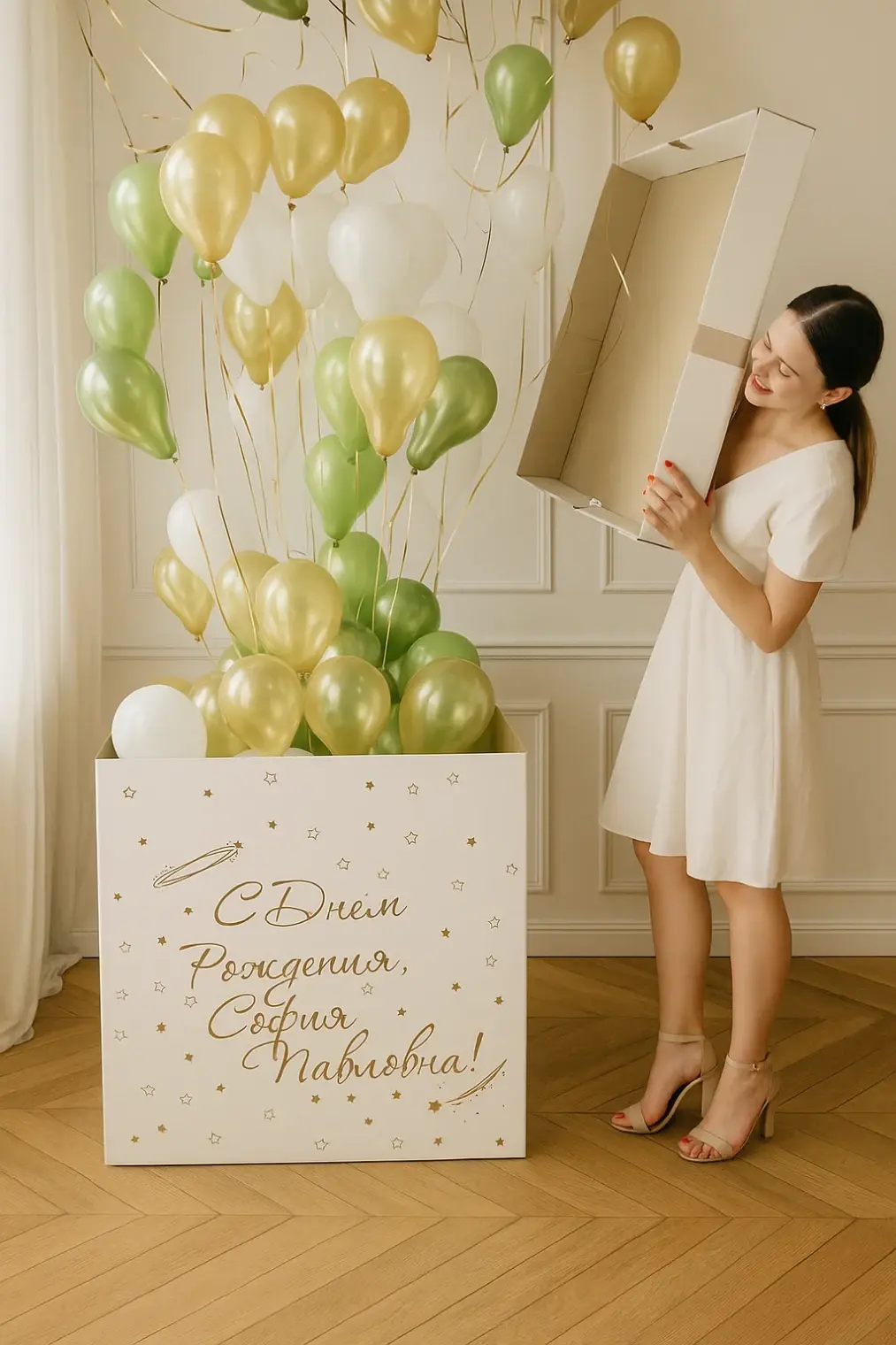 В композицию входит : Коробка с вашей надписью Фонтан ( 2 фольгированные звезды, 1 фольгированное сердце, 2 шара с конфетти, 1 шар хром, 3 шара пастель ) 1 грузик