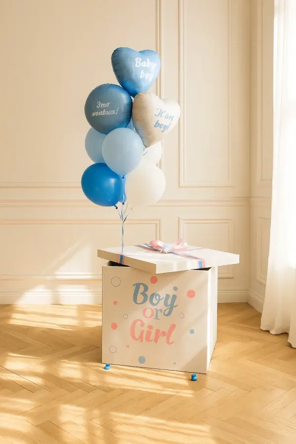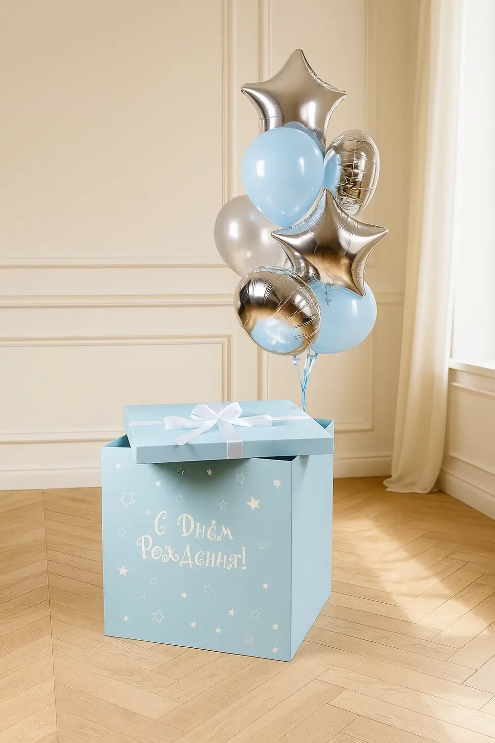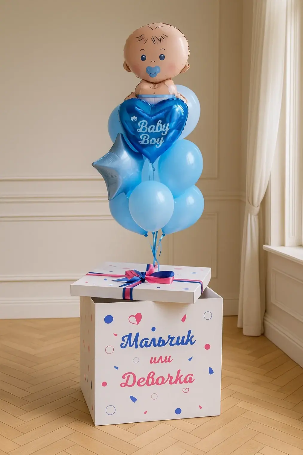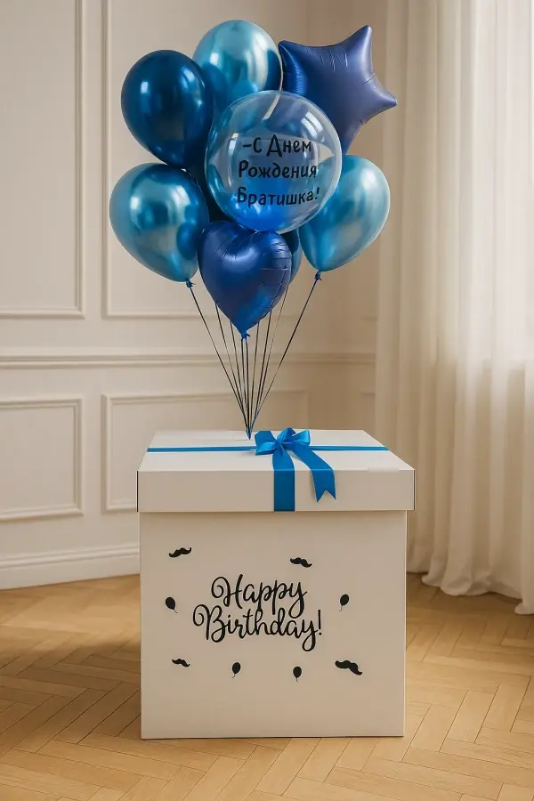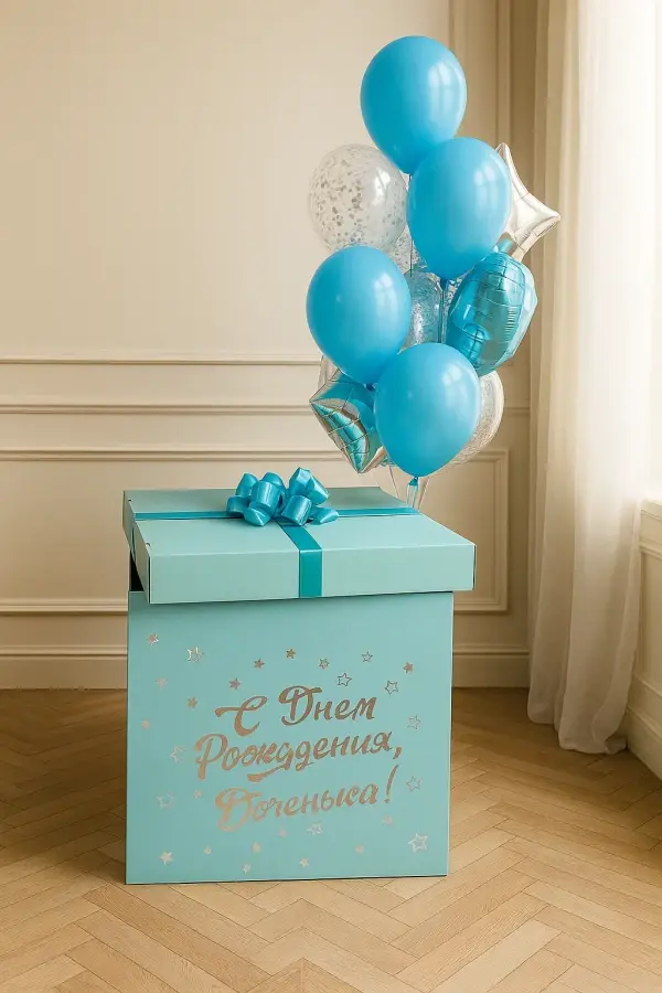 В композицию входит : Коробка с вашей надписью Фонтан ( Баблс с вашей надписью, звезда фольгированная, сердце фольгированная,3 синий хром, 3 голубой хром ) 1 грузик