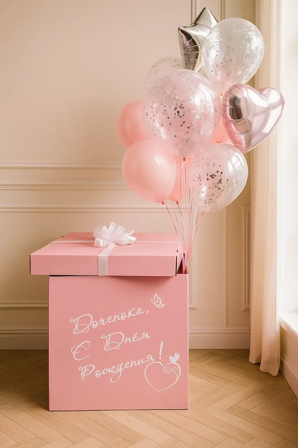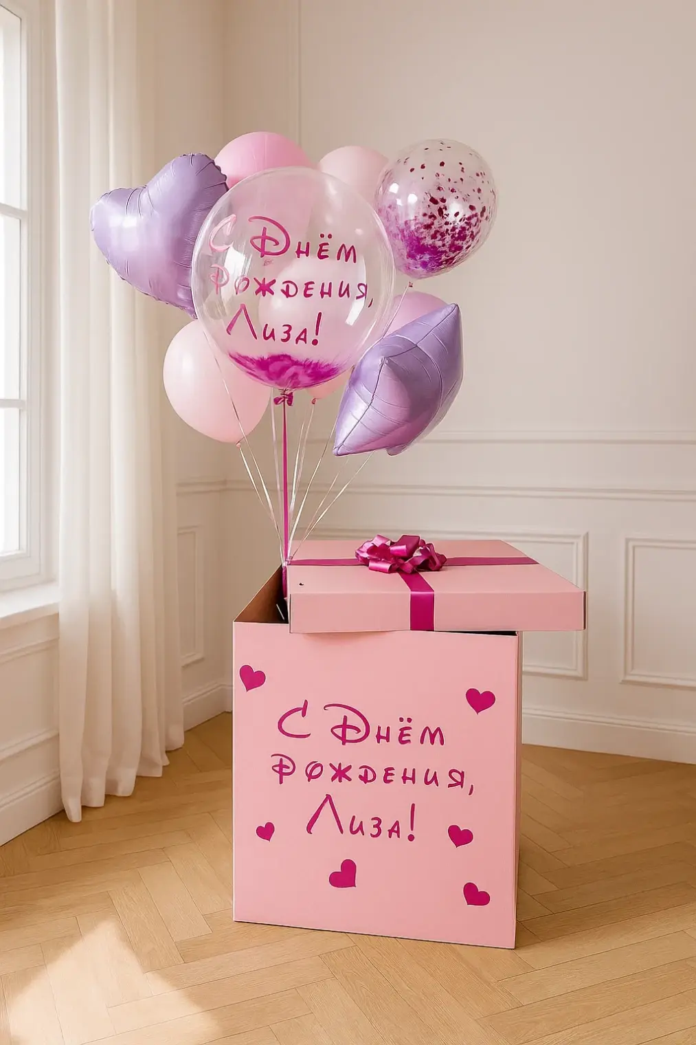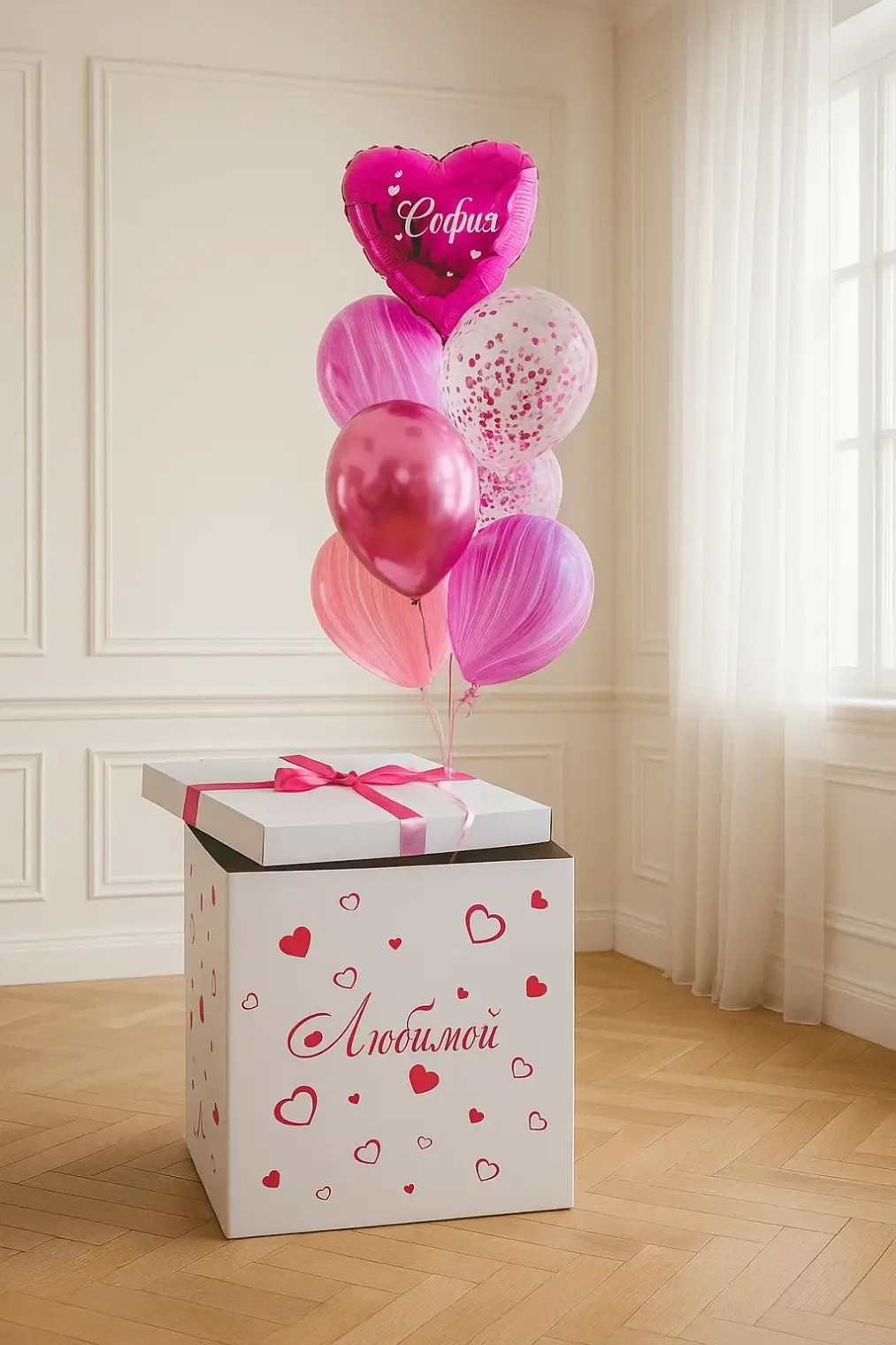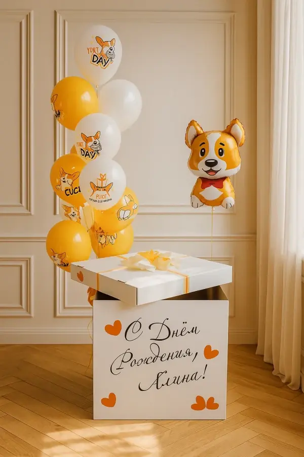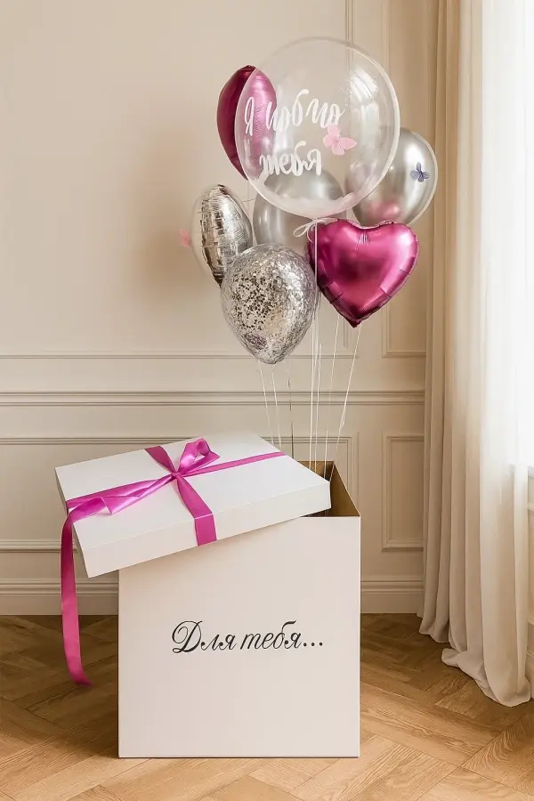 В композицию входит : Коробка с вашей надписью Фонтан ( 2 фольгированных сердца +2 шара хром + 1 шар с конфетти + 1 шар баблс с перьями и вашей надписью )