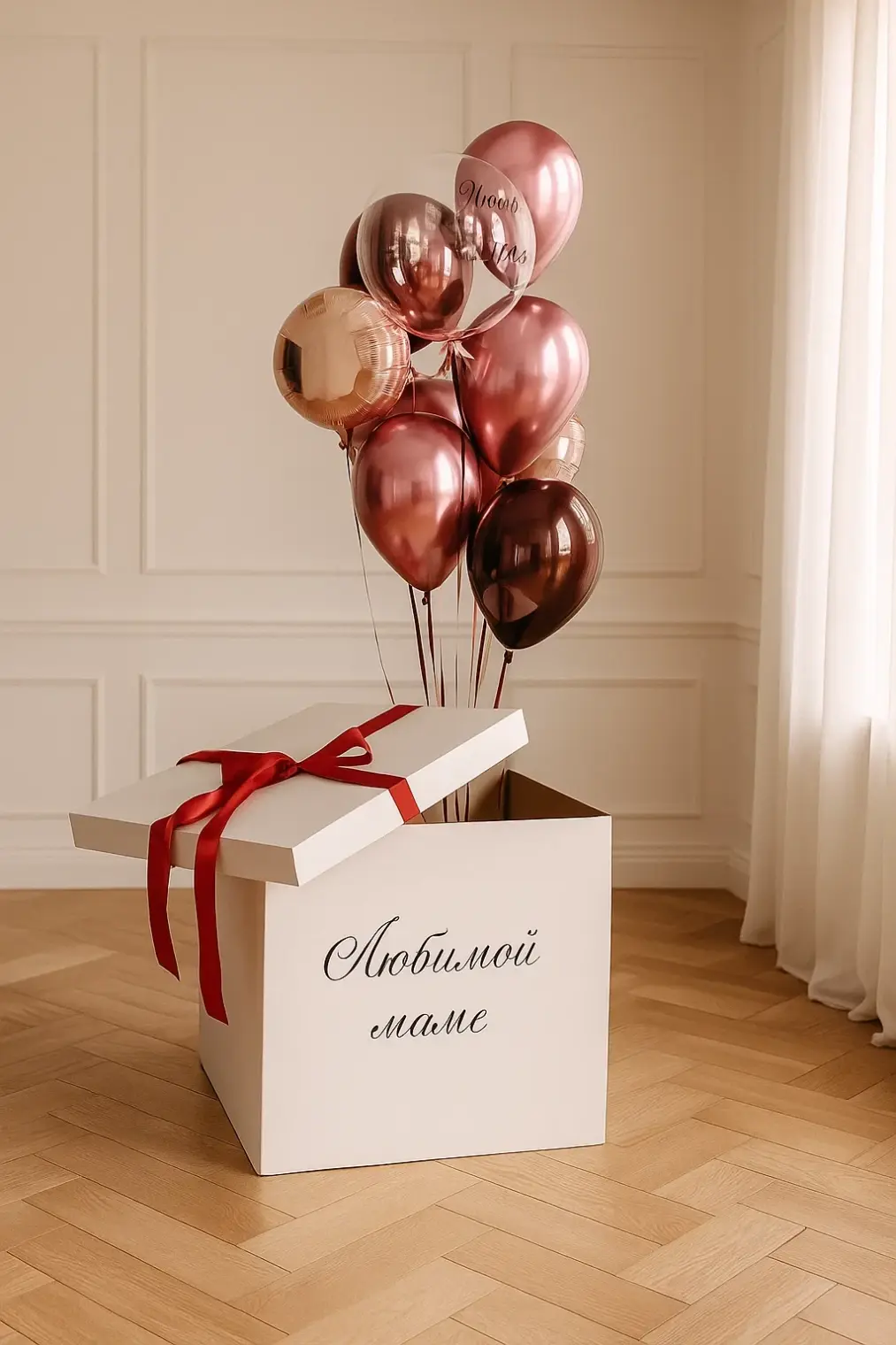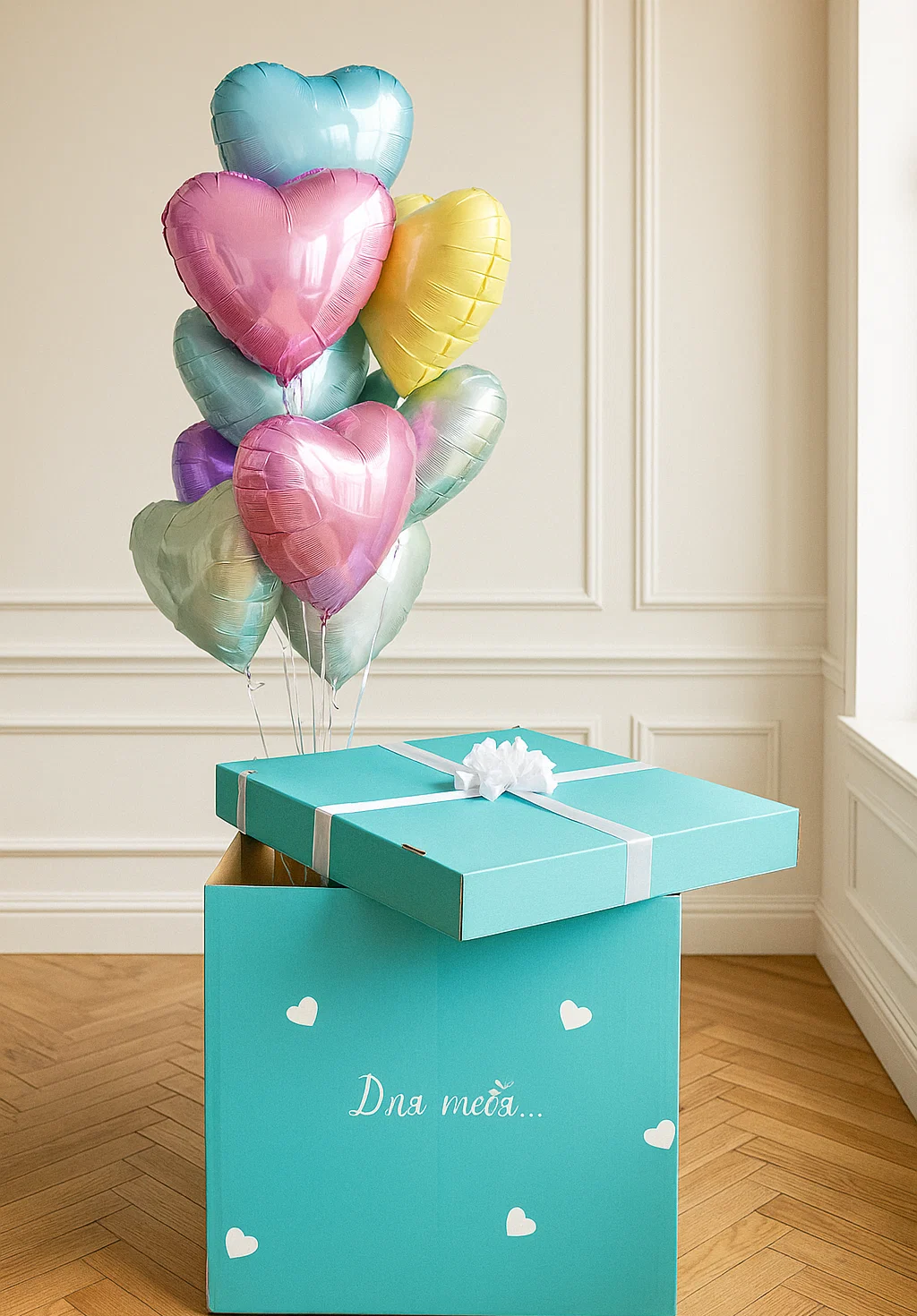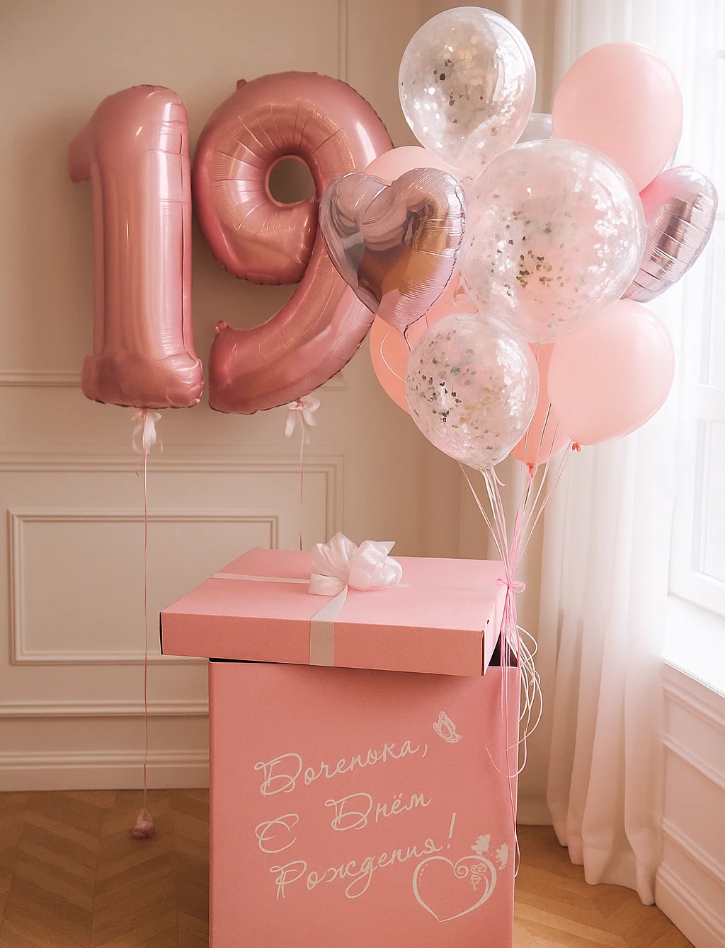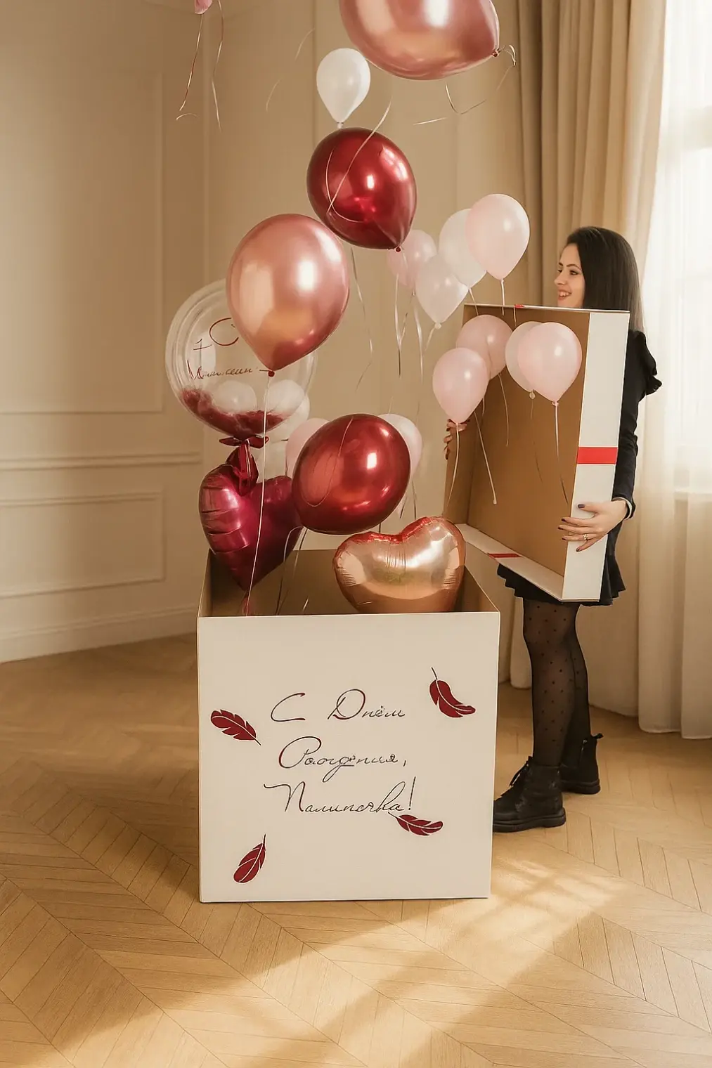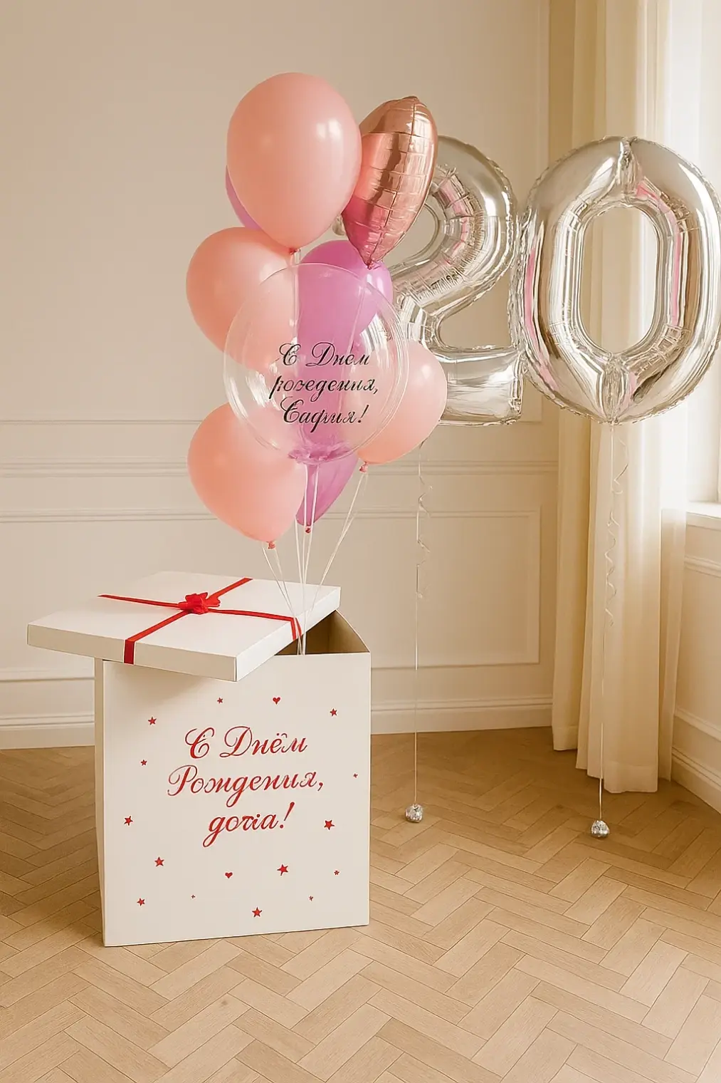 В композицию входит : Коробка с вашей надписью Фонтан ( 2 фольгированных сердца +2 шара хром + 1 шар с конфетти + 1 шар баблс с перьями и вашей надписью )