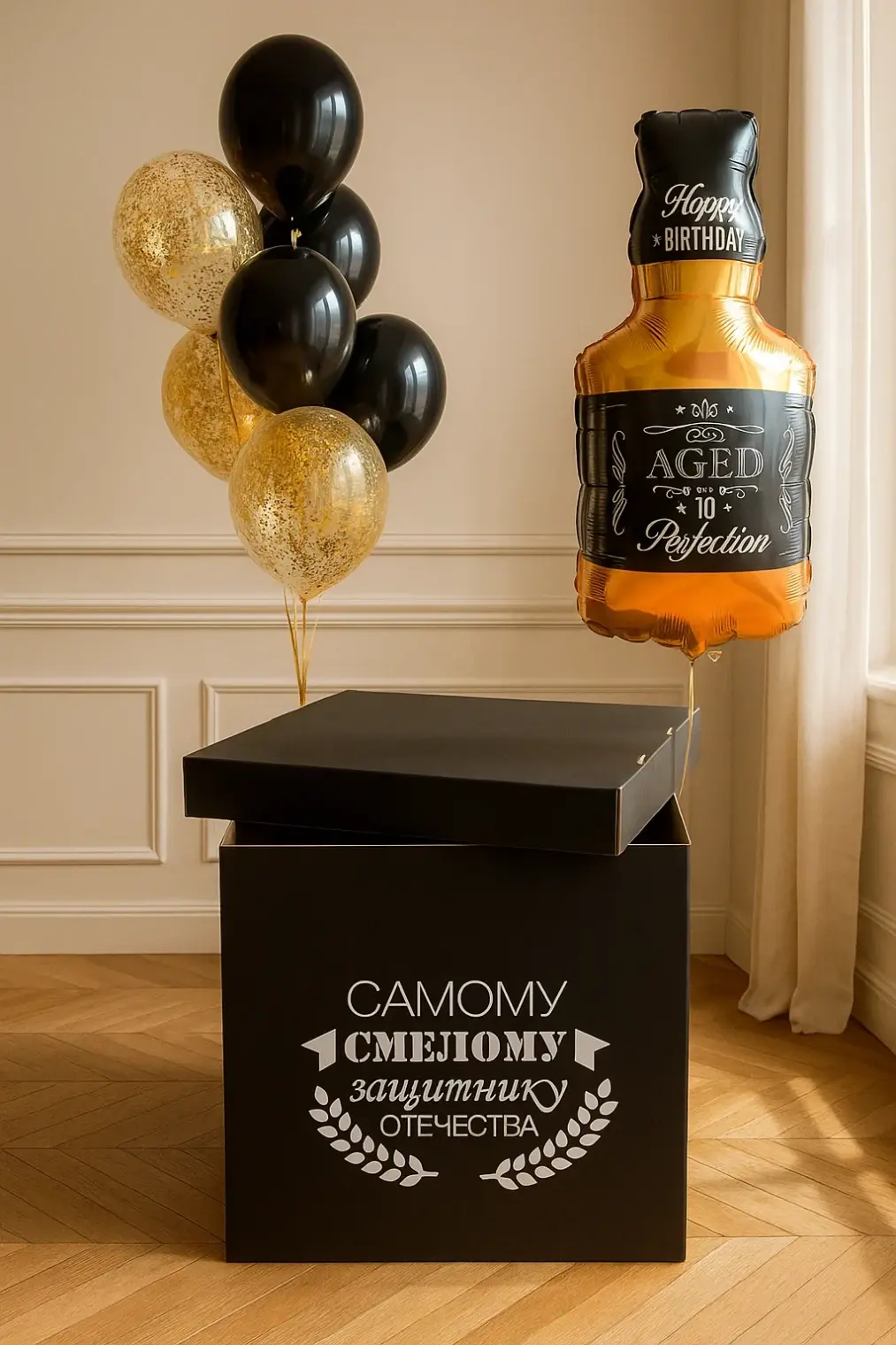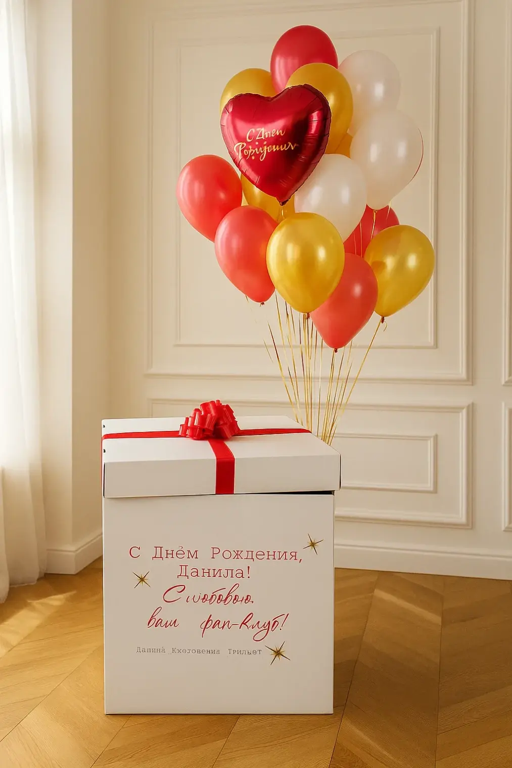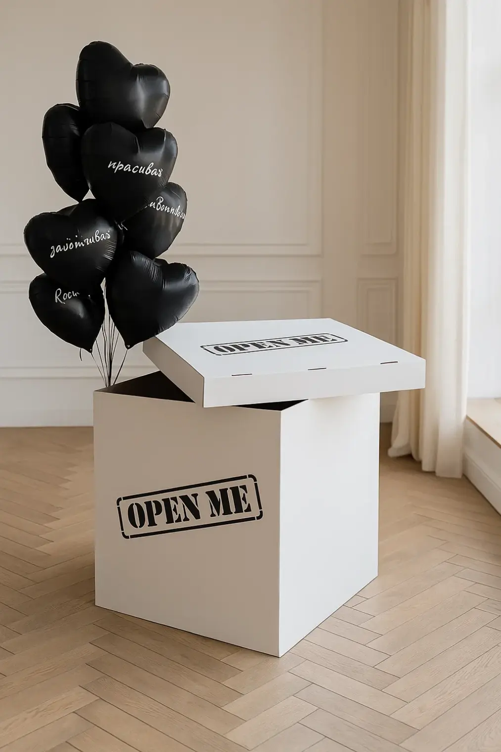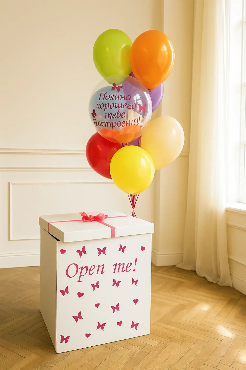В композицию входит : Коробка с вашей надписью Фонтан ( 2 фольгированных сердца +2 шара хром + 1 шар с конфетти + 1 шар баблс с перьями и вашей надписью )
