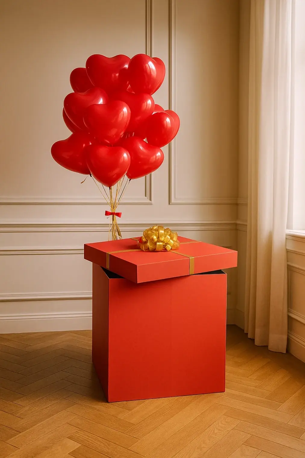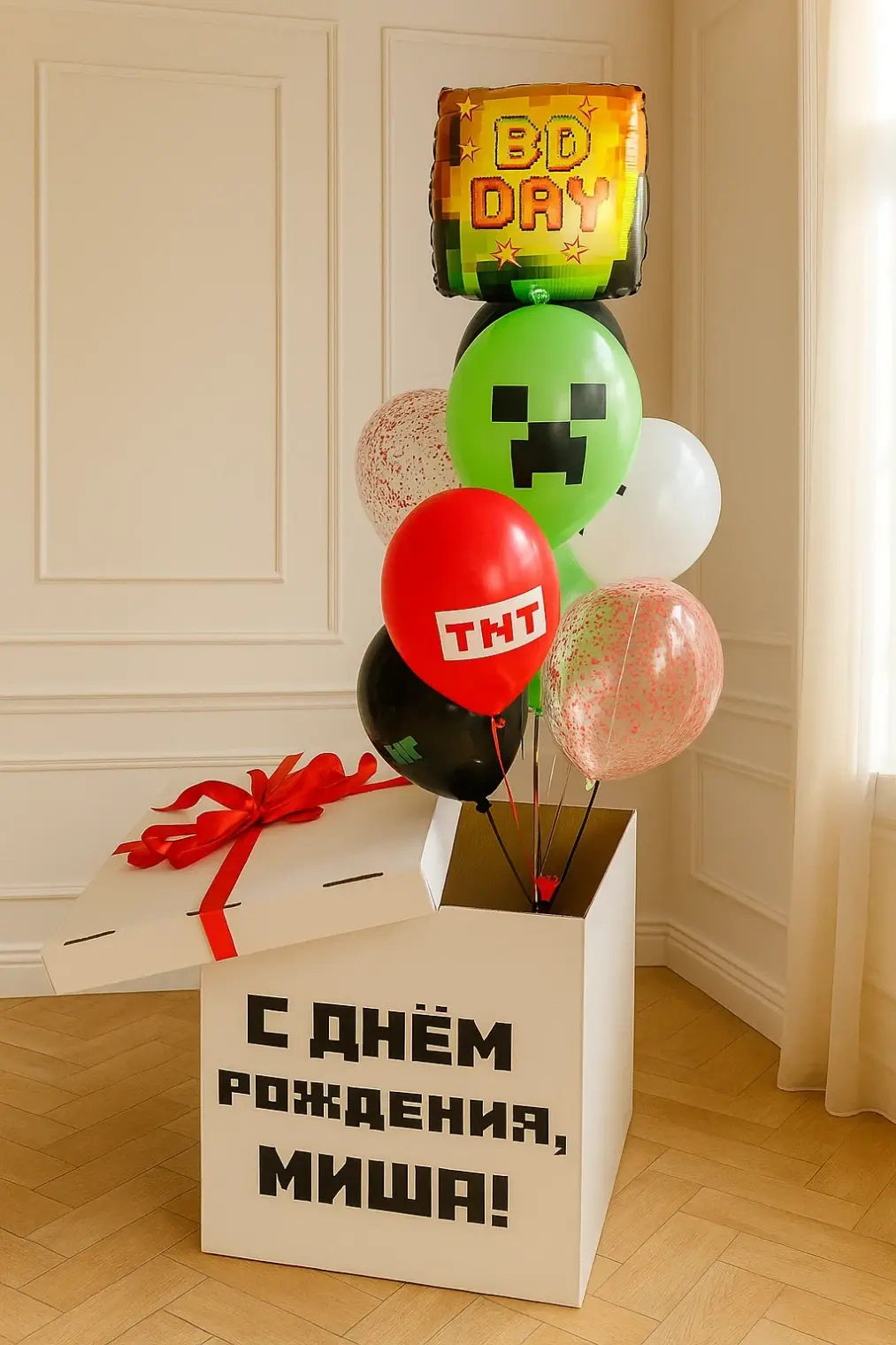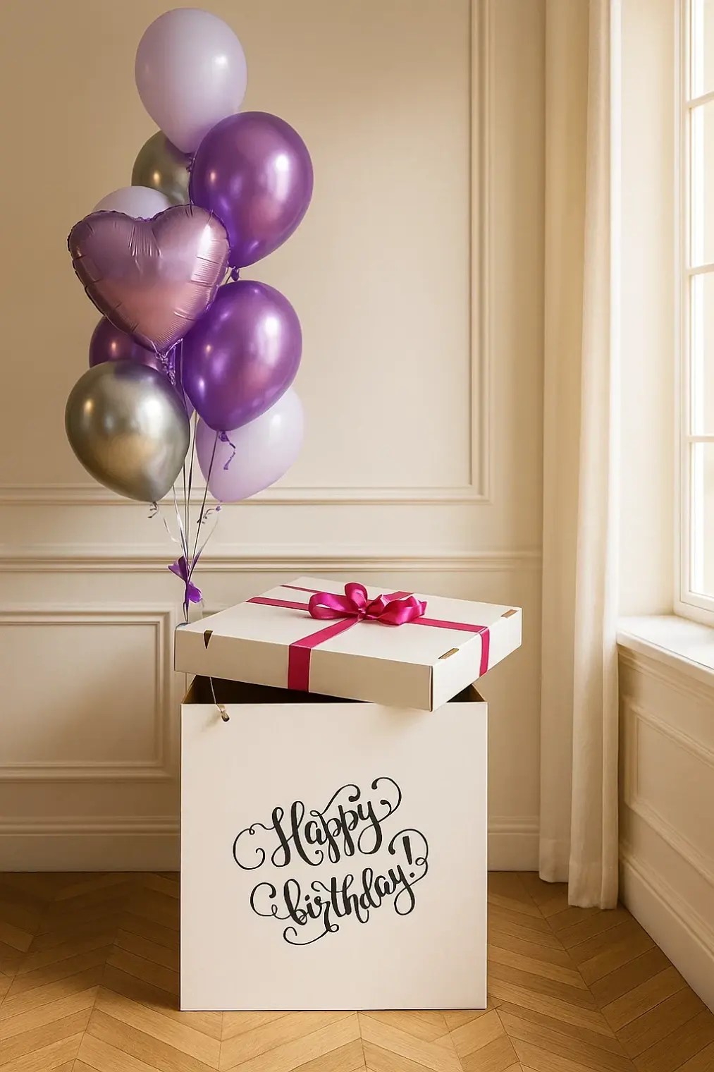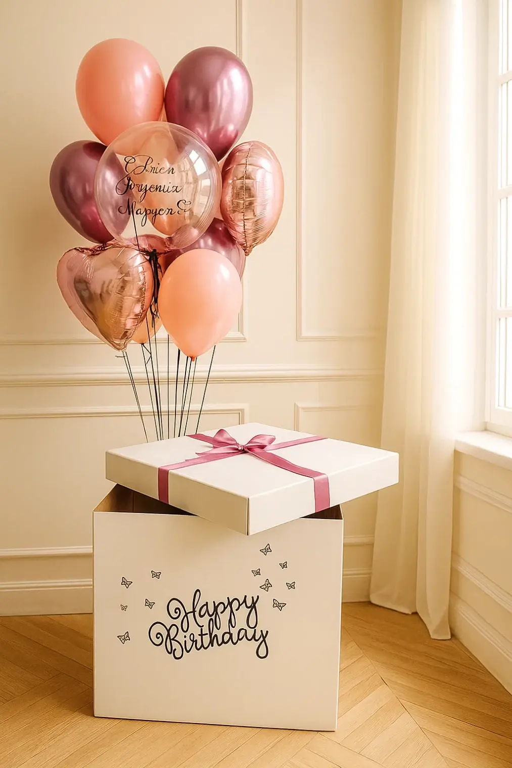 В композицию входит : Коробка с вашей надписью Фонтан ( 2 фольгированных сердца +2 шара хром + 1 шар с конфетти + 1 шар баблс с перьями и вашей надписью )
