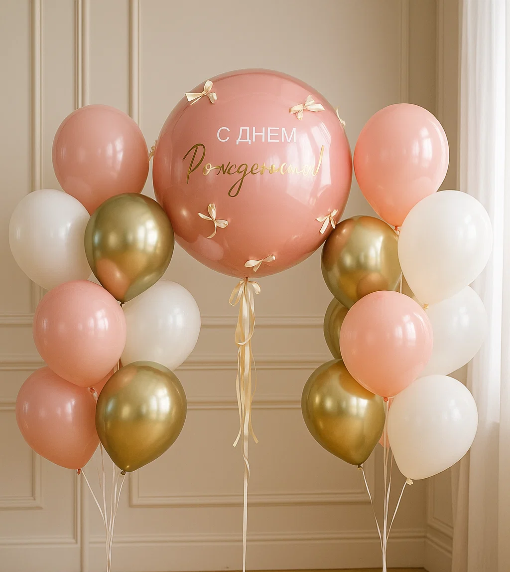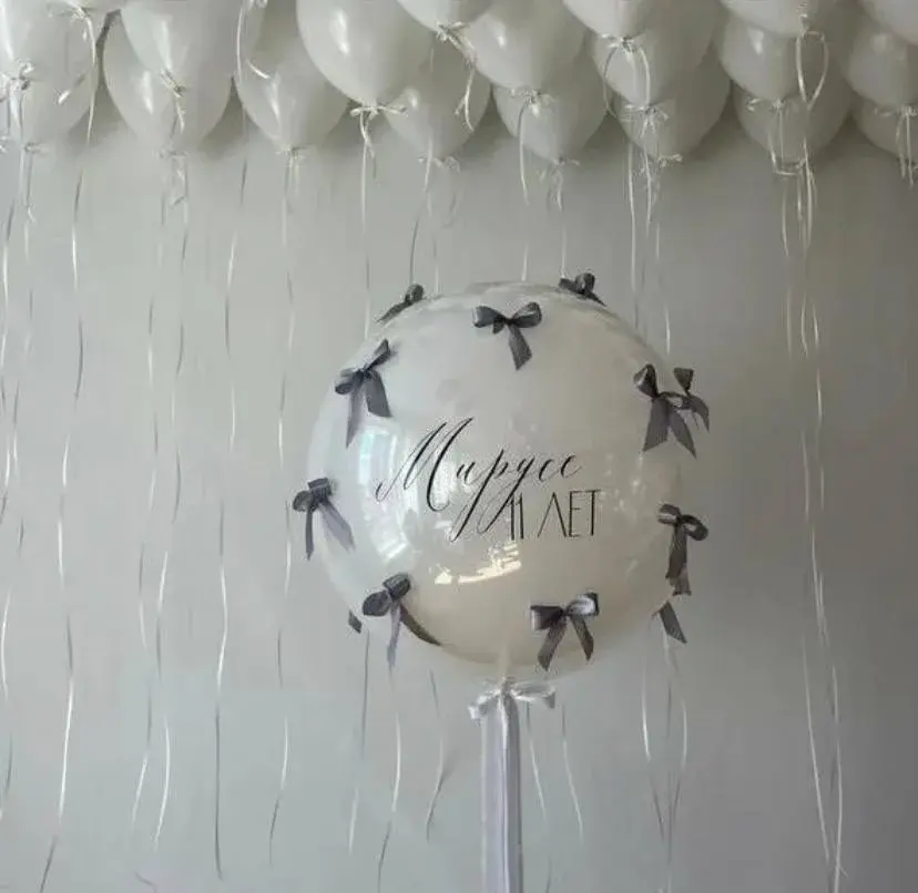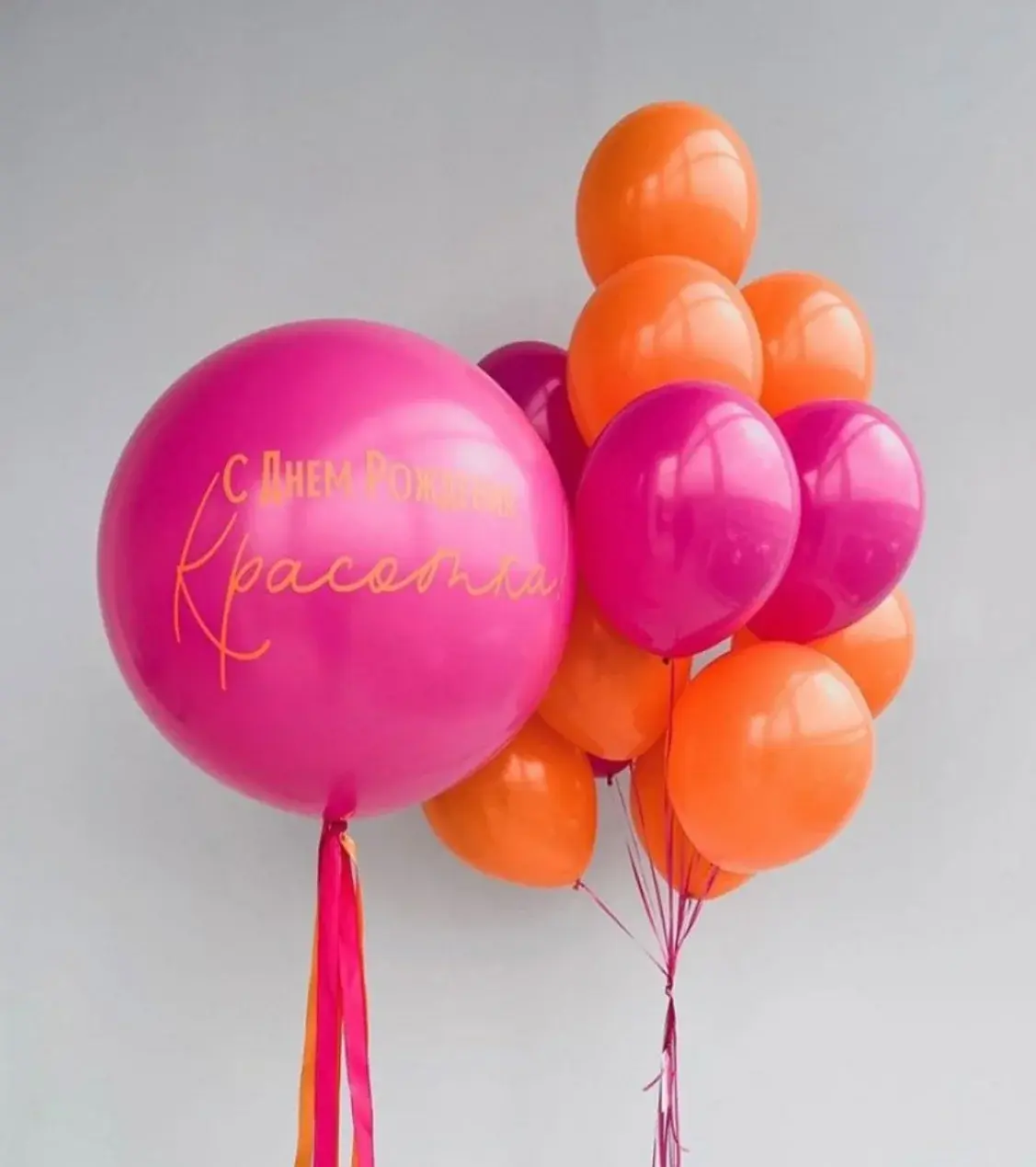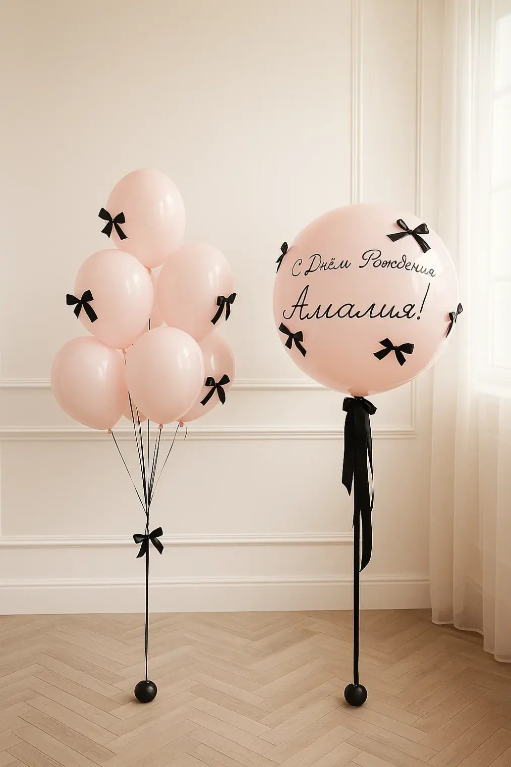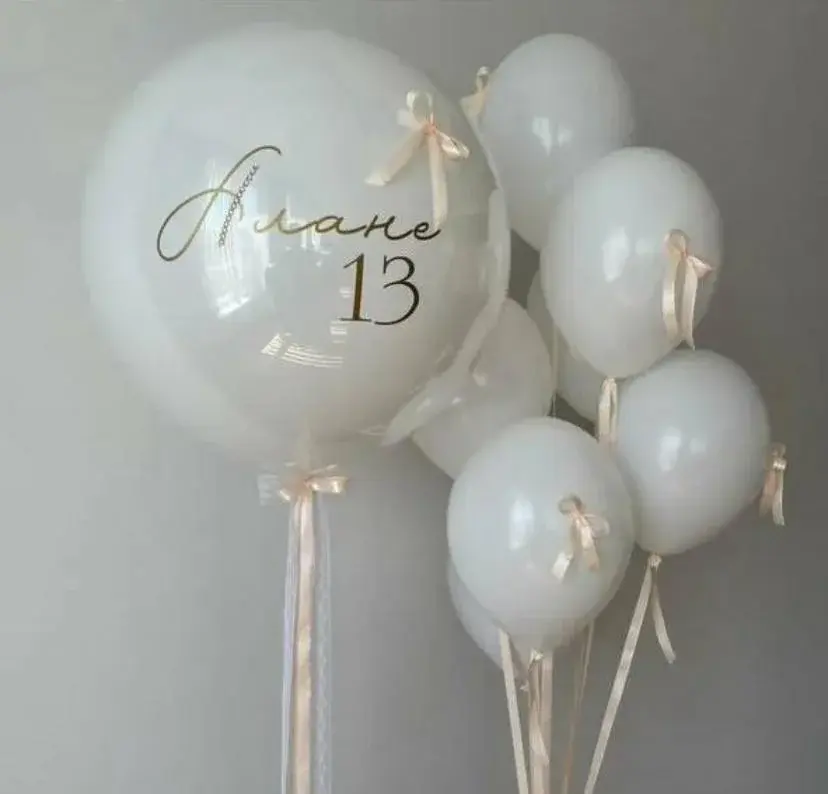 В композицию входит : Бабалс шар в шаре с вашей надписью и бантиками 15 шаров под потолок 1 грузик