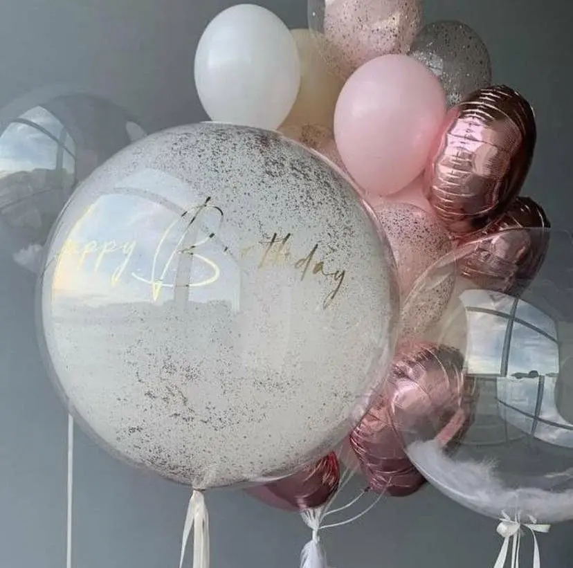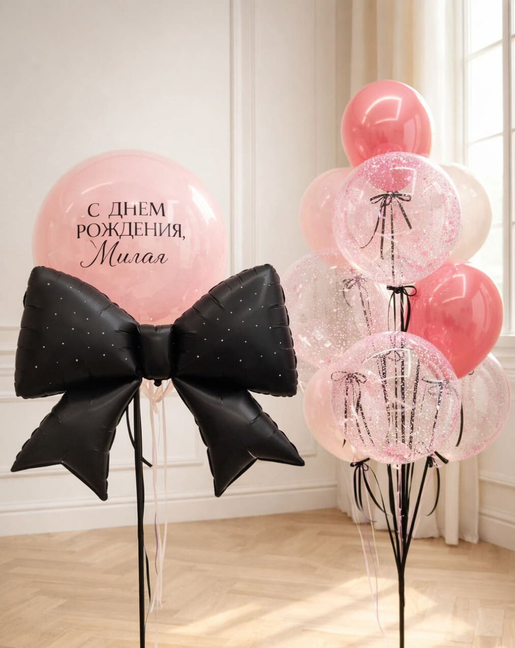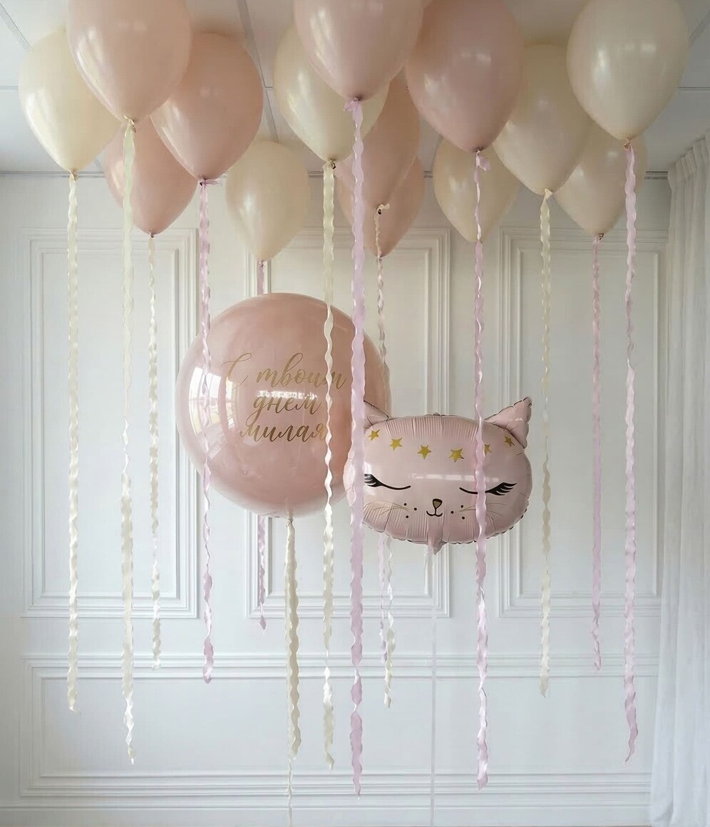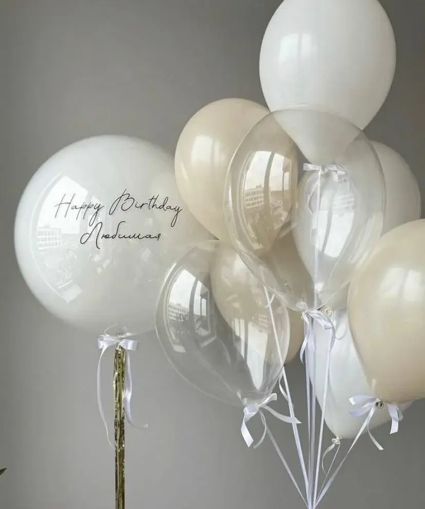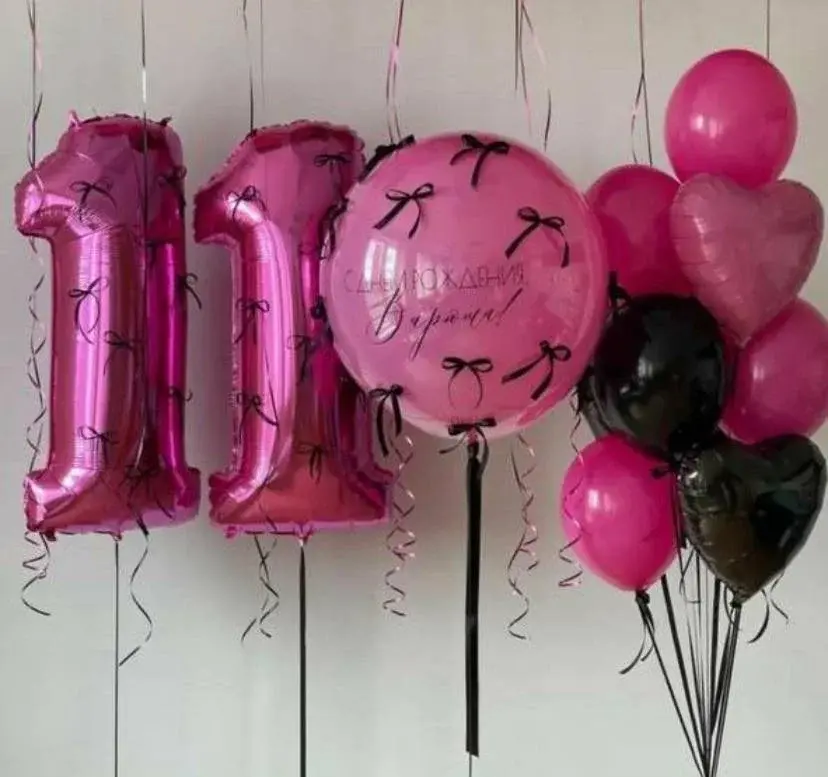 В композицию входит : Бабалс шар в шаре с вашей надписью и бантиками 15 шаров под потолок 1 грузик