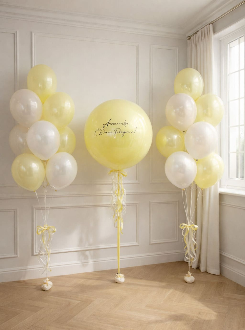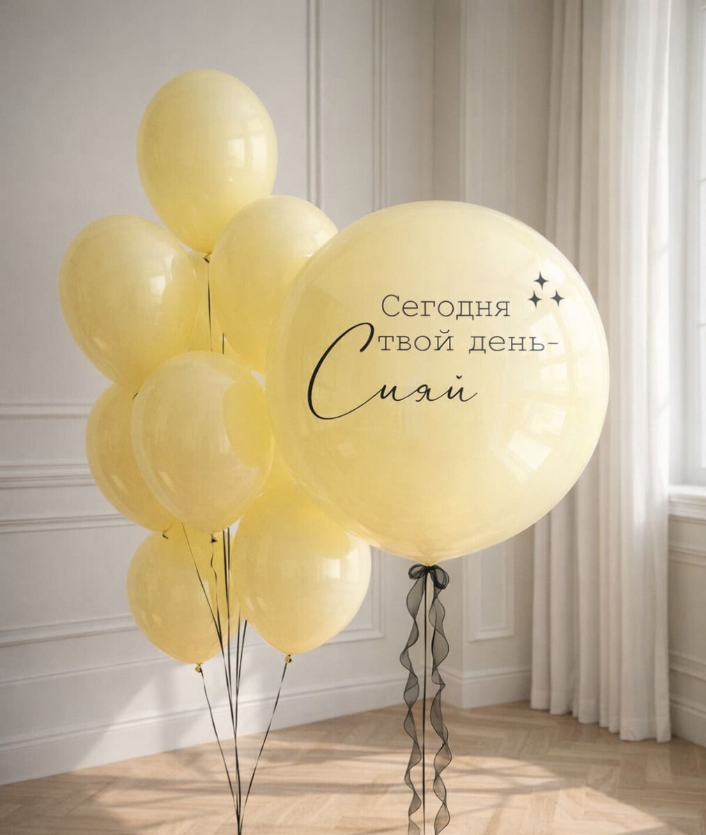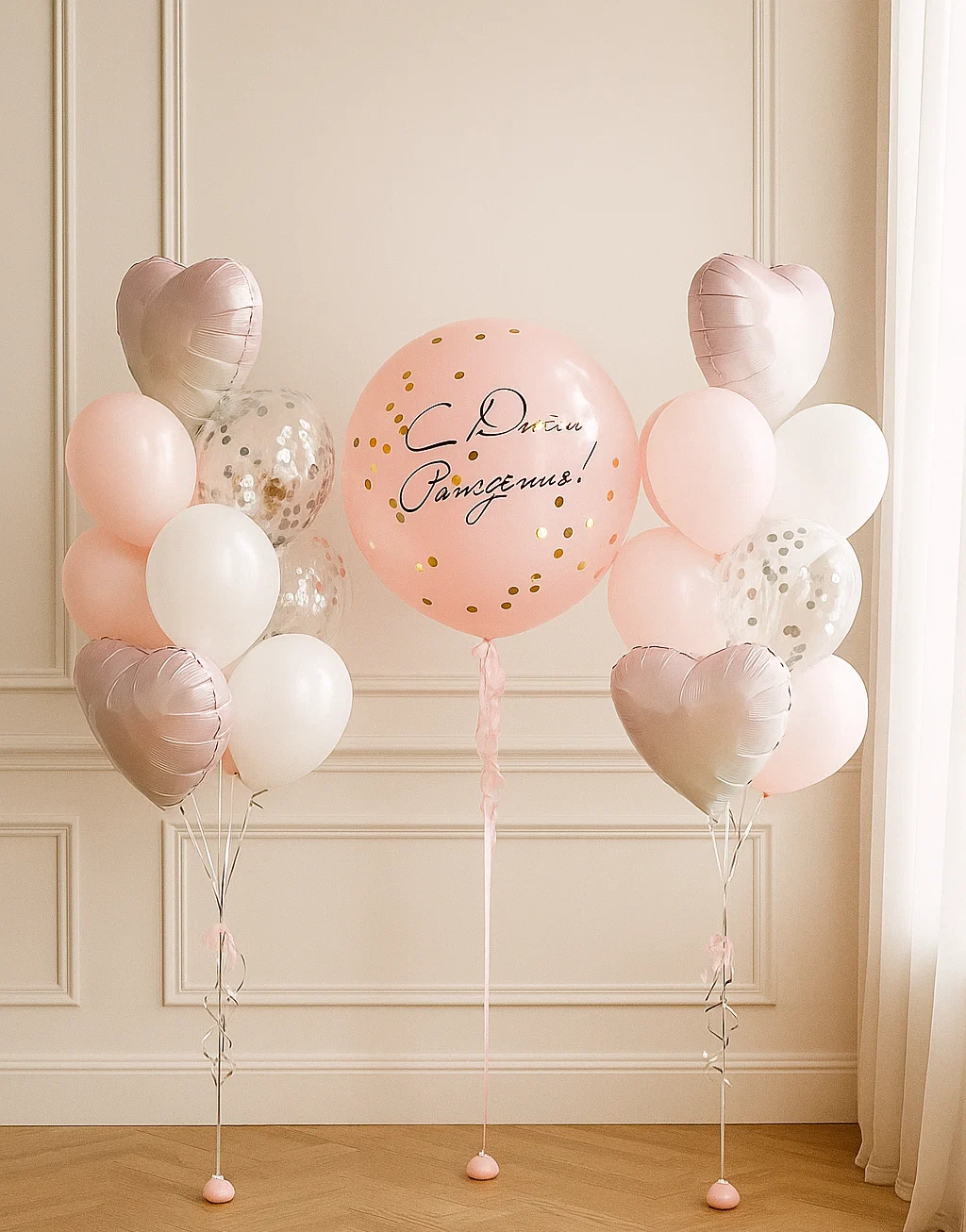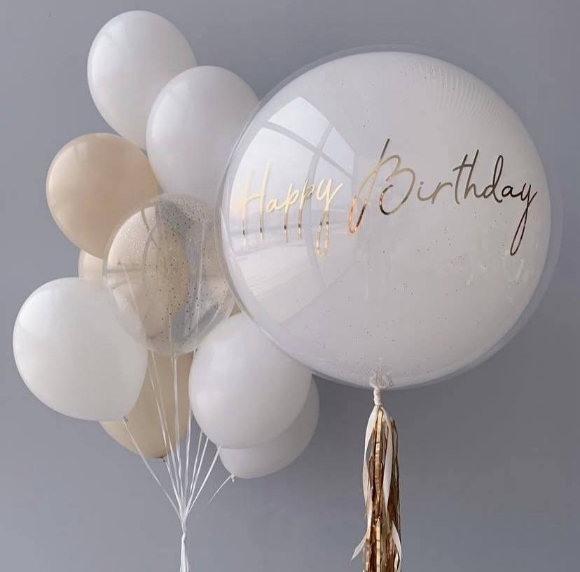 В композицию входит : Бабалс шар в шаре с вашей надписью и бантиками 15 шаров под потолок 1 грузик