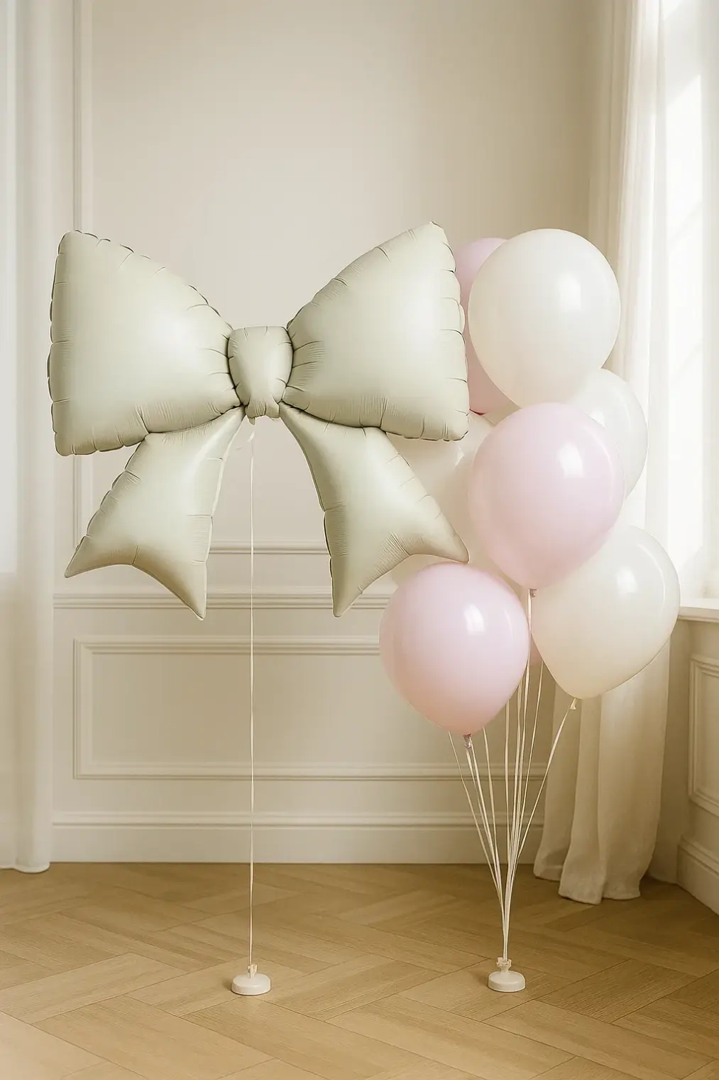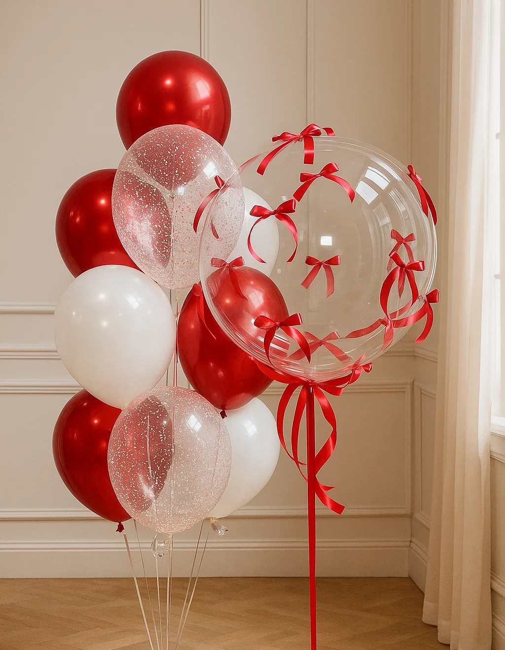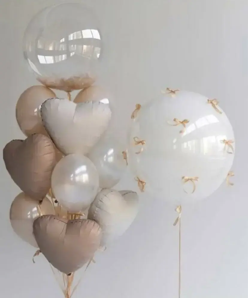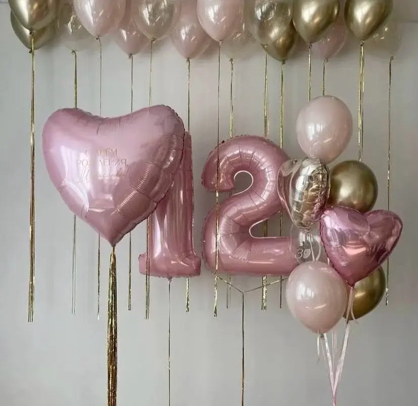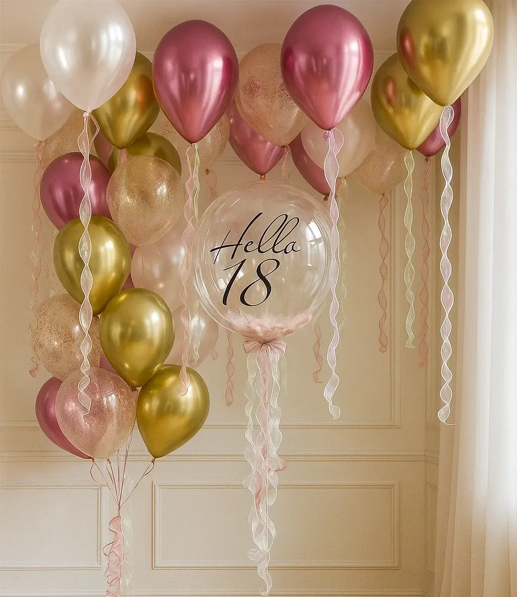 В композицию входит : Бабалс шар в шаре с вашей надписью и бантиками 15 шаров под потолок 1 грузик