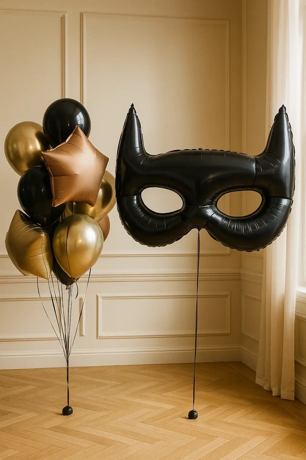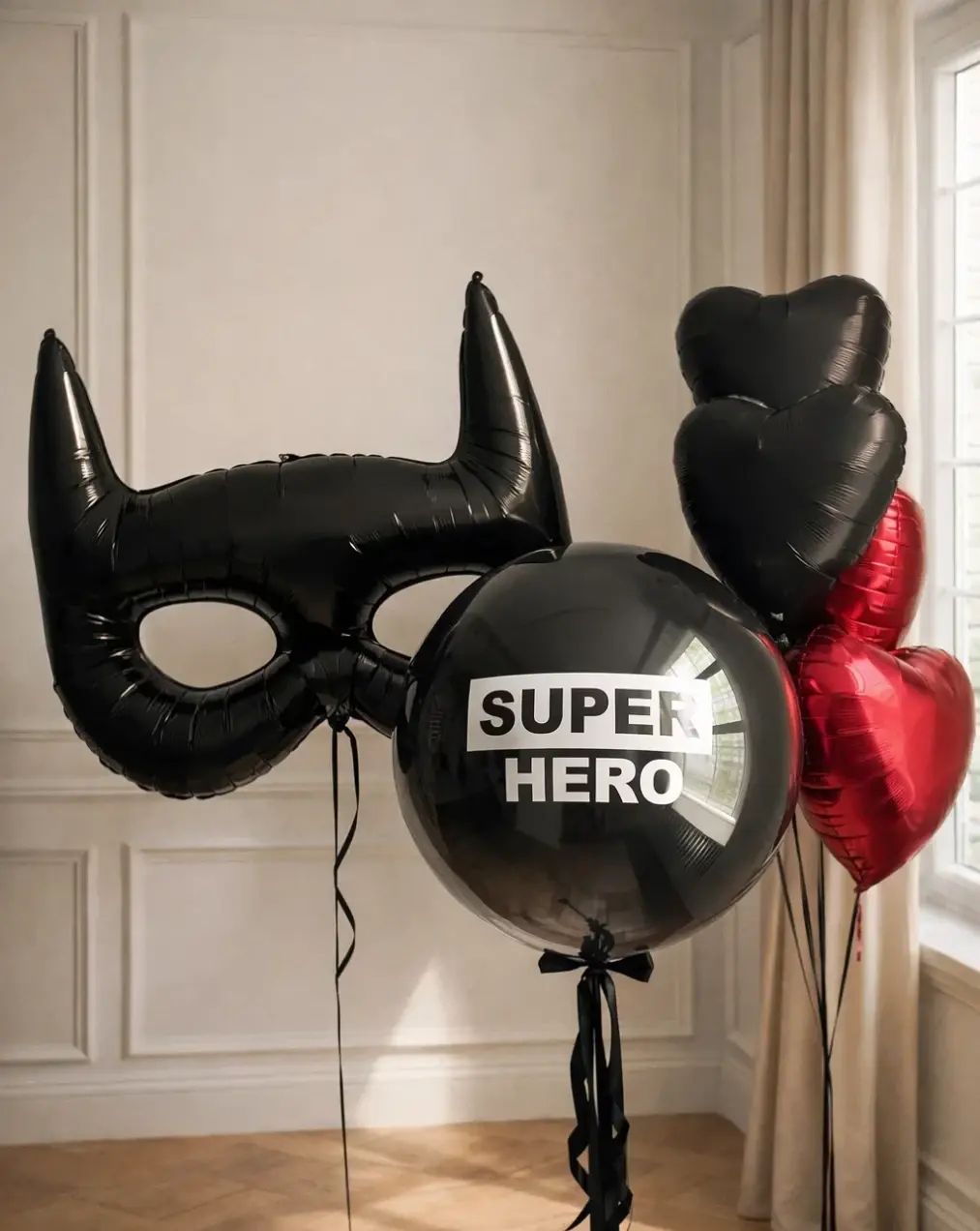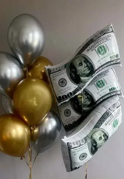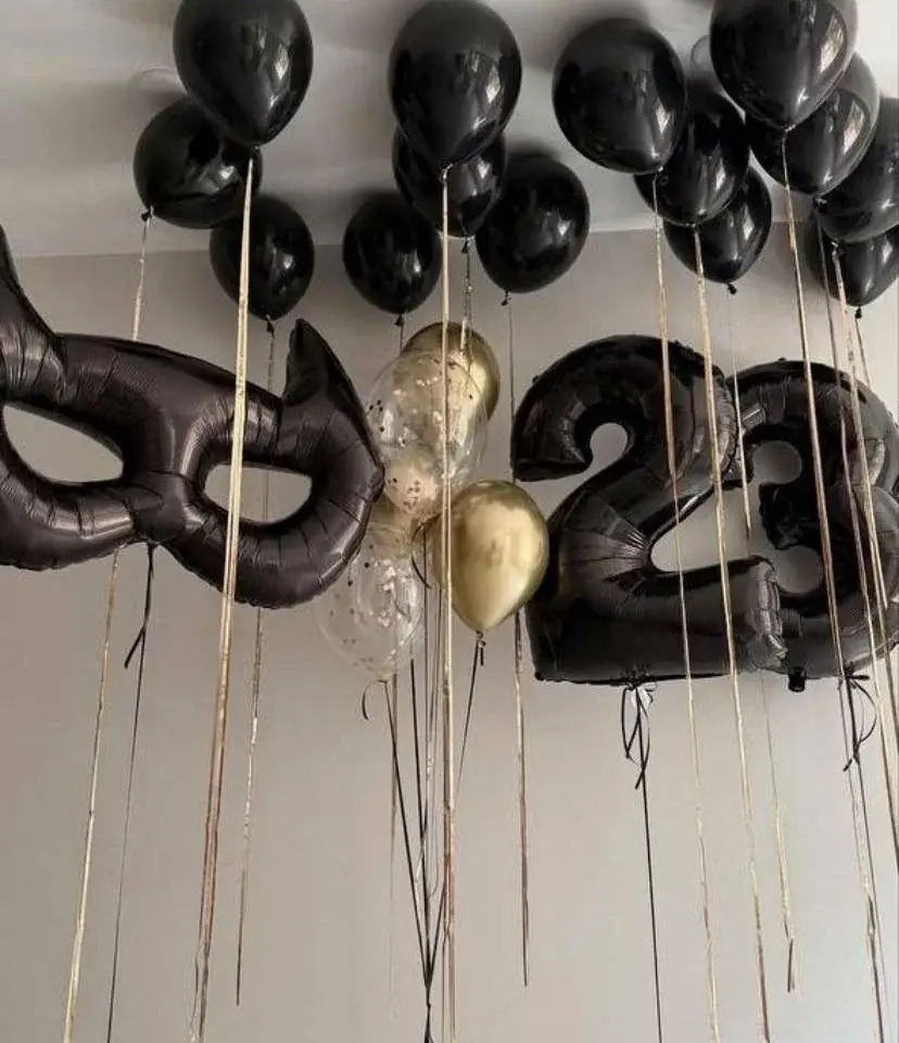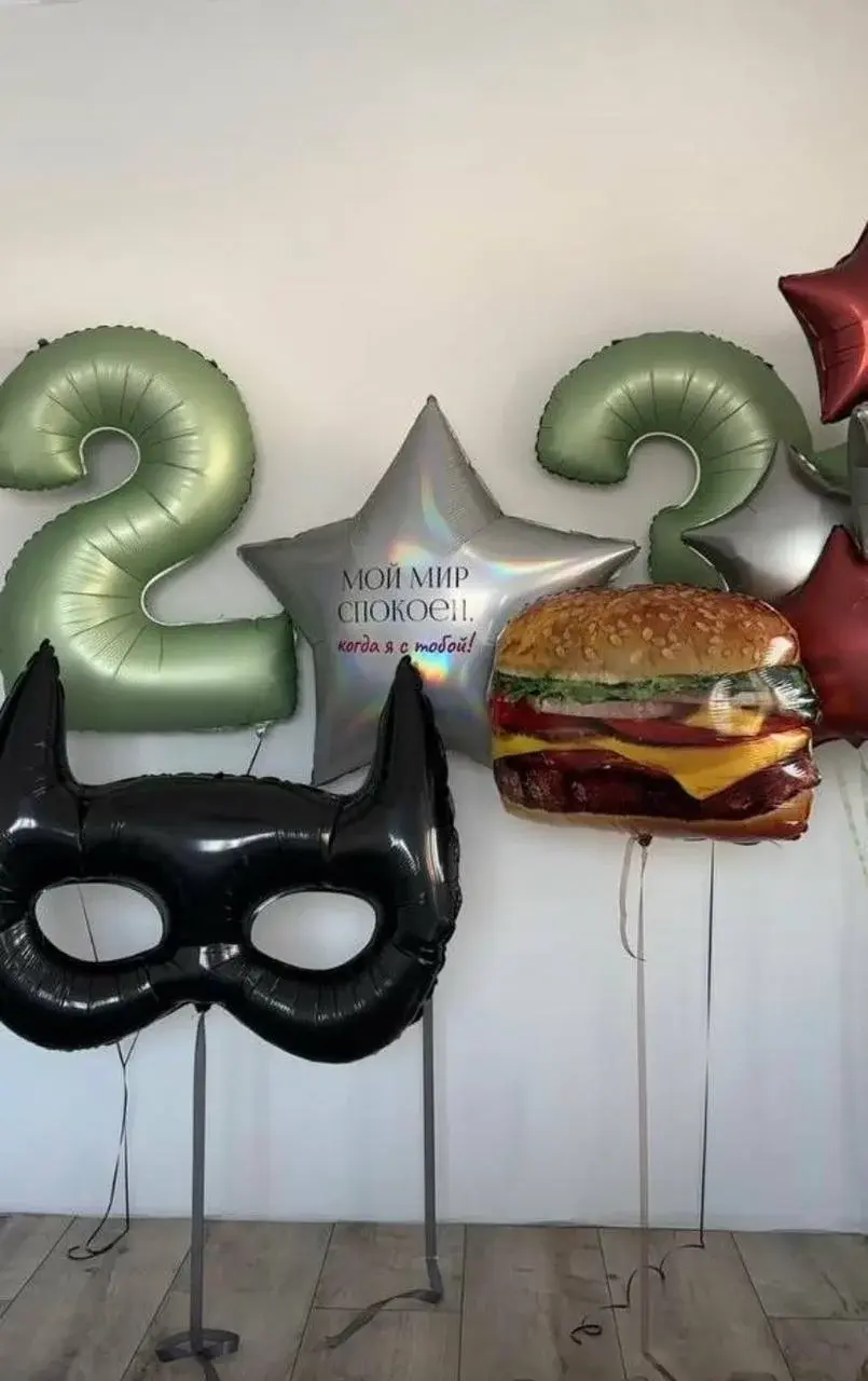 В композицию входит : Большая фольгированная звезда с вашей надписью 2 фольгированные цифры Фольгированная фигура бургер Фольгированная фигура бэтмен маска Фонтан (5 фольгированных звёзд ) 6 грузиков