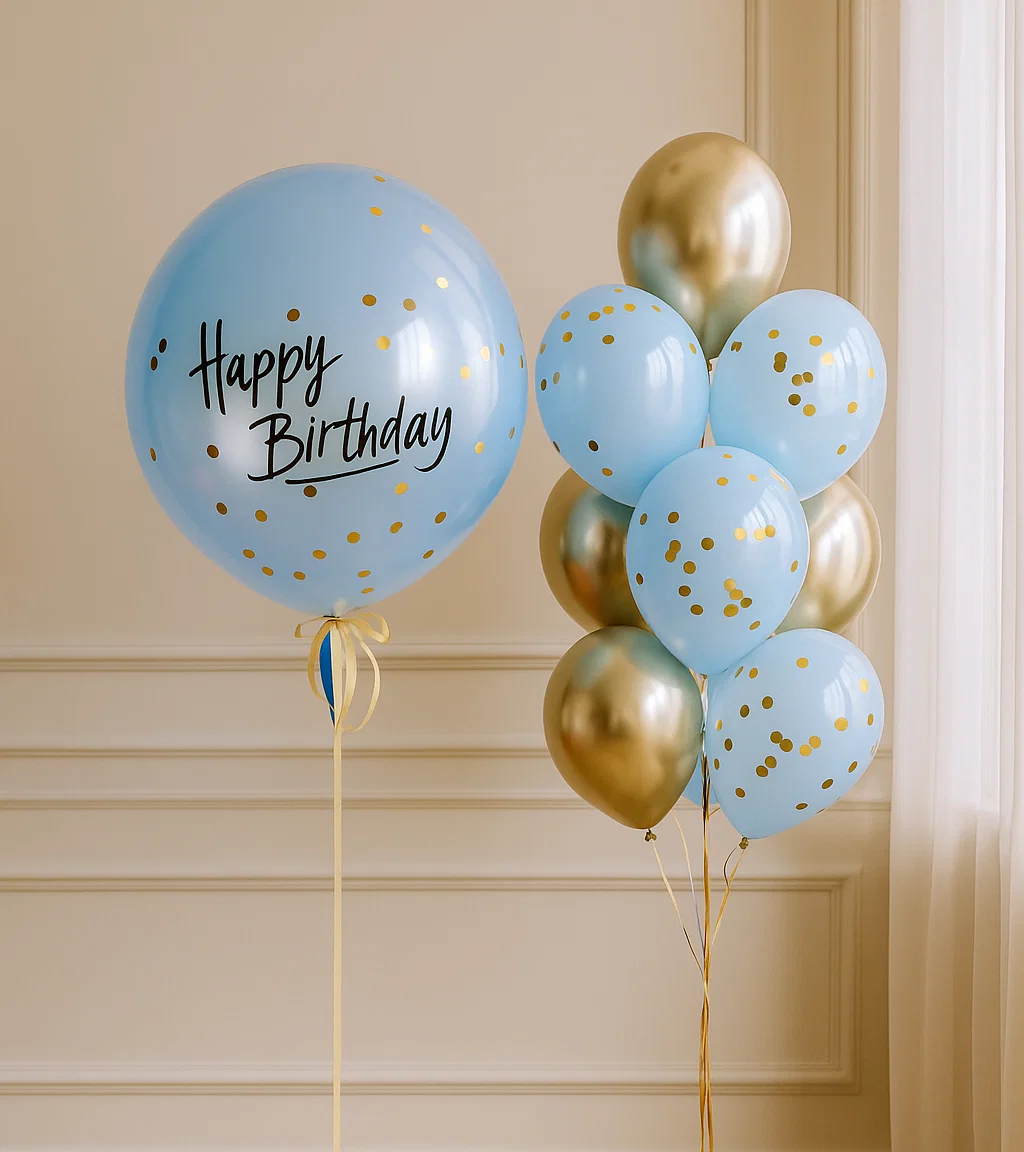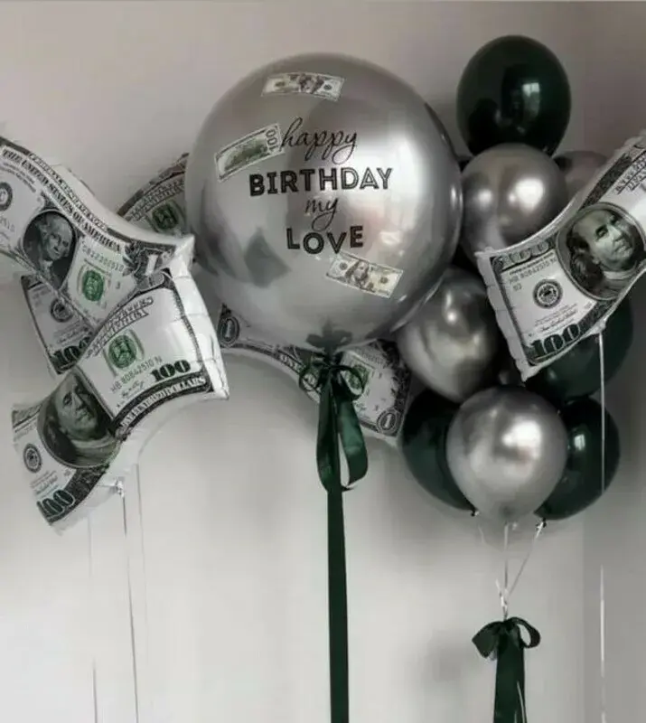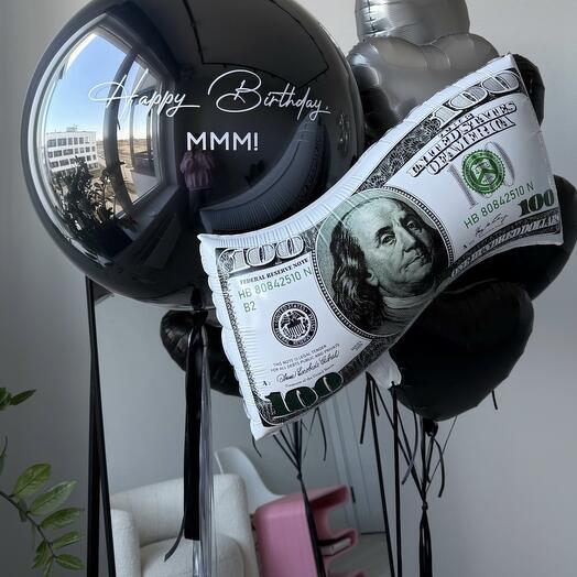 В композицию входит : Фонтан ( 4 фольгированные звезды + фольгированный круг с днем рождения + 5 шаров металлик + 4 шара конфетти + 2 шара хром ) 1 грузик