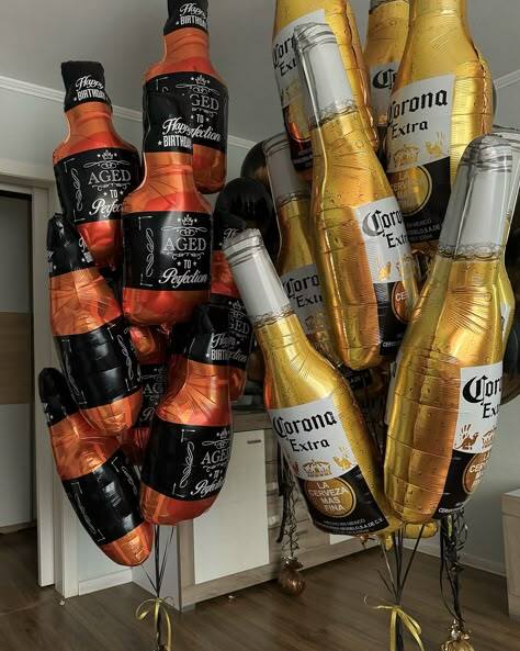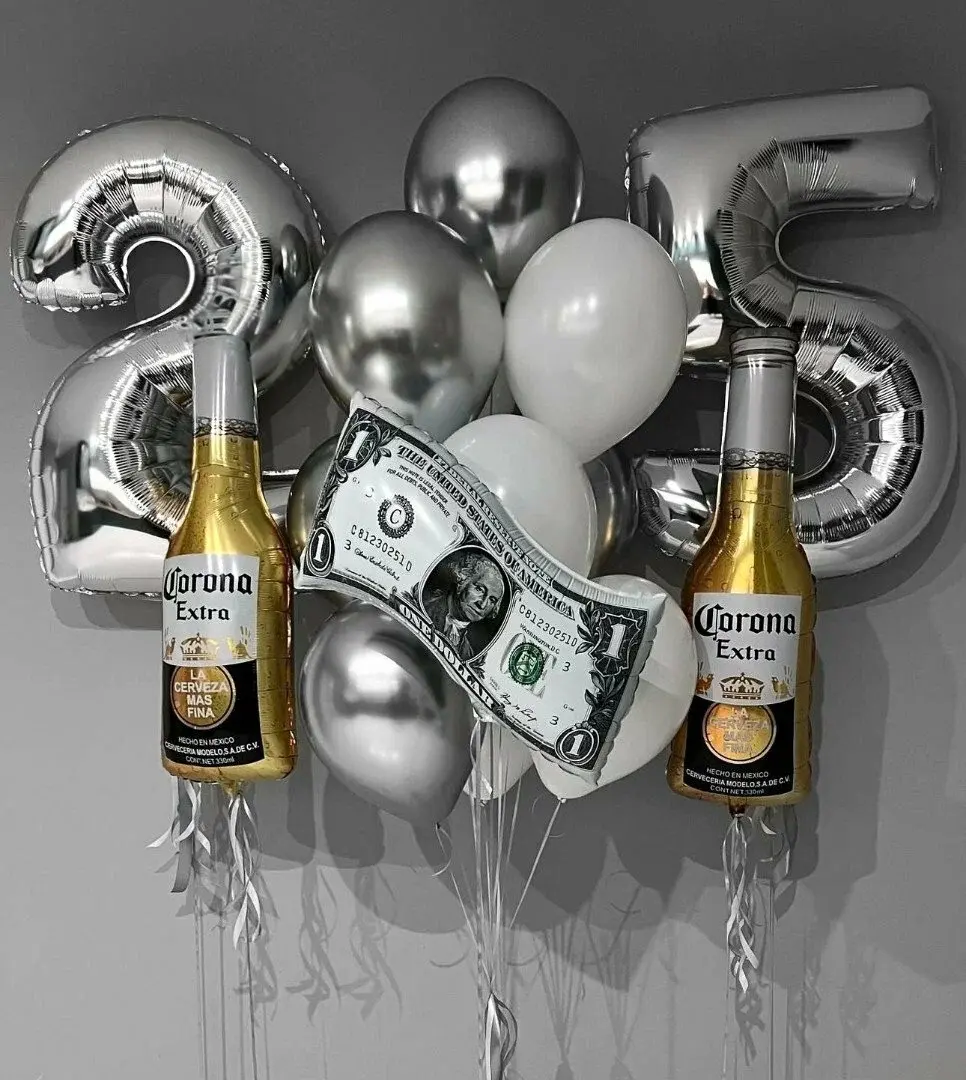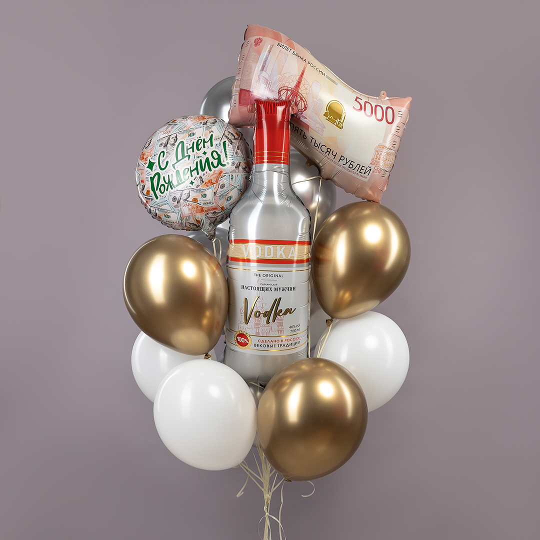 В композицию входит : Фонтан ( 3 фольгированные звезды с вашей надписью + 2 фольгированных сердца с вашей надписью + 3 шара с рисунком + 8 шаров хром + шар гигант с вашей надписью + фольгированная фигура бутылка виски ) Фонтан ( 2 фольгированные звезды с вашей надписью + 3 шара с рисунком + 8 шарорв хром + большая фольгированная звезда с вашей надписью + фольгированная фигура бутылка виски ) 2 грузика