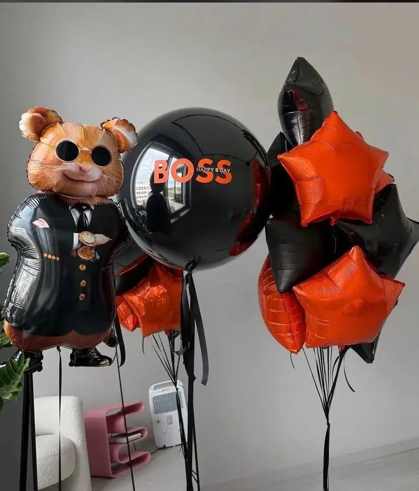 В композицию входит : Баблс шар в шаре с вашей надписью Фольгированная фигура хомяк Фонтан ( 10 фольгированных звёзд) 2 Фольгированные звезды на грузике 5 грузиков