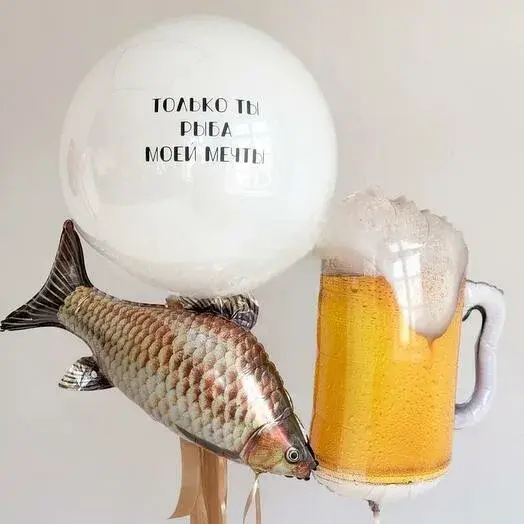 В композицию входит : Бабосики шар в шаре с вашей надписью 2 фольгированные фигуры рыба Фонтан ( фольгированая фигура, 5 шаров пастель, 4 шара хром) 4 грузика