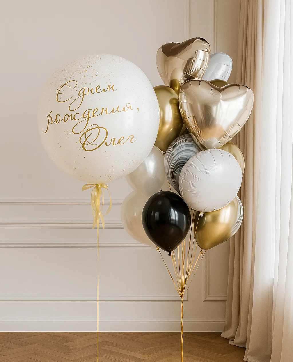 В композицию входит : 3 фонтана ( по 2 фольгированных сердца + 2 фольгированные звёзды + 4 шара с рисунком + 7 шаров хром ) Шар гигант с вашей надписью 4 грузика