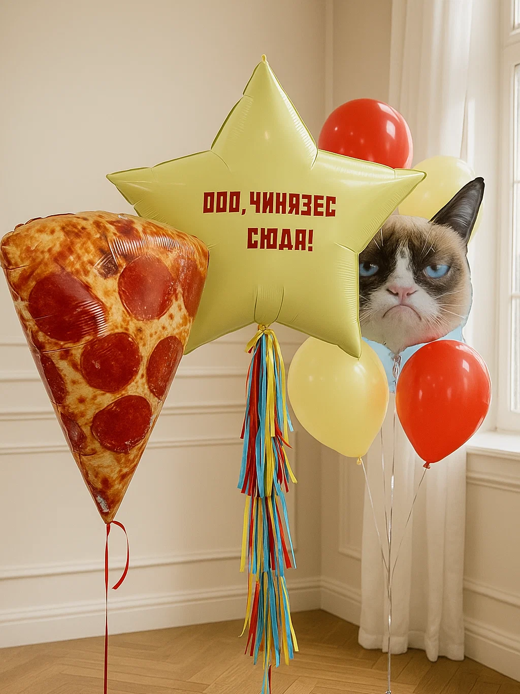 В композицию входит : Большая фольгированая звезда с вашей надписью Фольгированная фигура кусок пиццы Фонтан ( фольгированная фигура гола кошки, 6 шаров пастель ) 3 грузика
