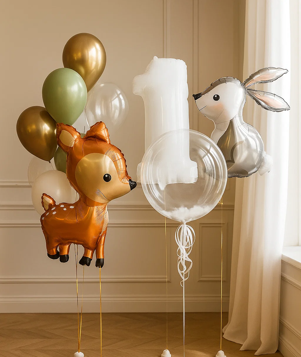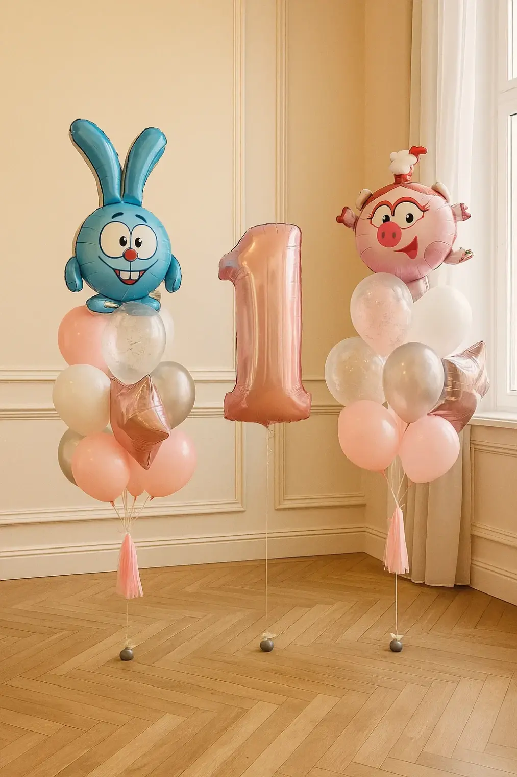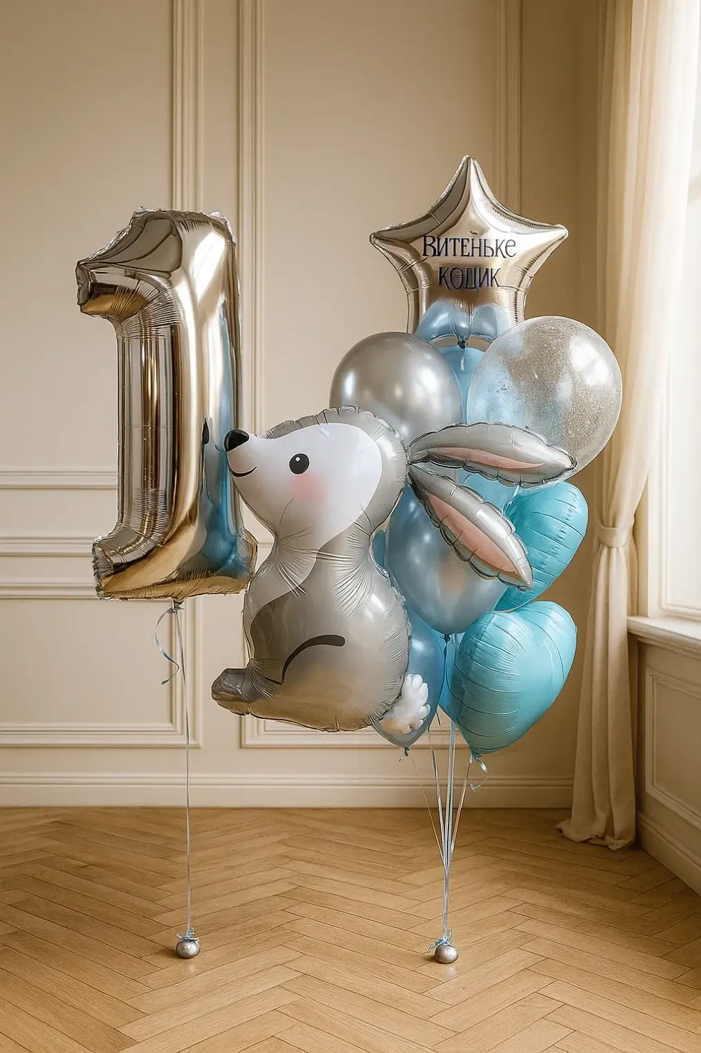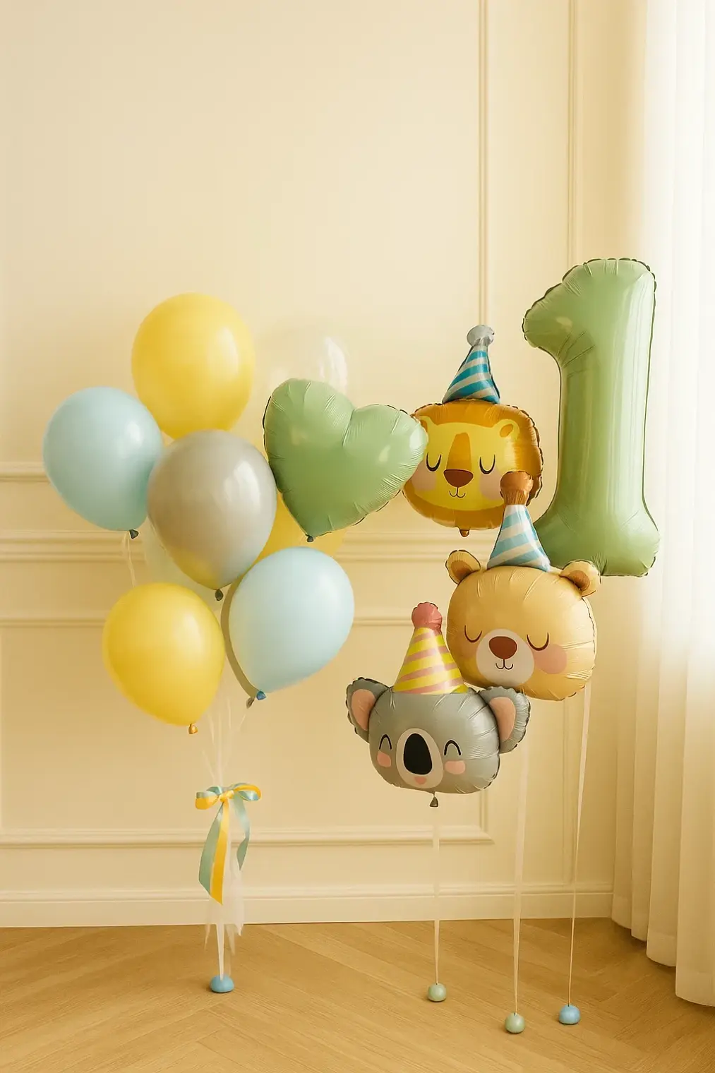 В композицию входит : Фольгированная цифра Фольгированная голова львенка Фольгирлванная голова мишка Фольгированная голова коалы Фонтан ( фольгированное сердце, 9 шаров макарунс ) 5 грузиков