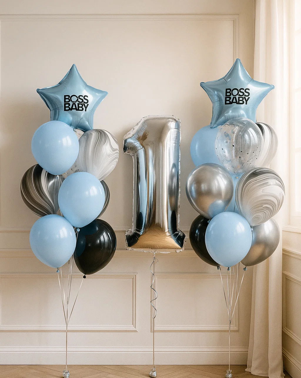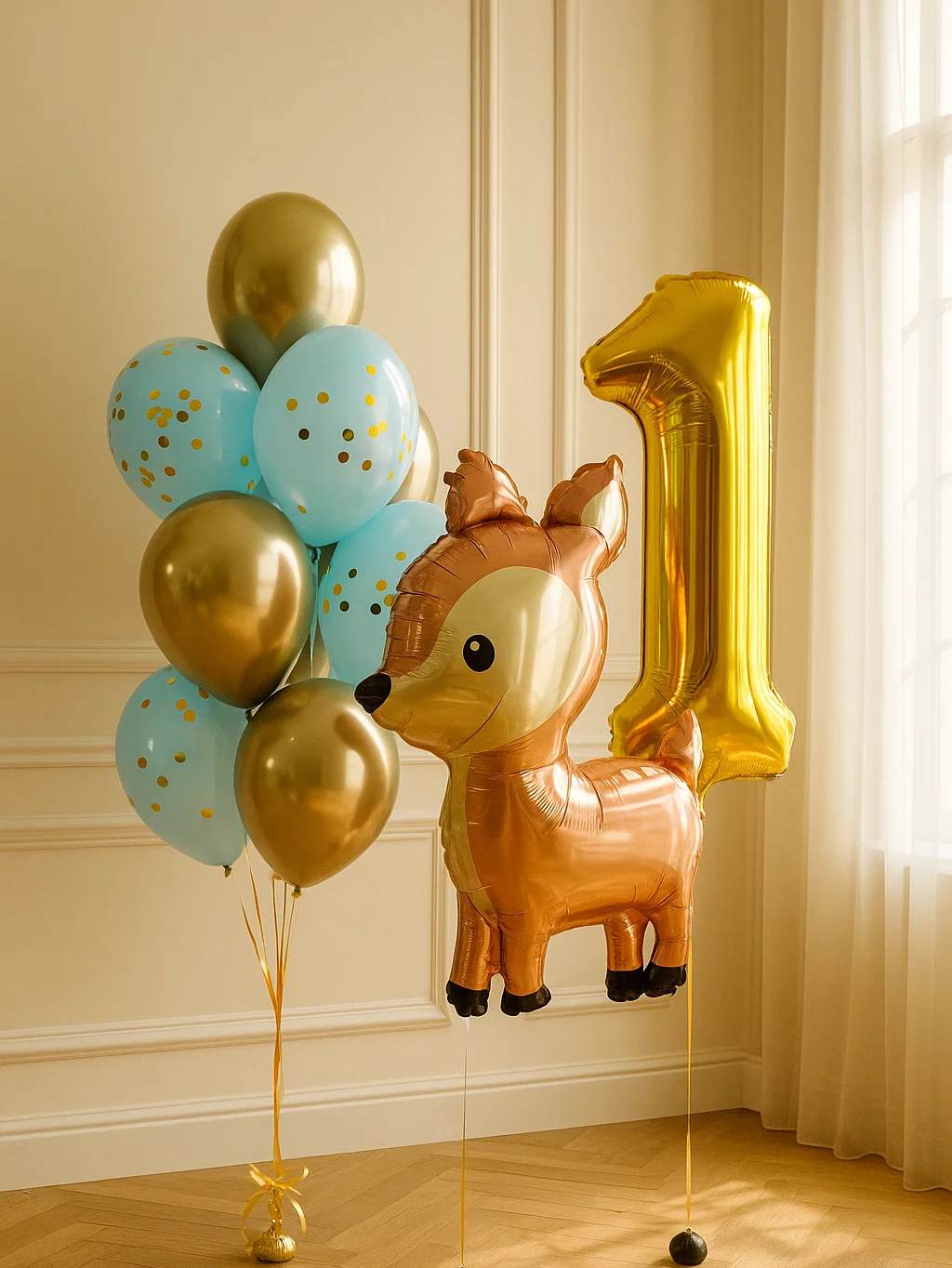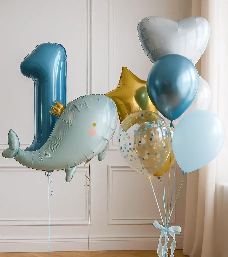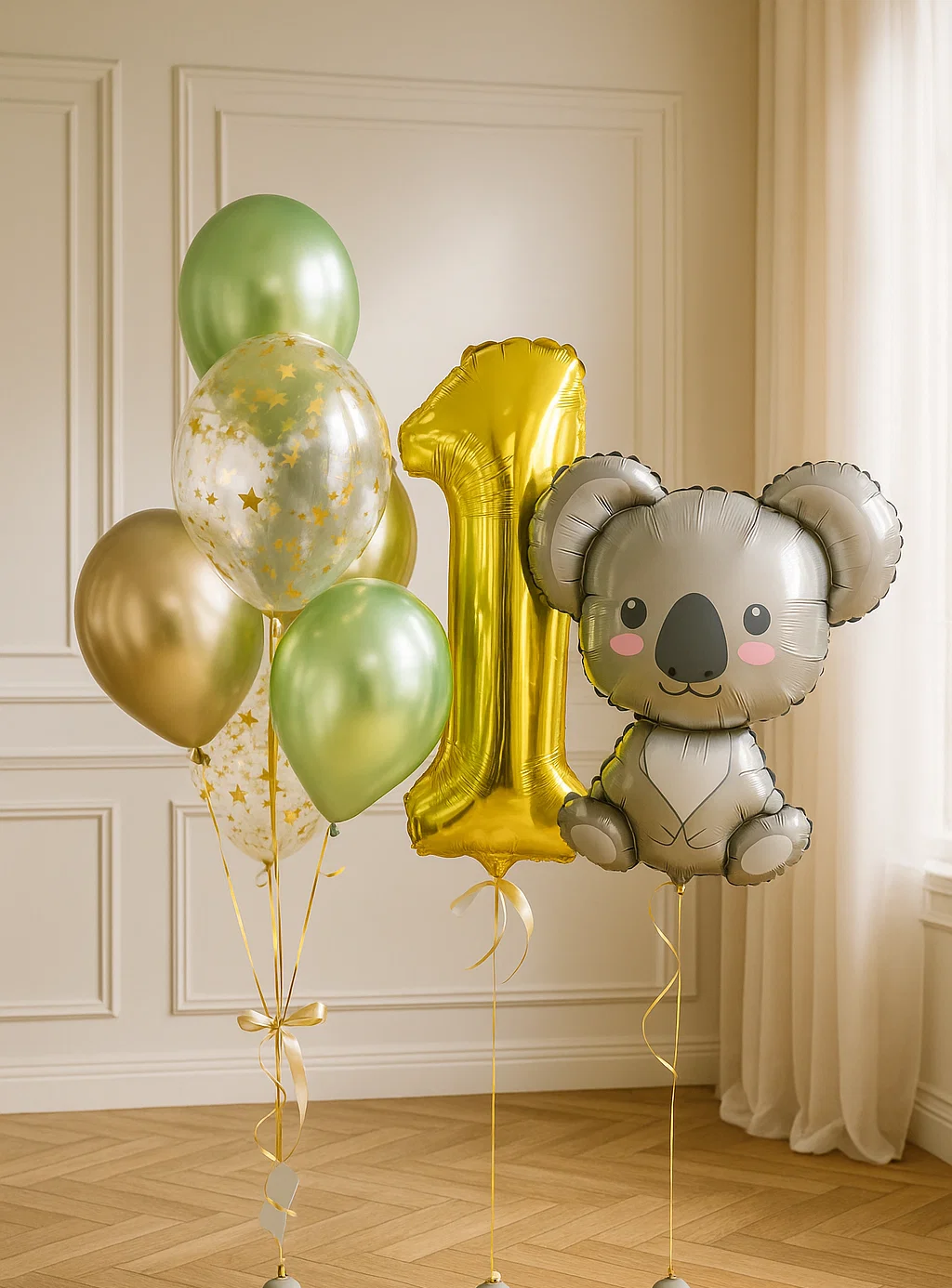 В композицию входит : Фольгированная цифра Фольгированная голова львенка Фольгирлванная голова мишка Фольгированная голова коалы Фонтан ( фольгированное сердце, 9 шаров макарунс ) 5 грузиков