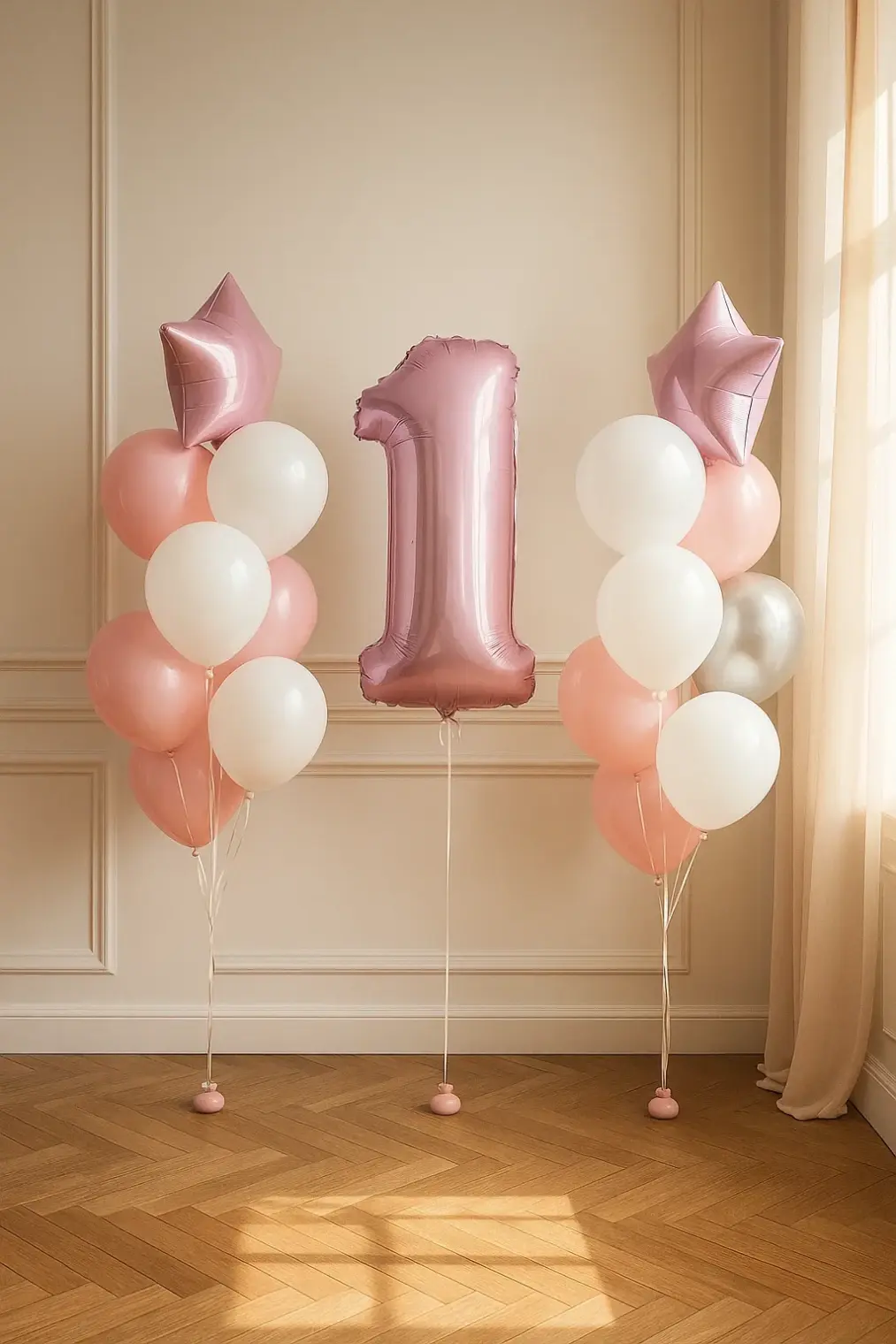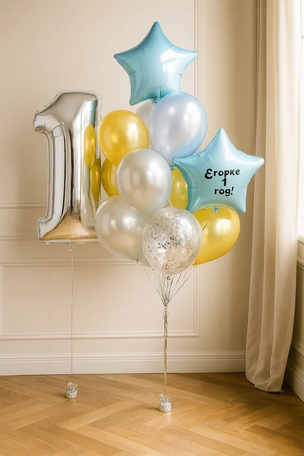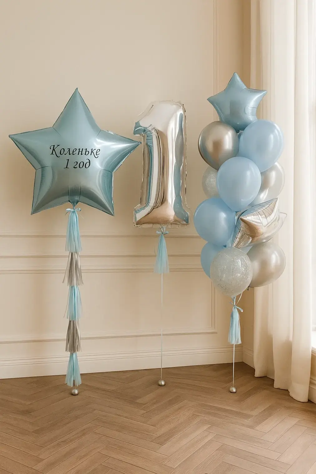 В композицию входит : Фольгированная цифра Большая фольгированная звезда с вашей надписью на тассл Фонтан ( 2 фольгировпнные звезды , 2 с конфетти, 3 шара хром, 6 шаров пастель ) 3 грузика