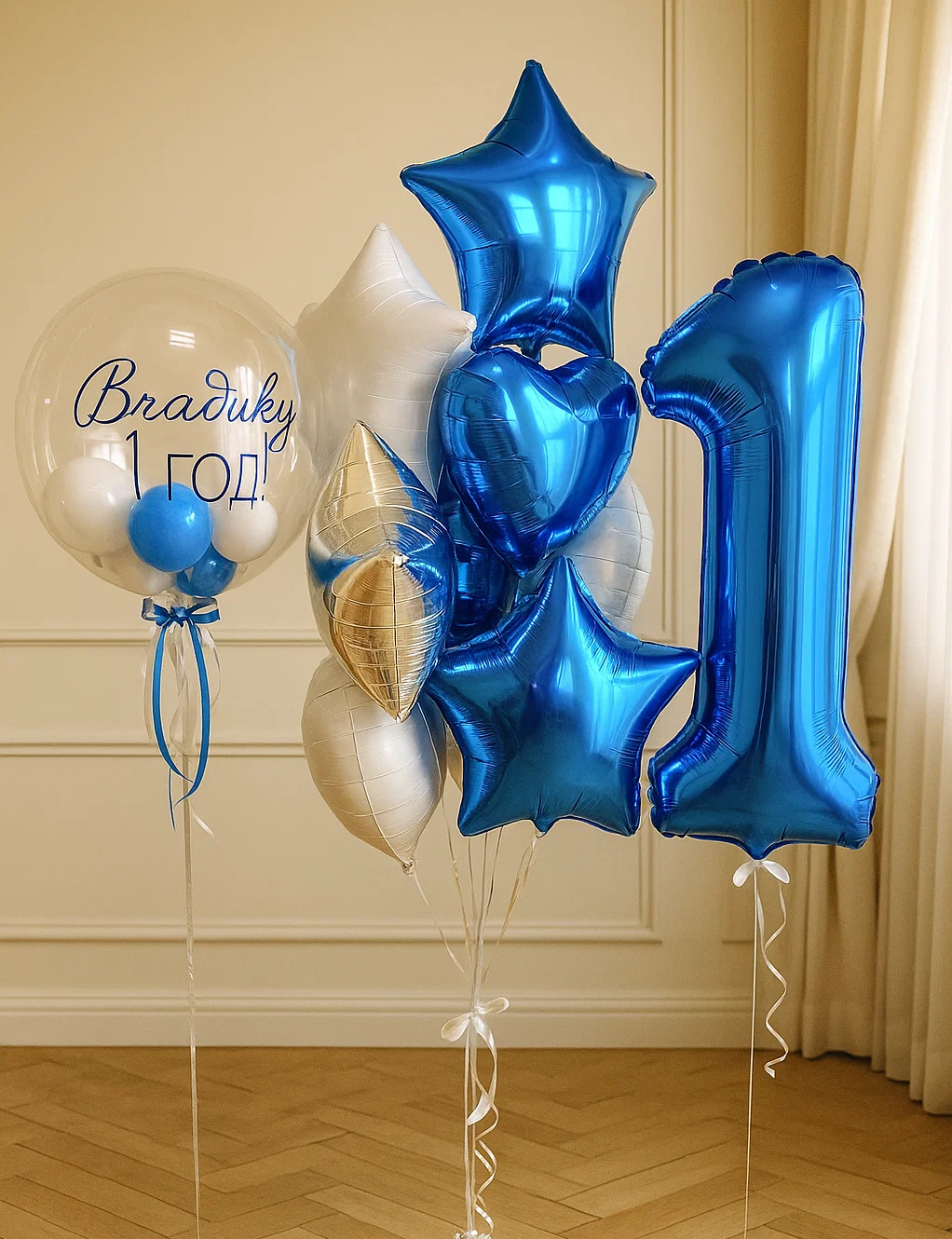 В композицию входит : 2 фонтана ( по 2 фольгированные звезды + 2 шара с конфетти + 6 шаров постель ) Шар баблс с перьями и вашей надписью Цифра 4 грузика