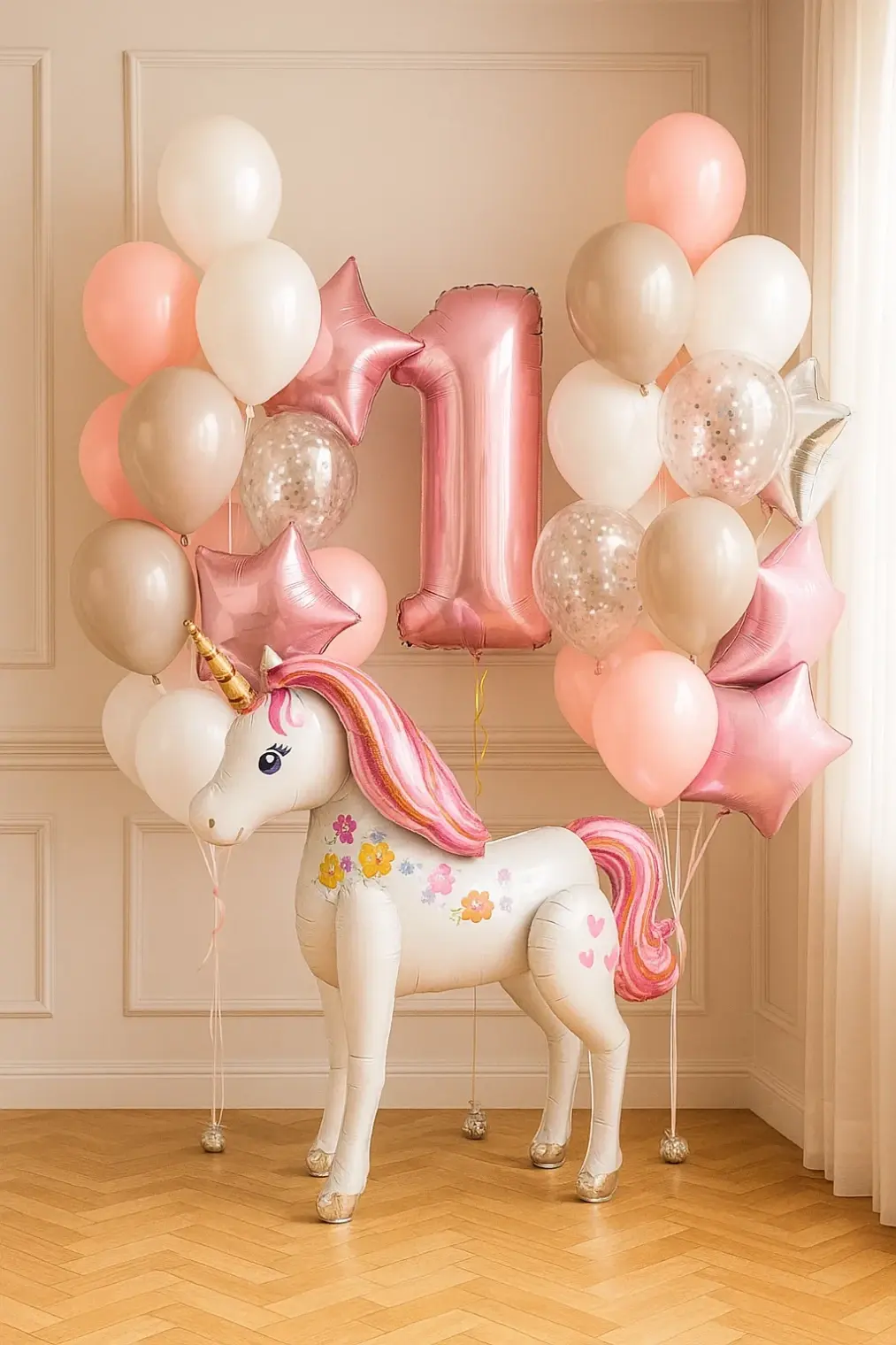 В композицию входит : 2 фонтана ( по 2 фольгированных круга с рисунком + 3 фольгированных сердца + 3 фольгированные звёзды + 3 шара с конфетти + 8 шаров постель ) Шар баблс с перьями и вашей надписью Фольгированная фигура голова единорога Фольгированная фигура Пинки пай Фольгированный единорог Цифра 7 грузиков