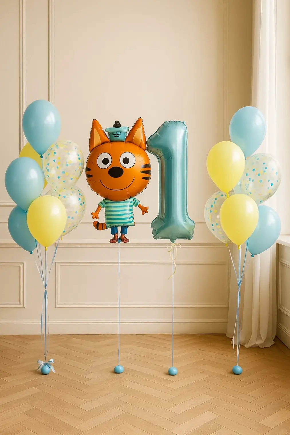 В композицию входит : Фонтан ( фольгированный круг с рисунком + 2 шара с конфетти + 2 шара постель + 1 шар хром + фольгированная фигура голова кота ) Цифра 2 грузика