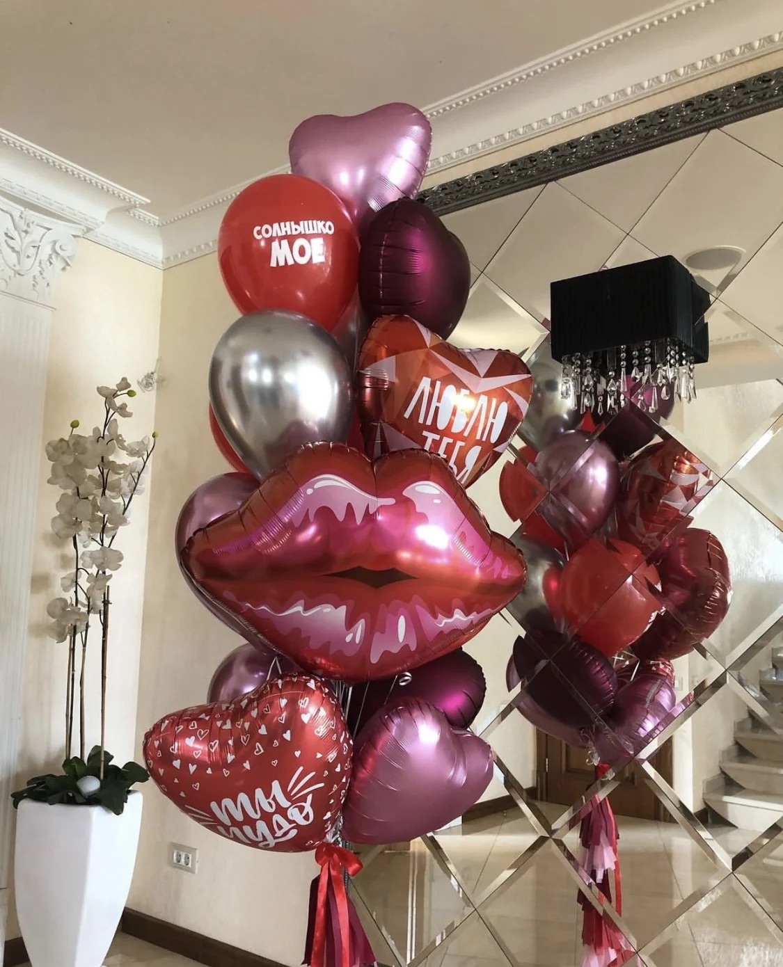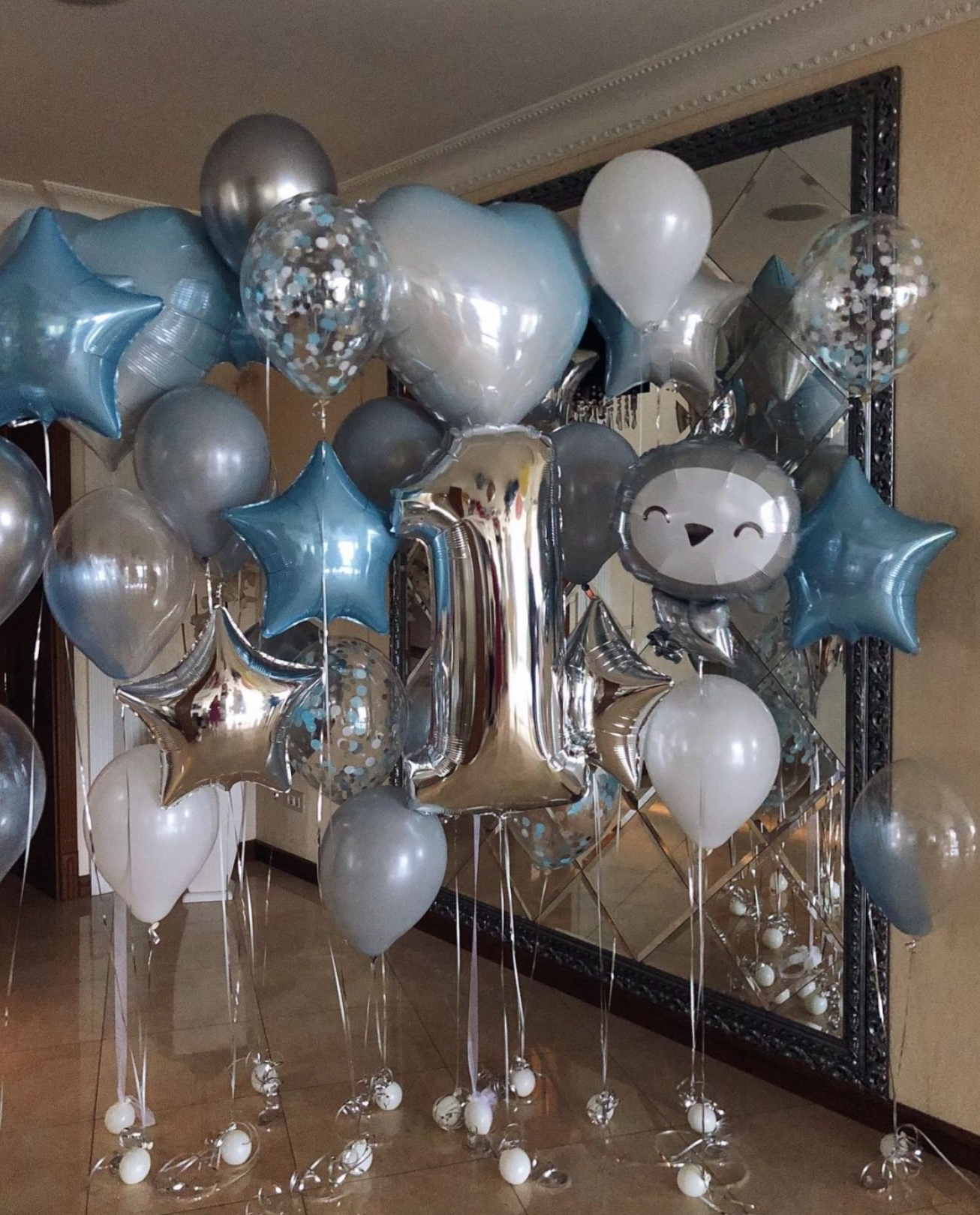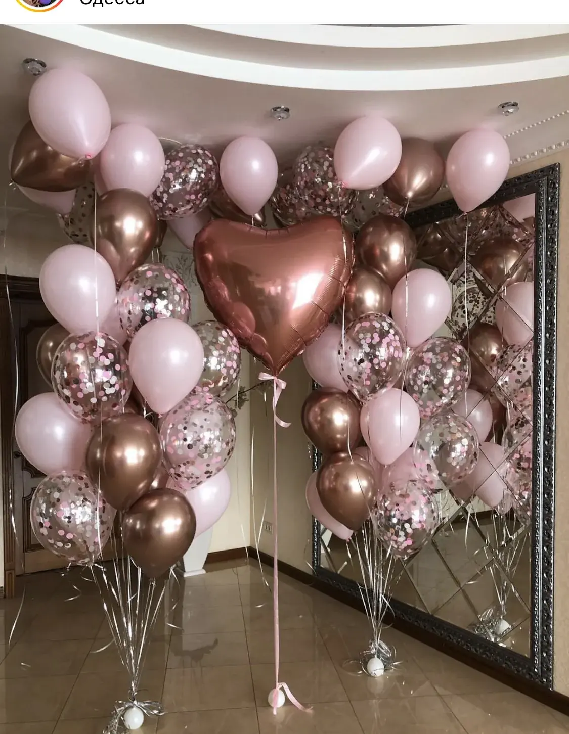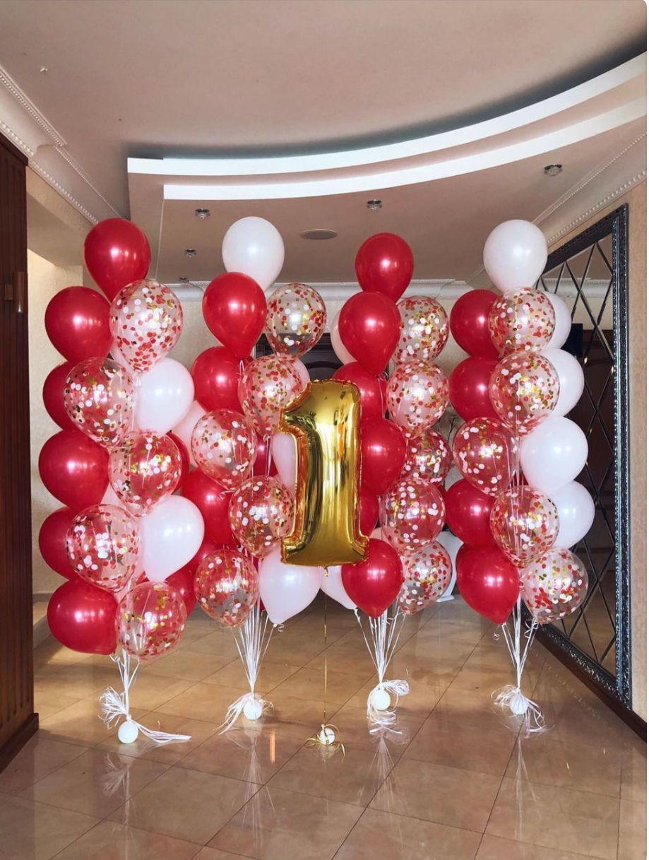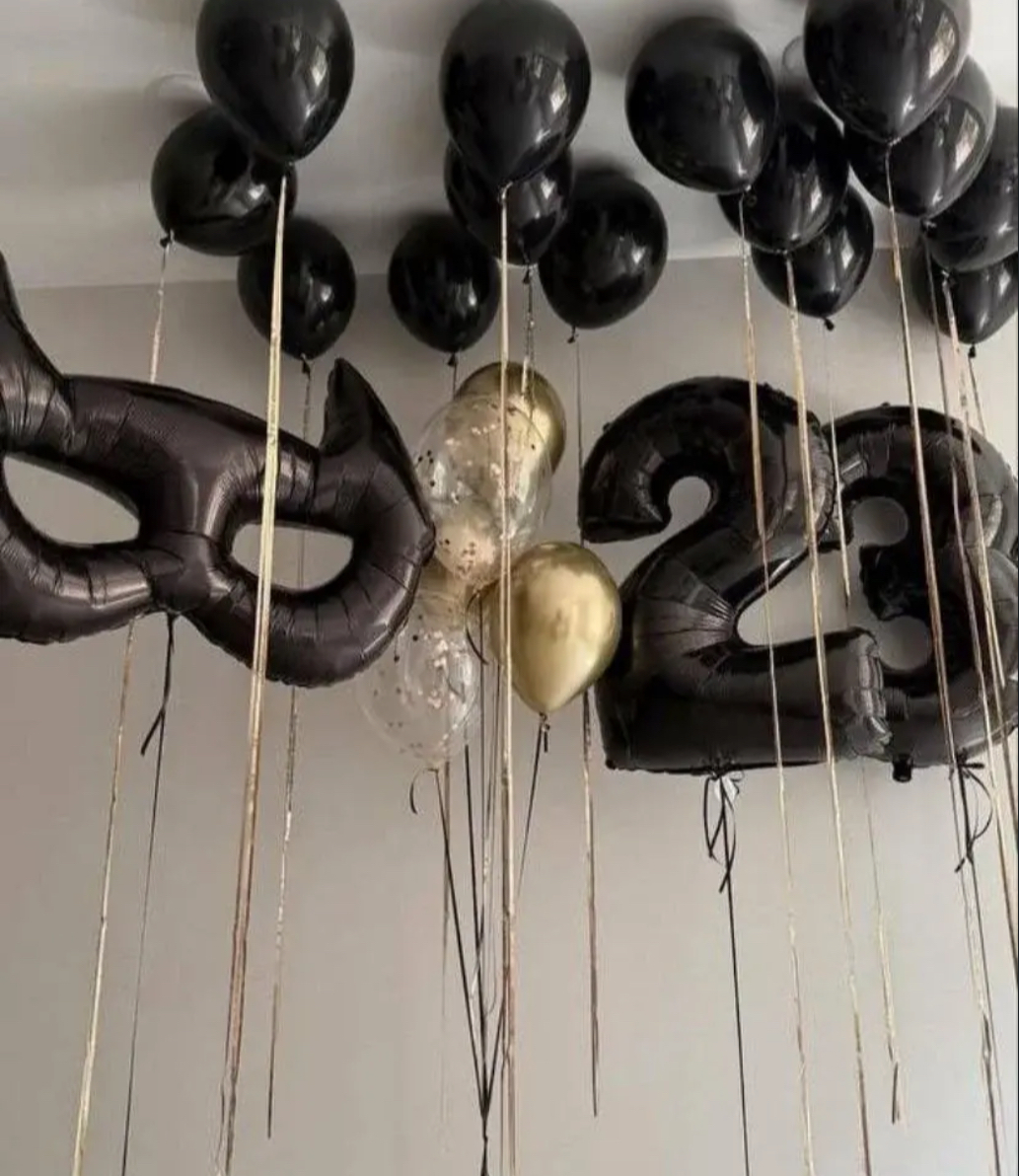 В композицию входит : Коробка с вашей надпись 5 фонтанов ( по 2 фольгированные звезды + 1 фольгированное сердце + 2 шара с конфетти + 8 шаров постель ) 2 шара гигант с конфетти 1 шар гигант белый 2 цифры 50 шаров постель под потолок 10 грузиков