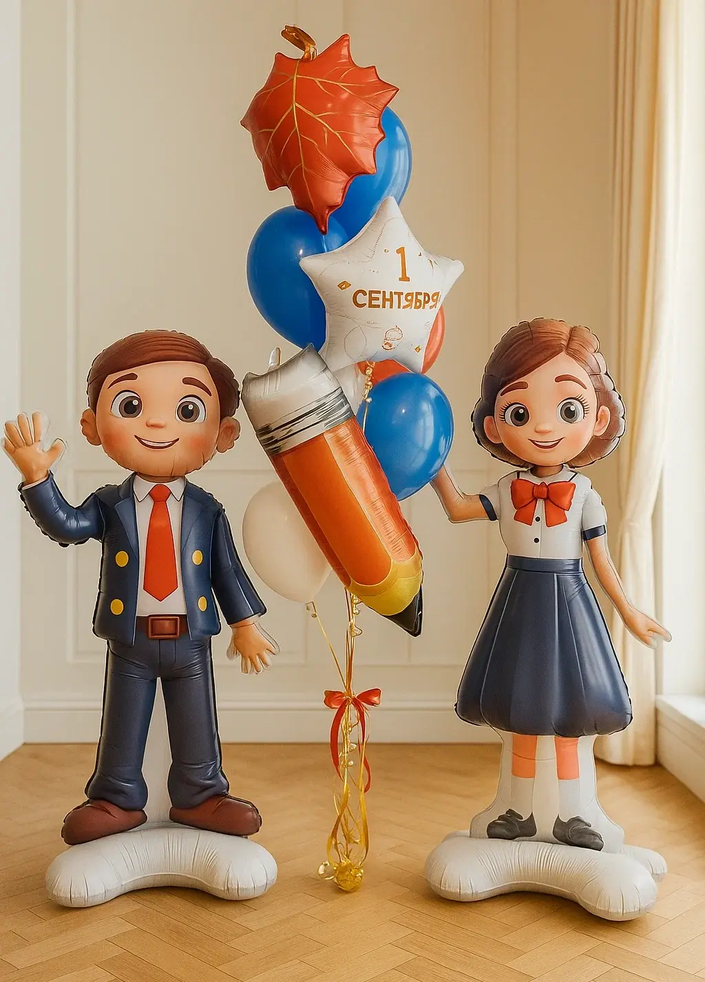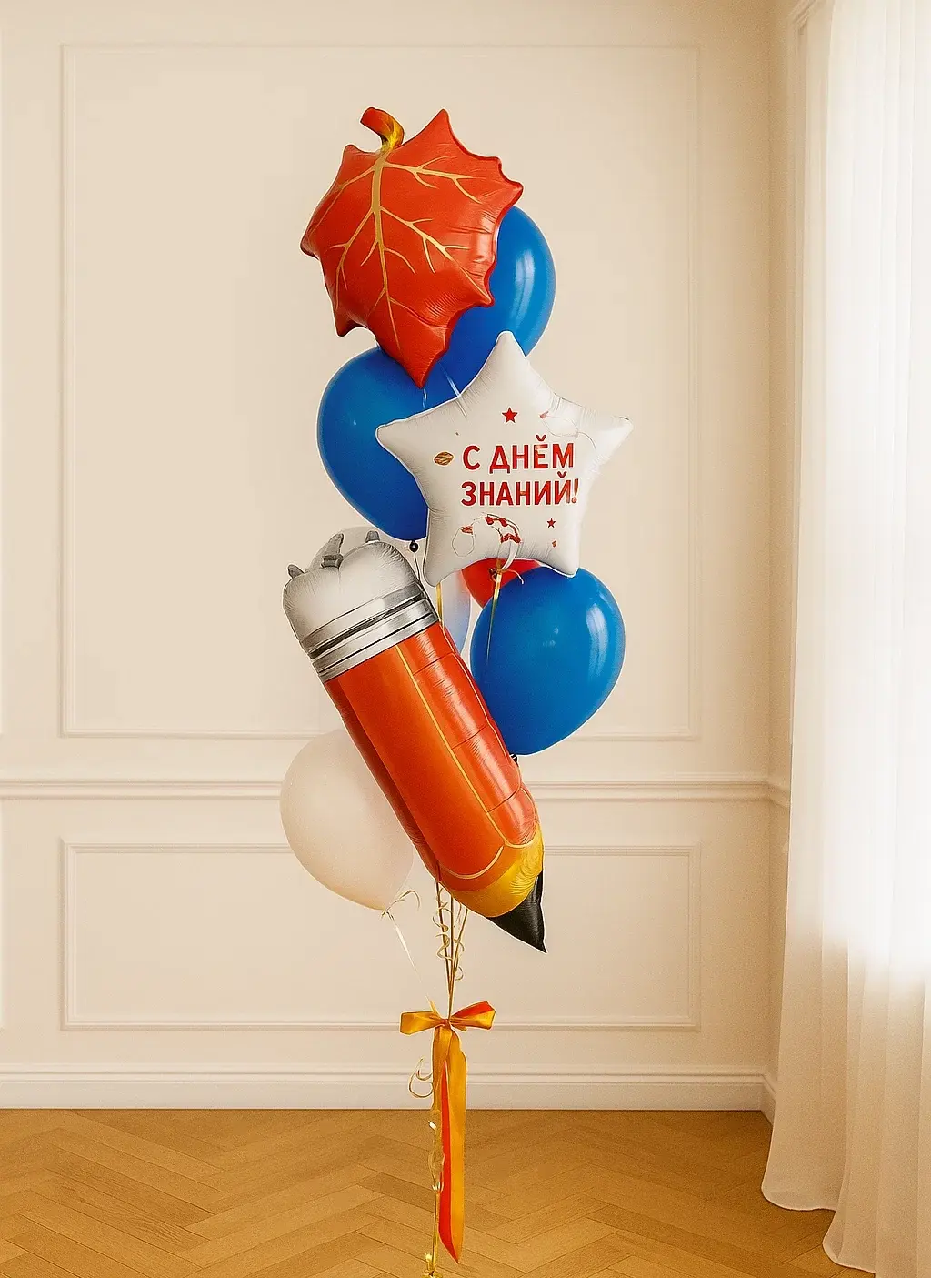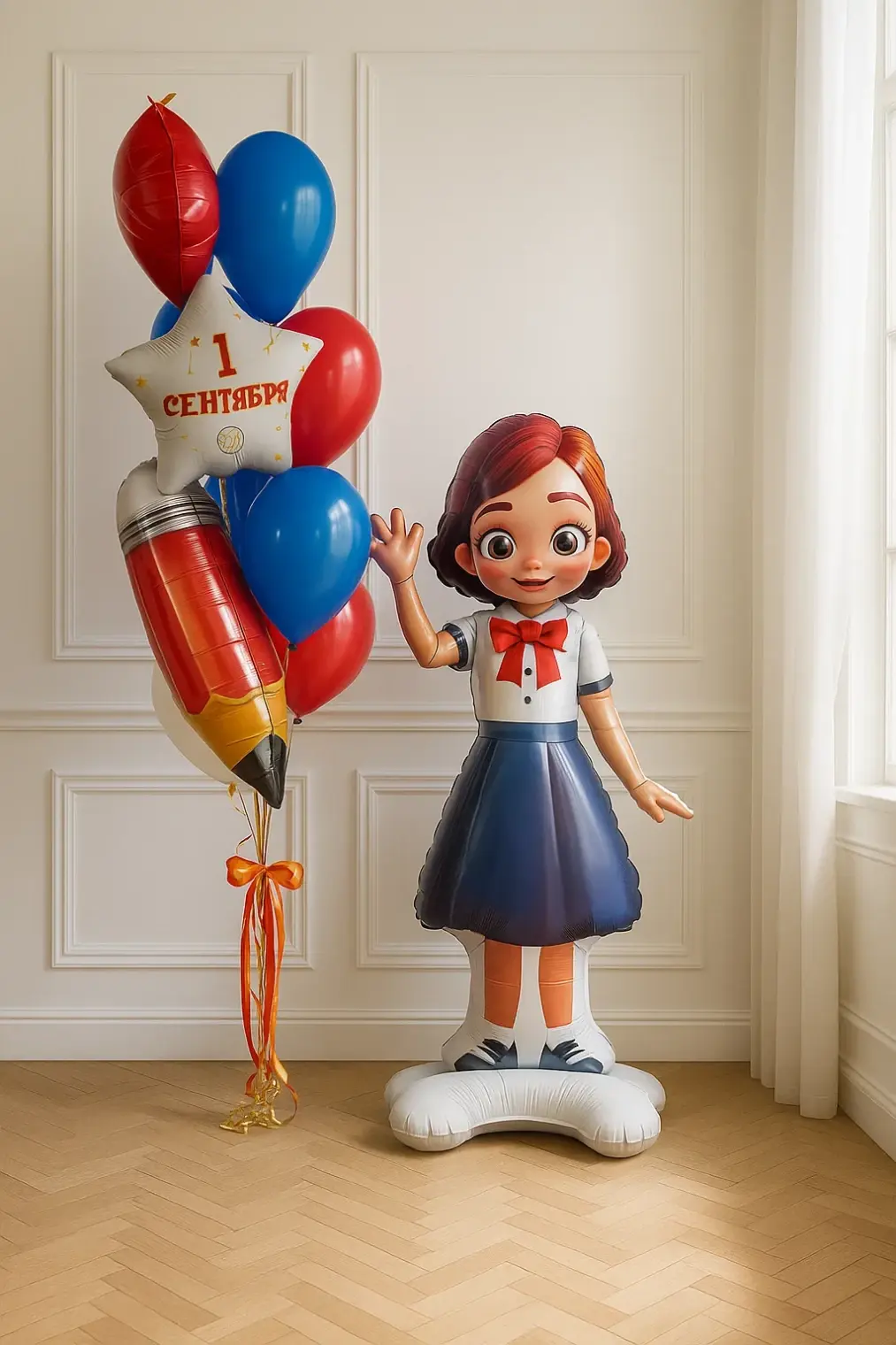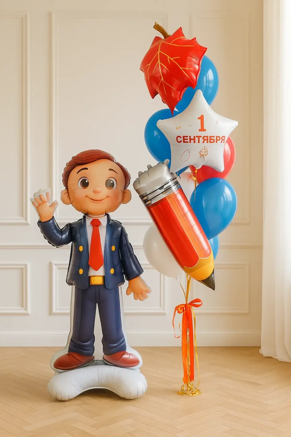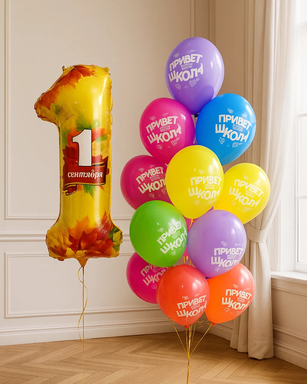 В композицию входит : 1 фольгированная фигура 1 фольгированная фигура 1 фонтан ( 1 фольгированый круг с рисунком, 6 шаров с рисунком, 3 шара пастель ) 2 грузика