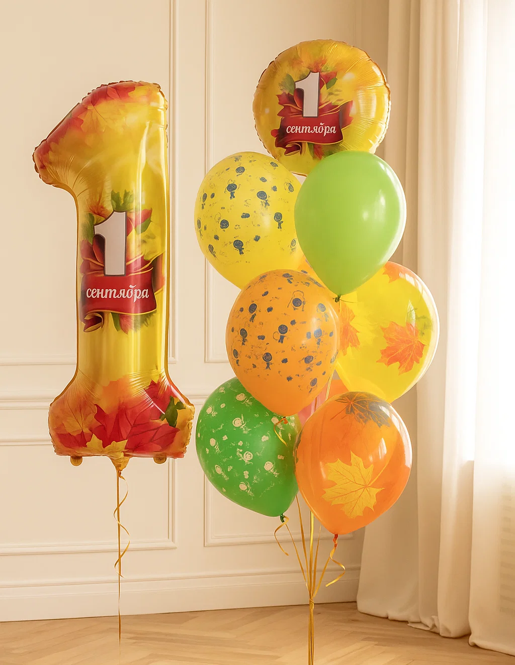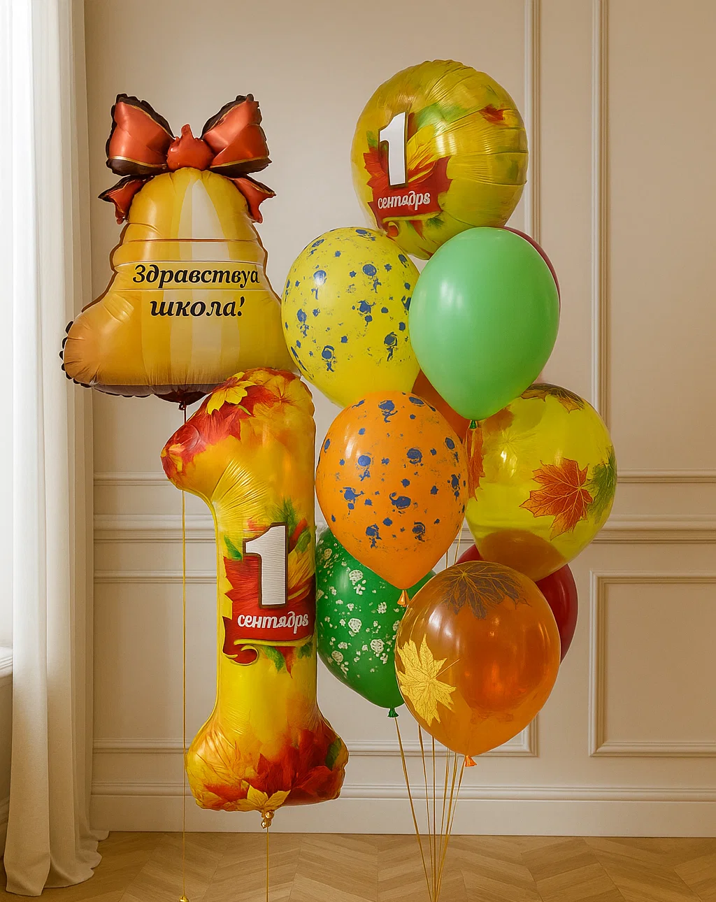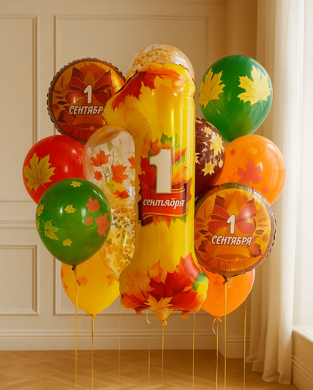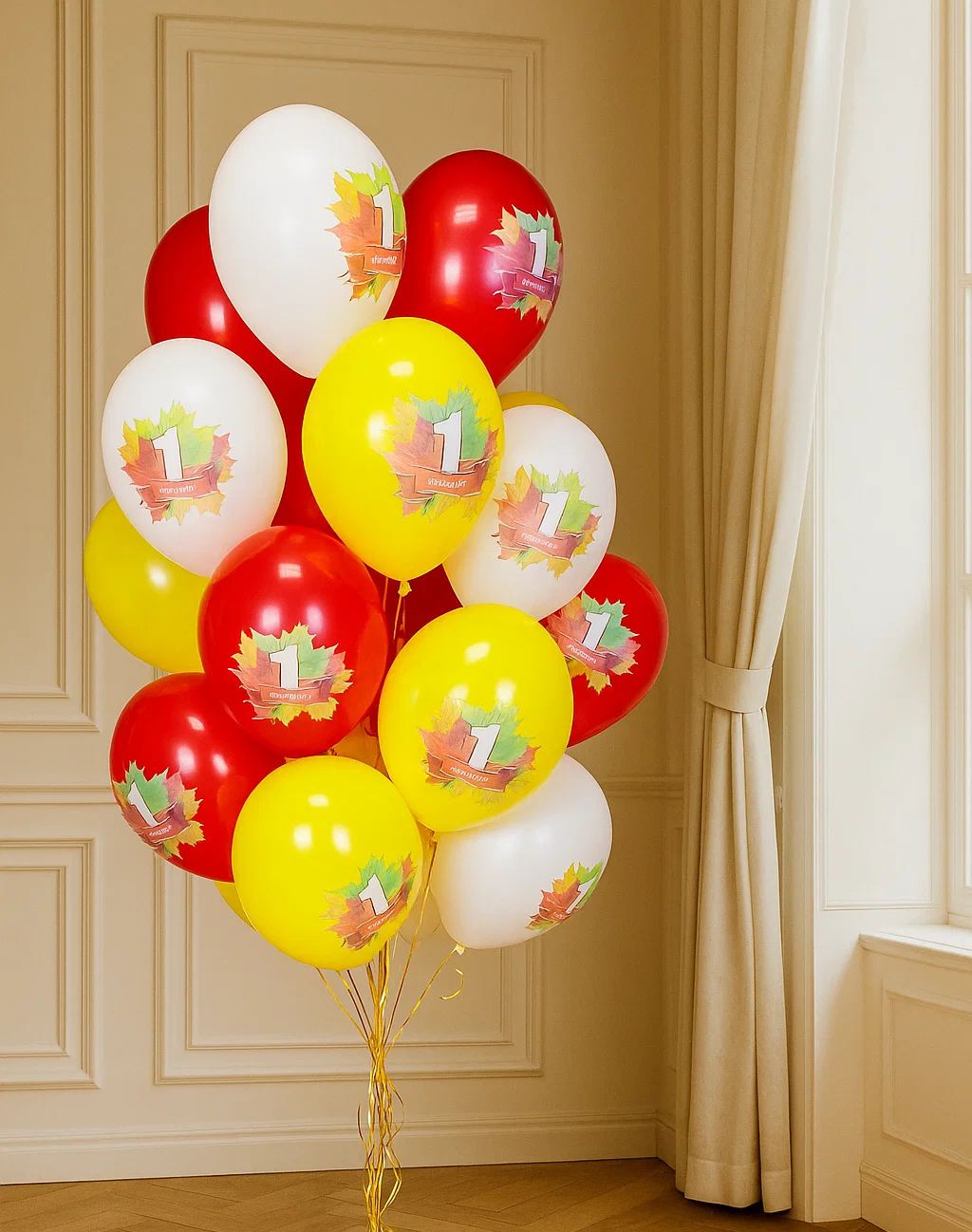 В композицию входит : 1 фольгированная фигура 1 фольгированная фигура 1 фонтан ( 1 фольгированый круг с рисунком, 6 шаров с рисунком, 3 шара пастель ) 2 грузика