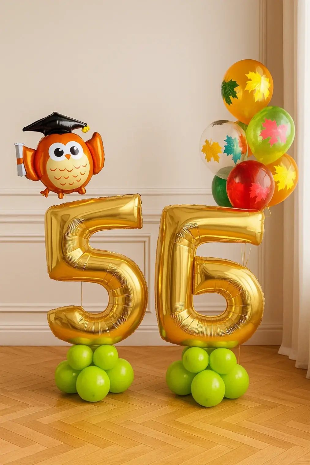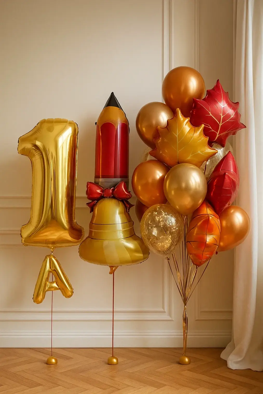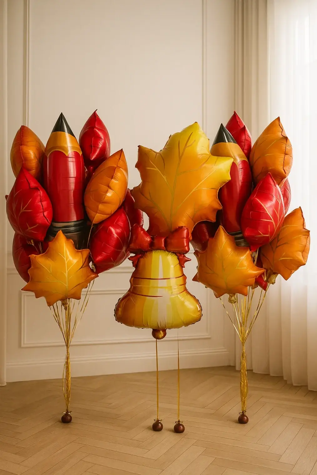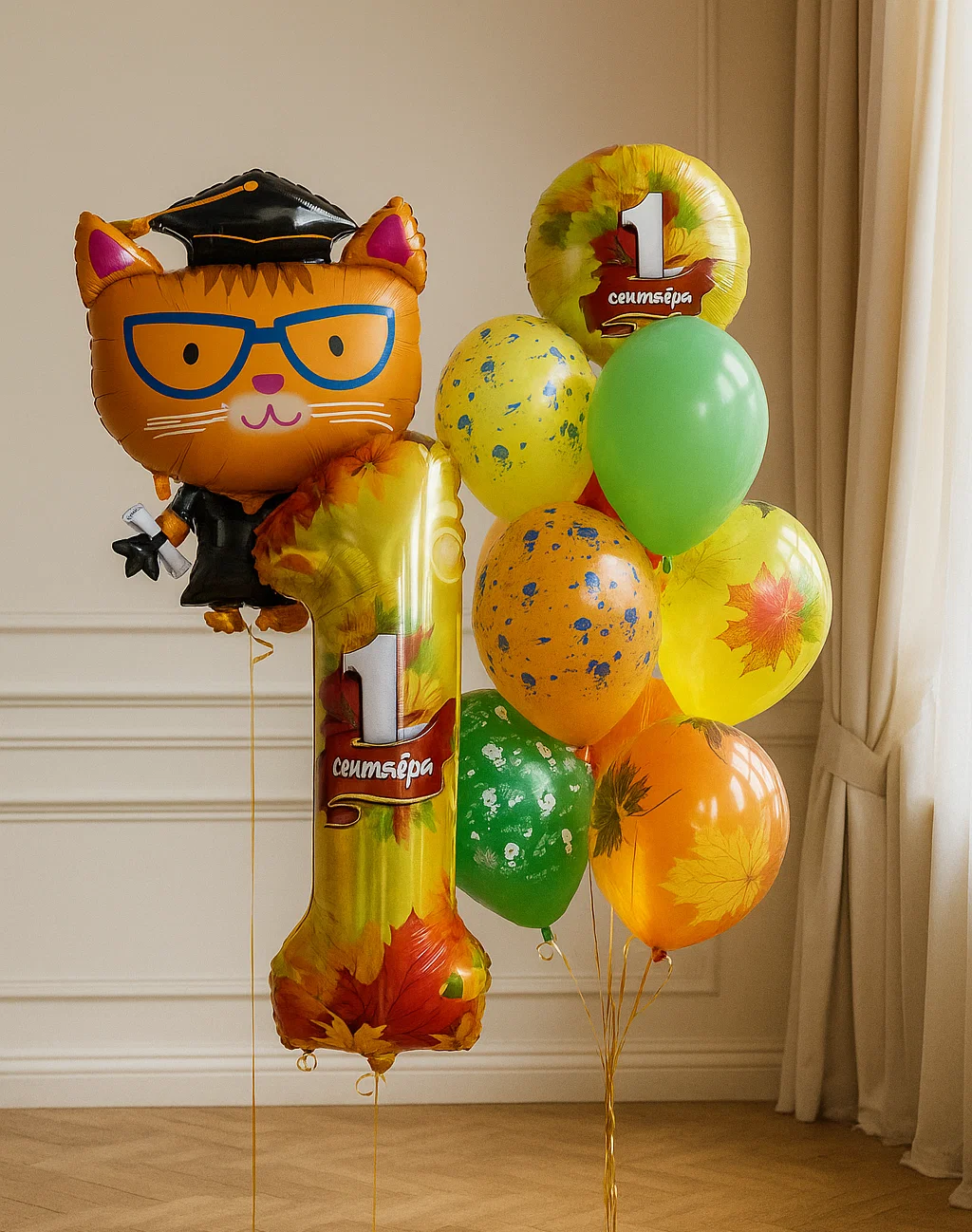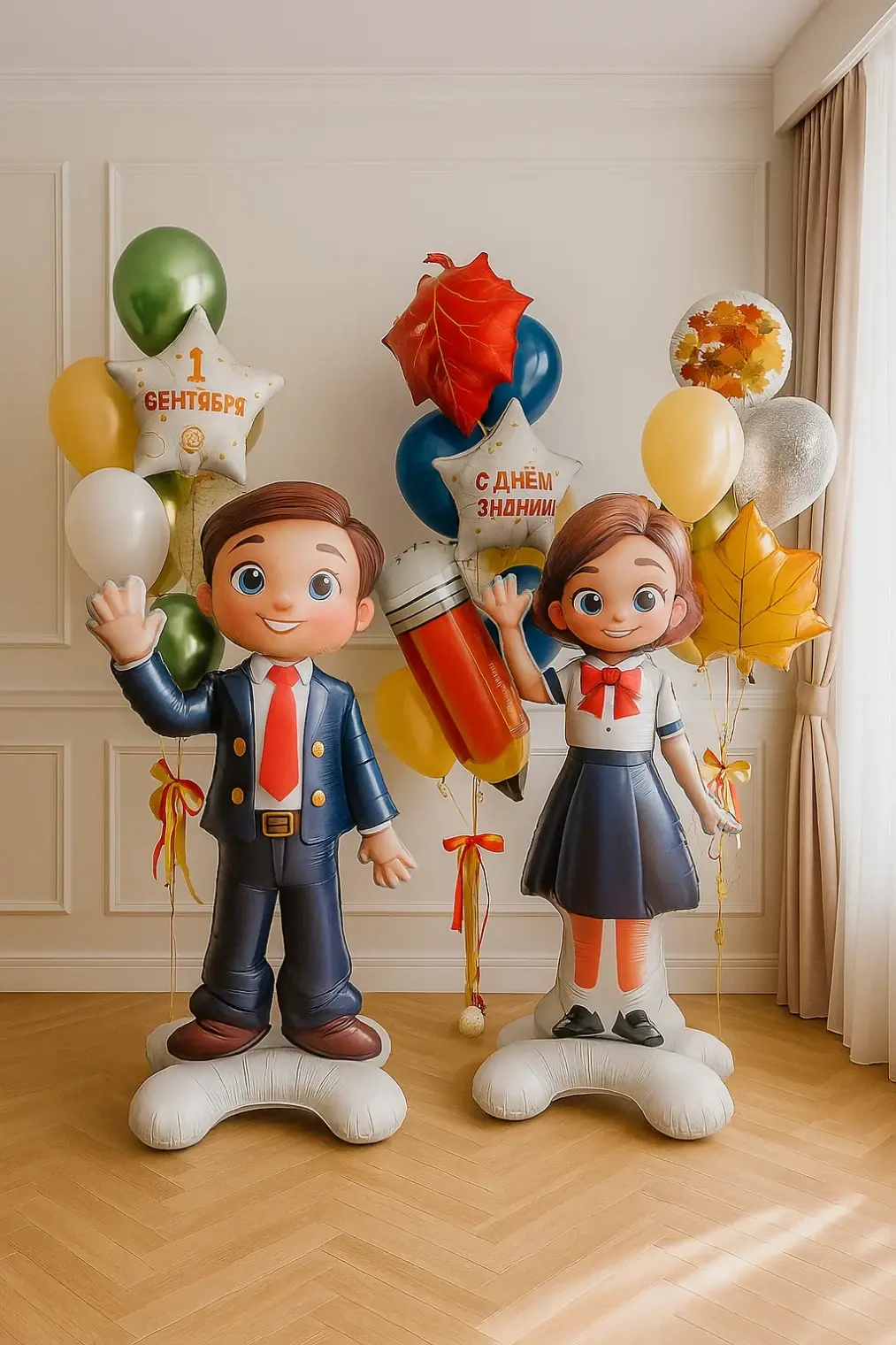 В композицию входит : 1 фольгированная фигура 1 фольгированная фигура 1 фонтан ( 1 фольгированый круг с рисунком, 6 шаров с рисунком, 3 шара пастель ) 2 грузика