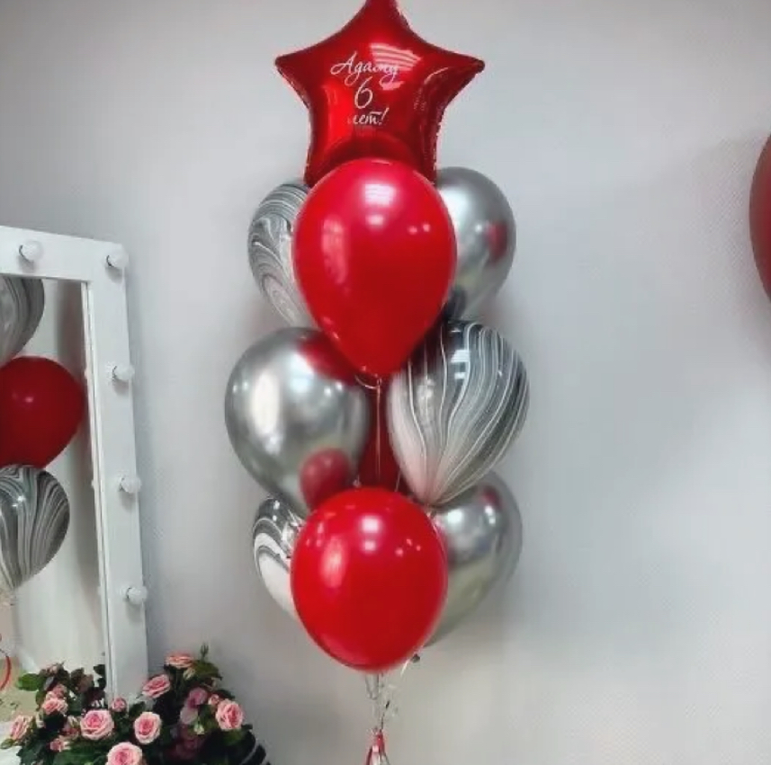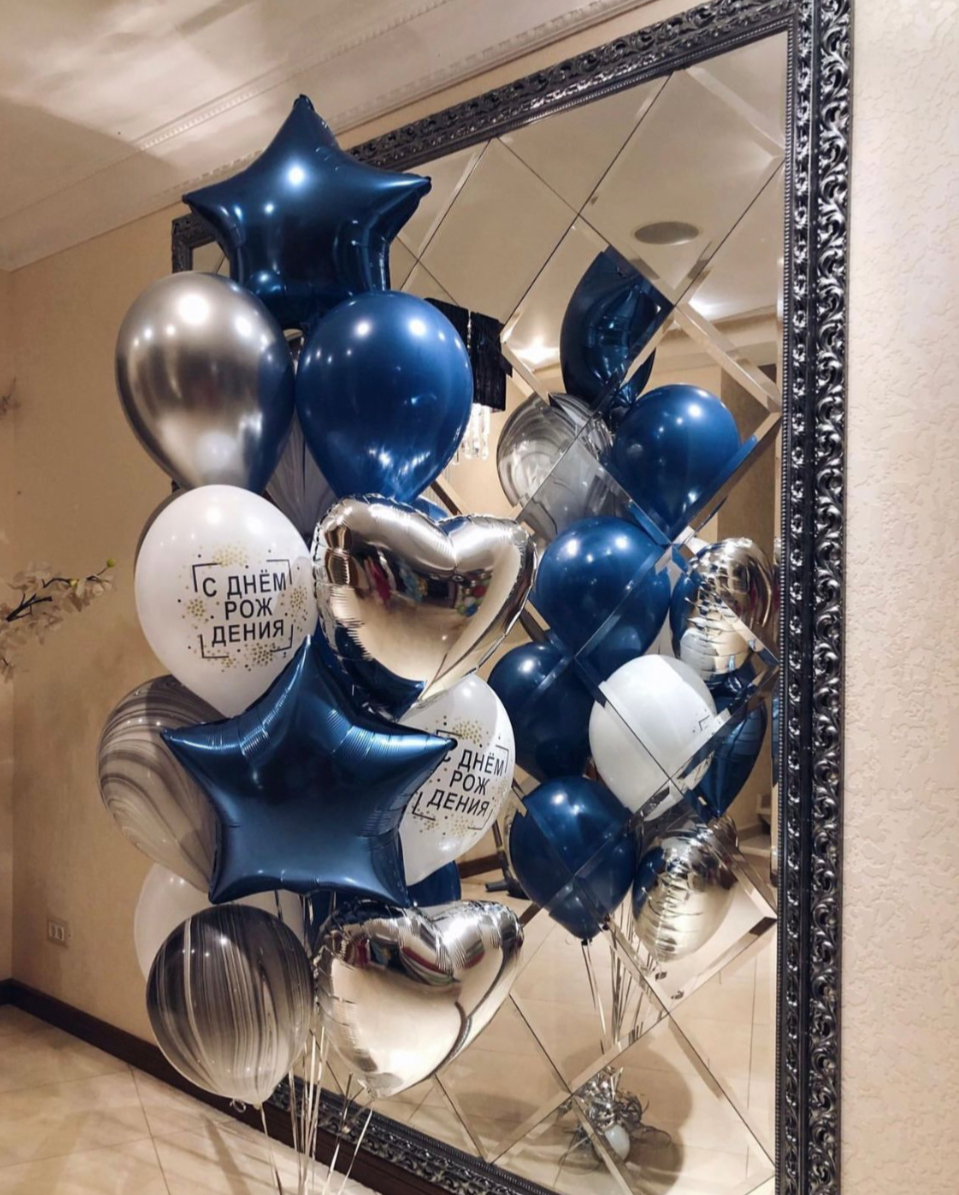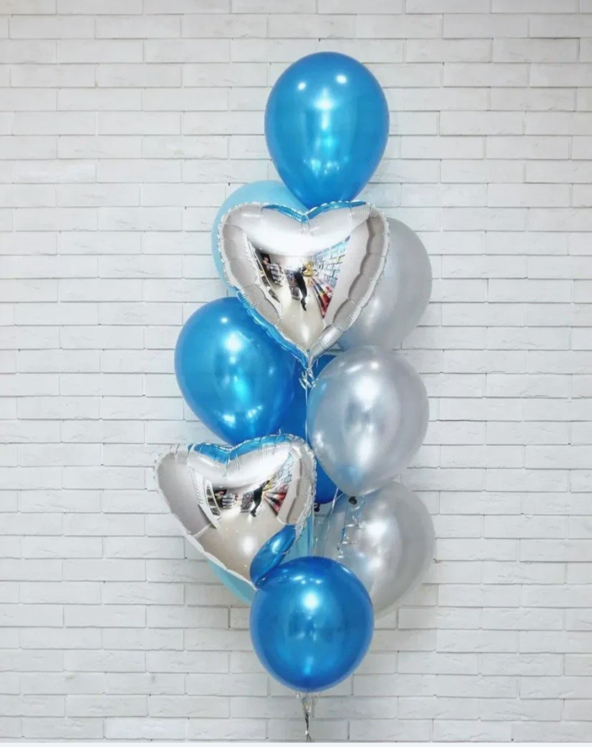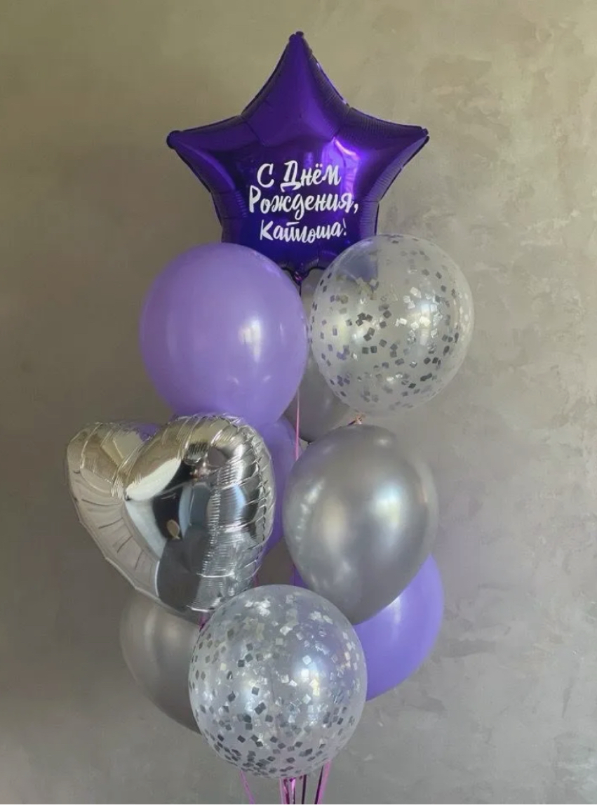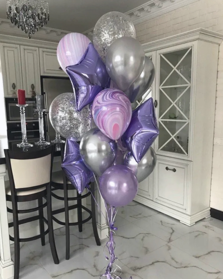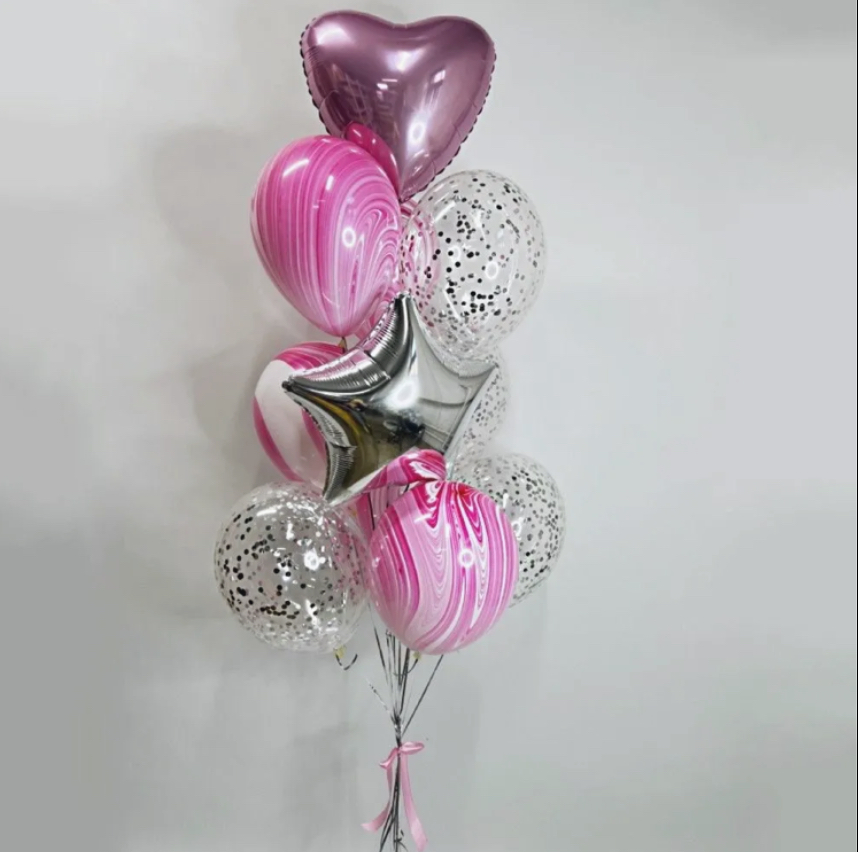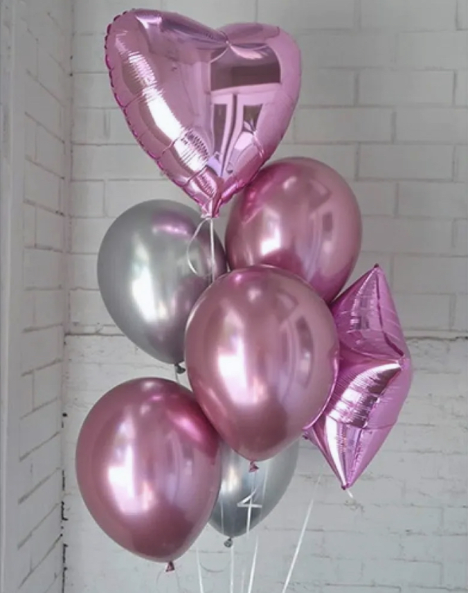 В фонтан входит : 2 фольгированные звёзды 2 фольгированных сердца 3 шара с днём рождения 3 шара Агат 6 шаров хром 1 грузик