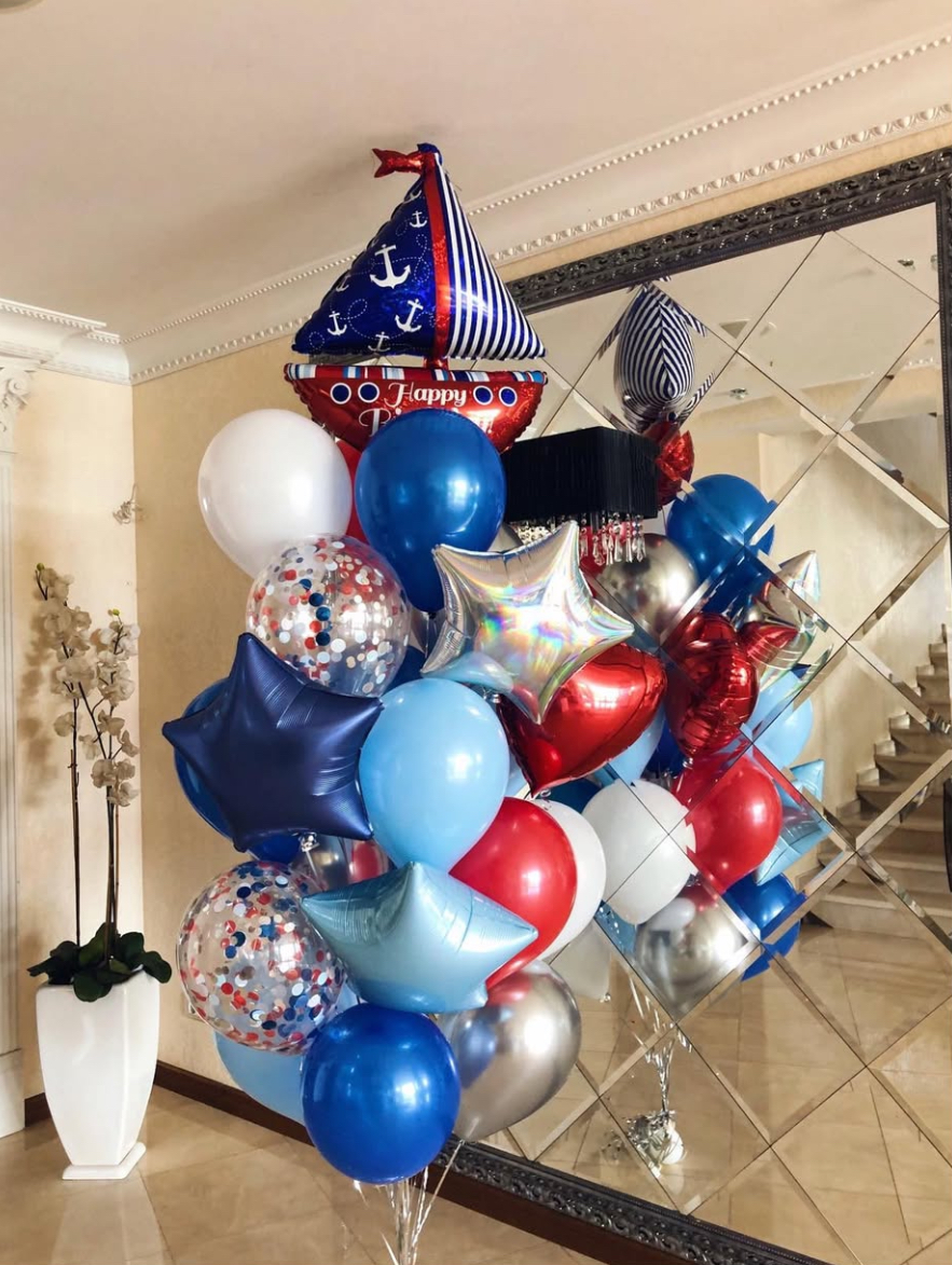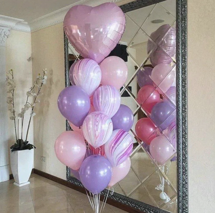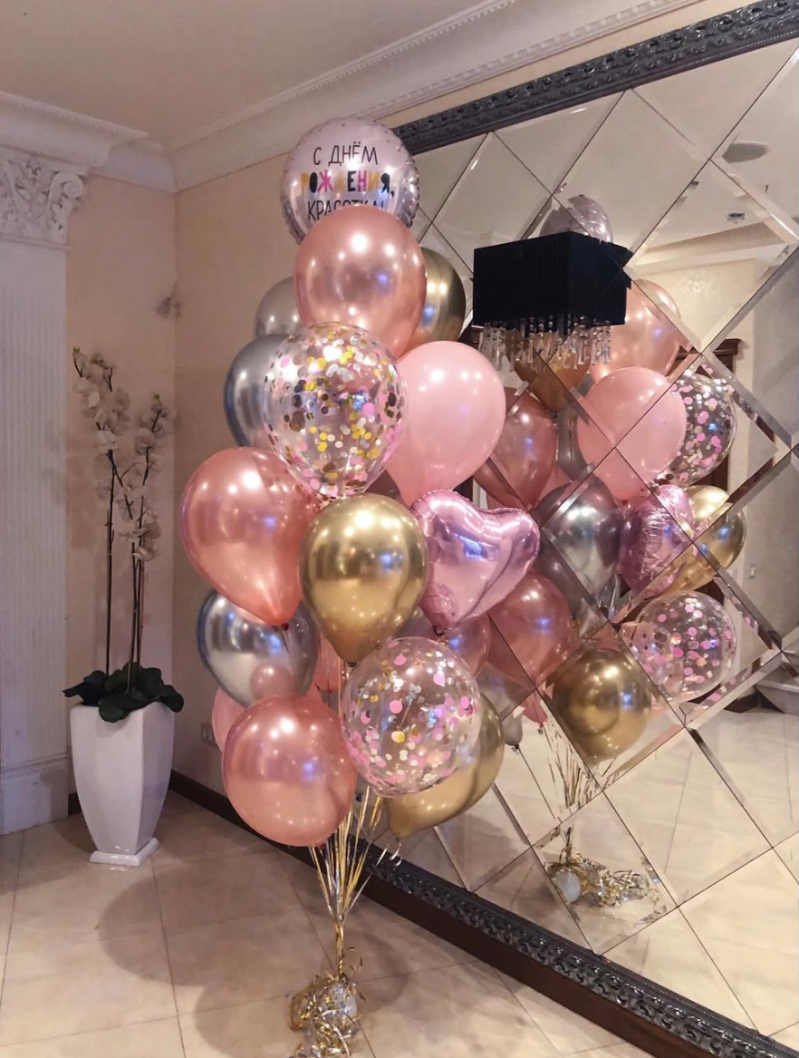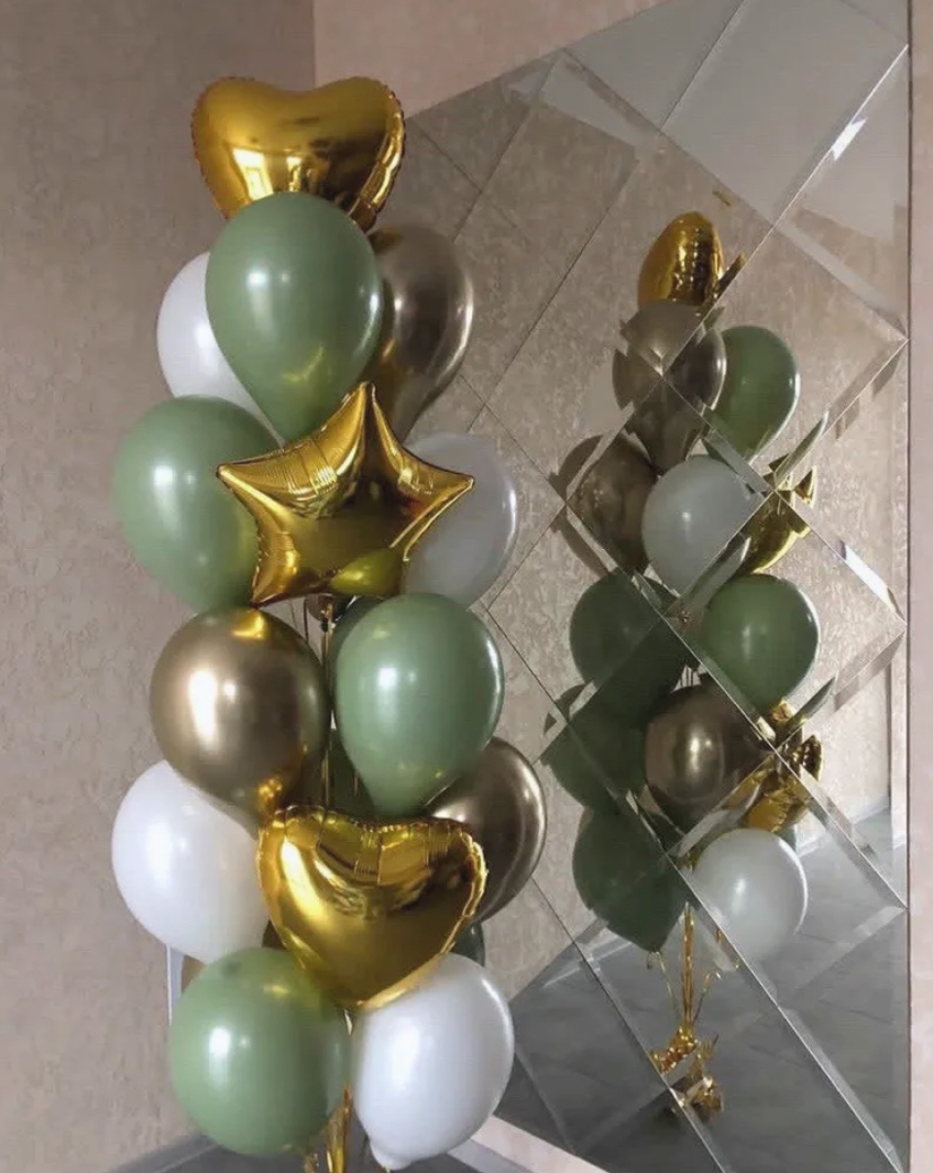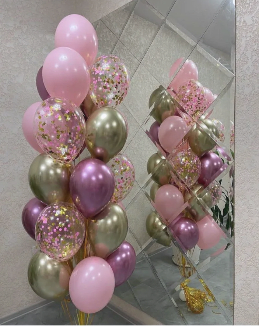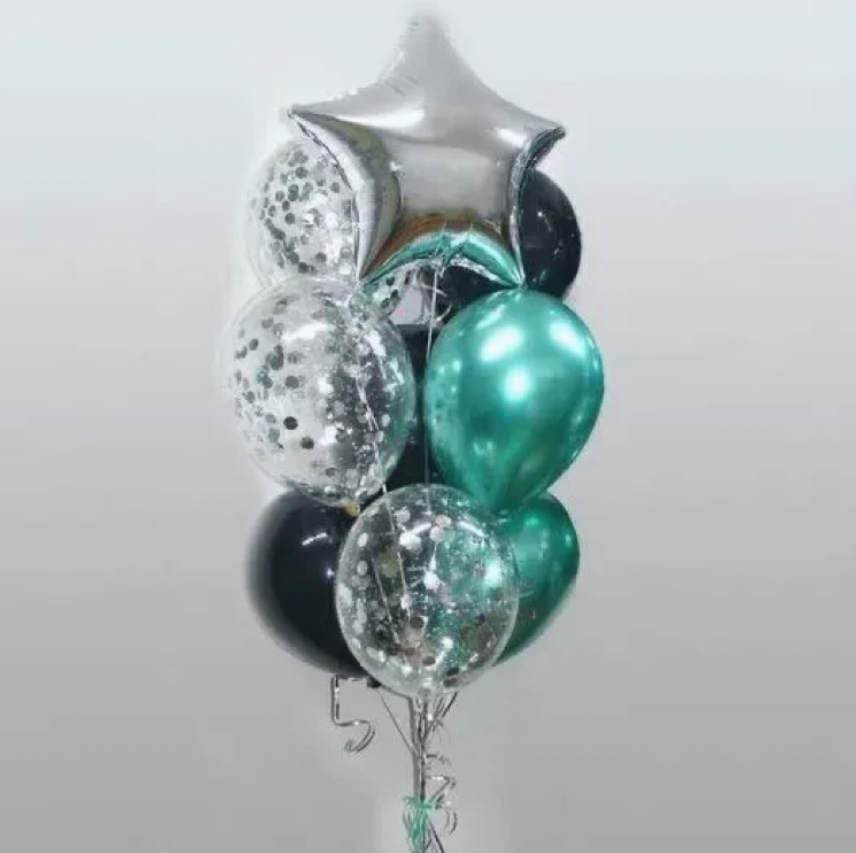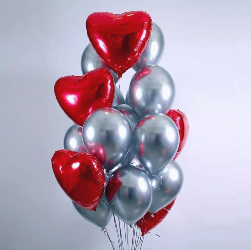 В фонтан входит : 2 фольгированные звёзды 2 фольгированных сердца 3 шара с днём рождения 3 шара Агат 6 шаров хром 1 грузик