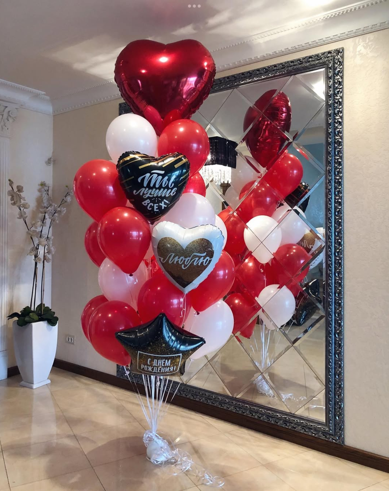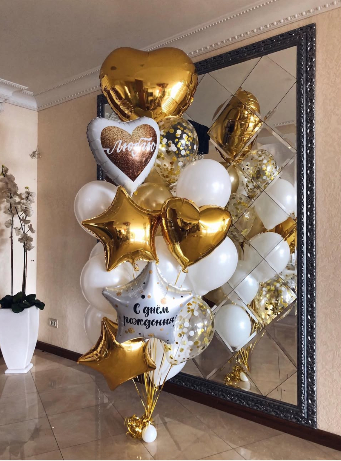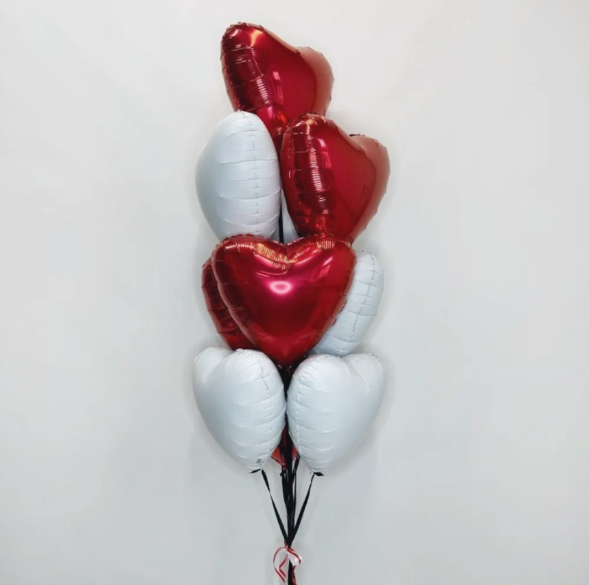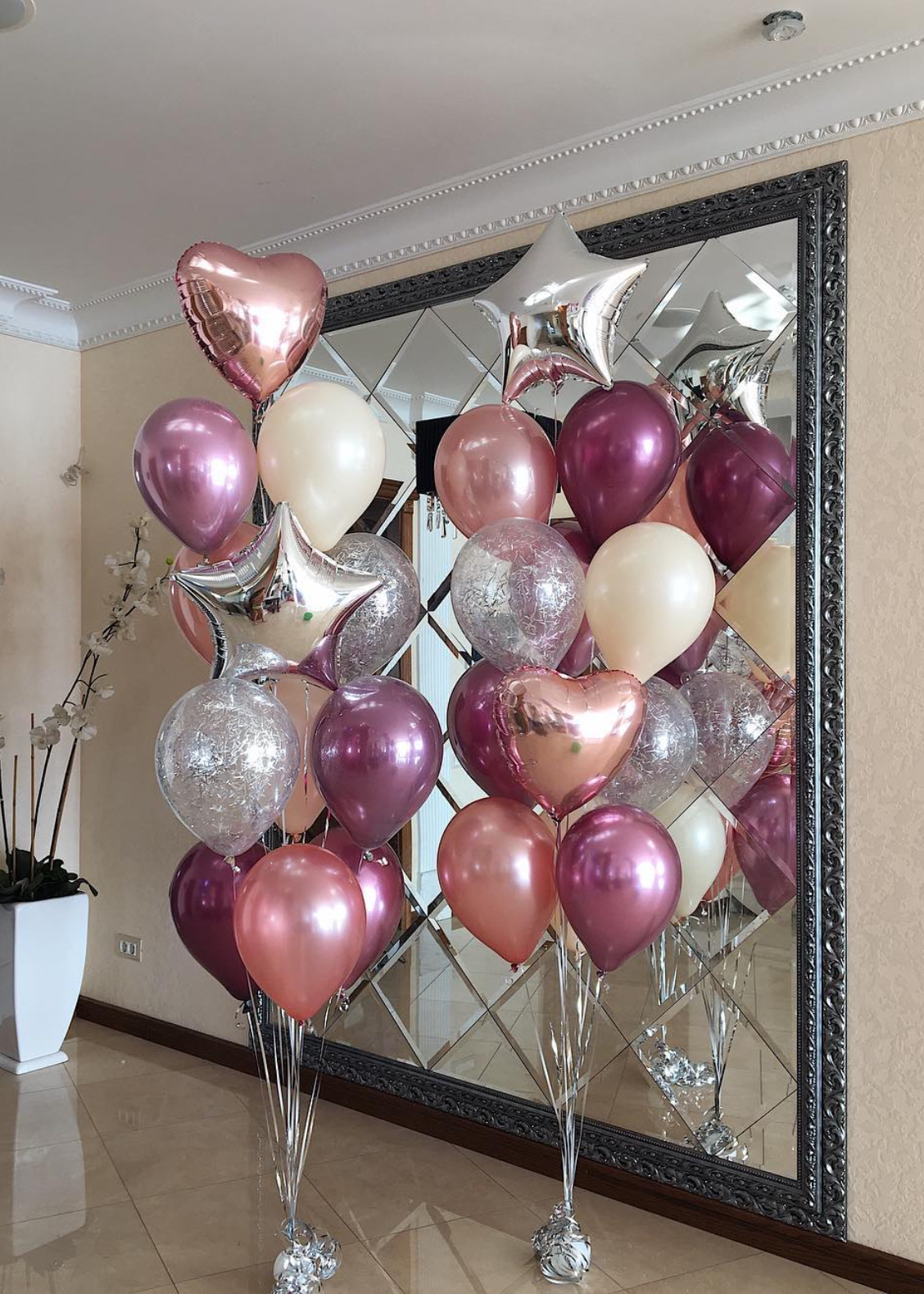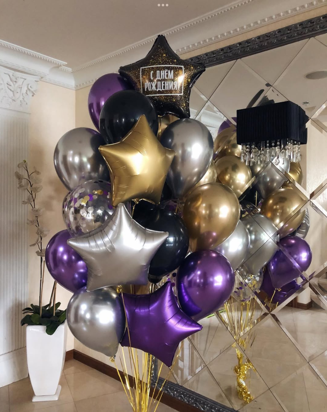 В фонтан входит : 2 фольгированные звёзды 2 фольгированных сердца 3 шара с днём рождения 3 шара Агат 6 шаров хром 1 грузик