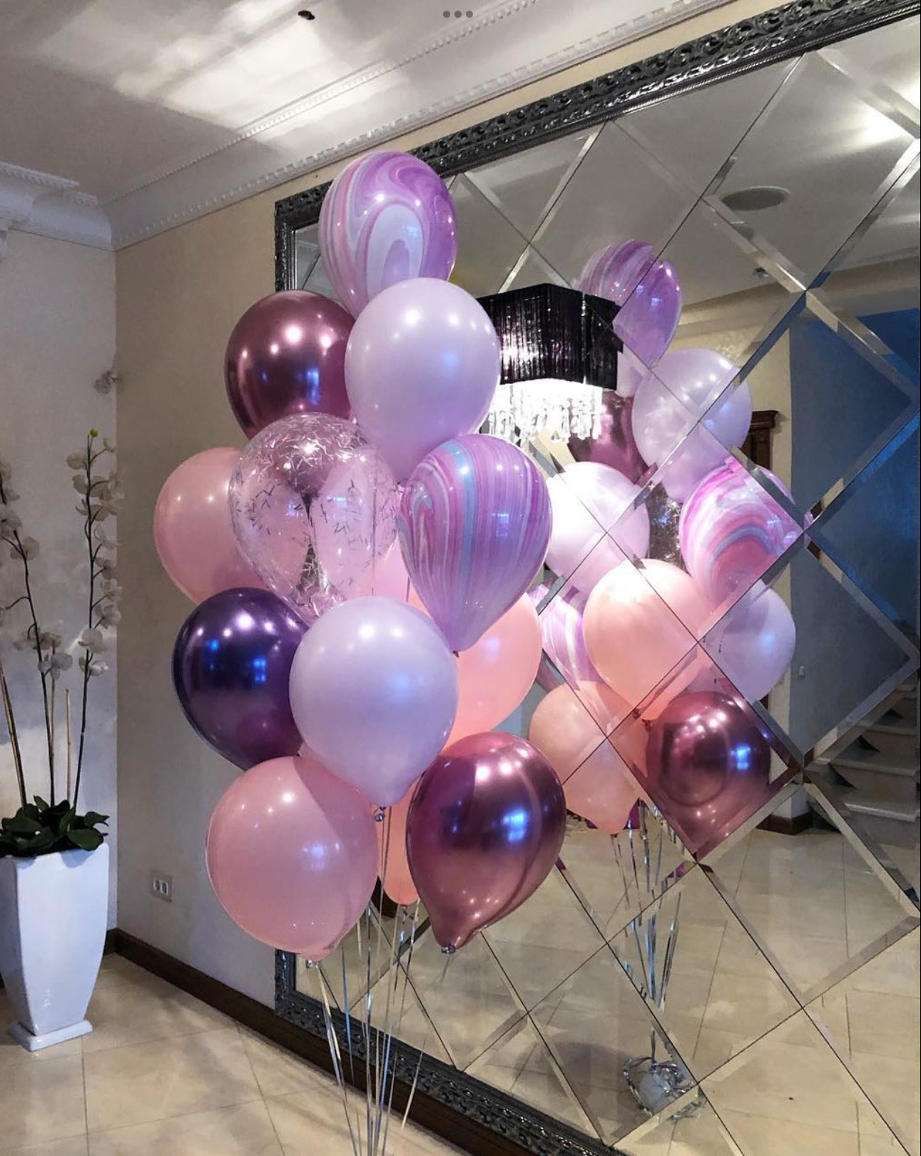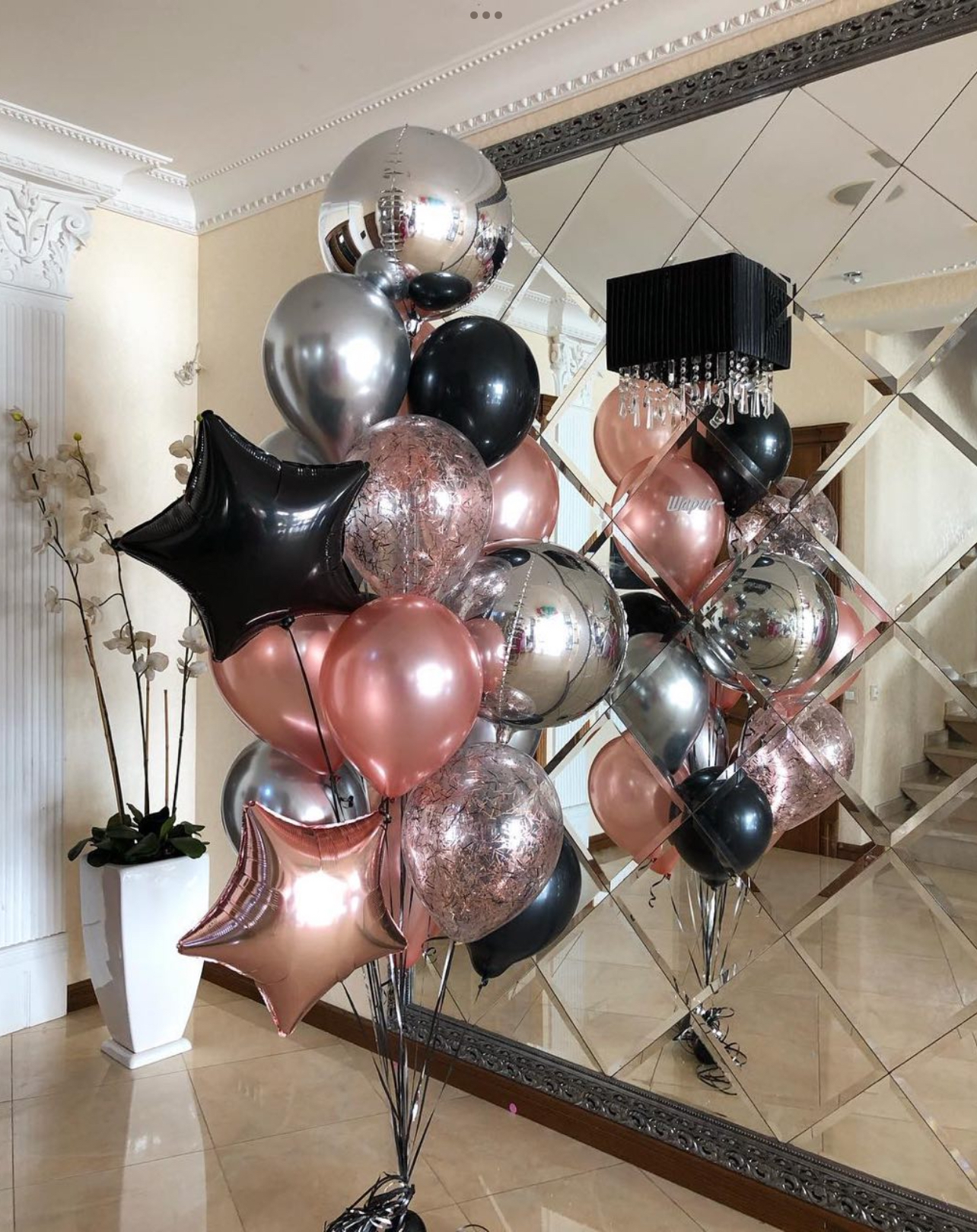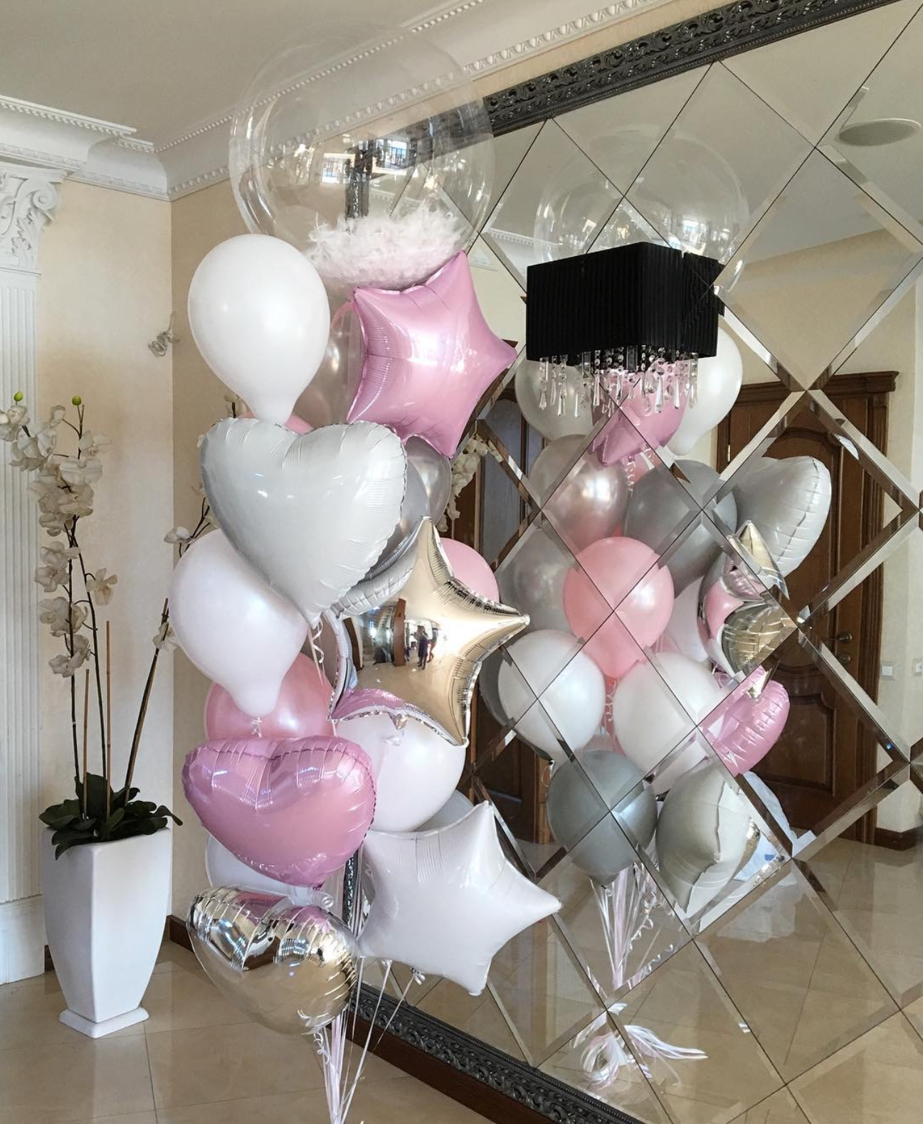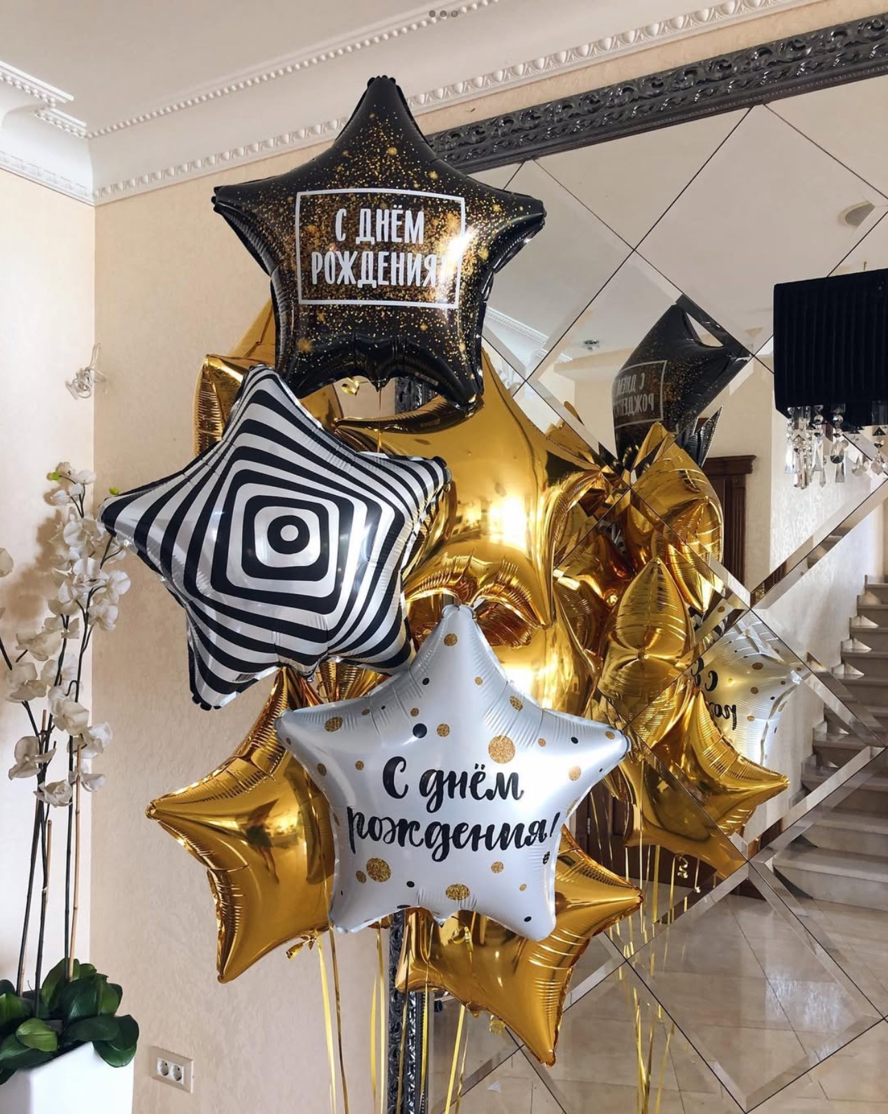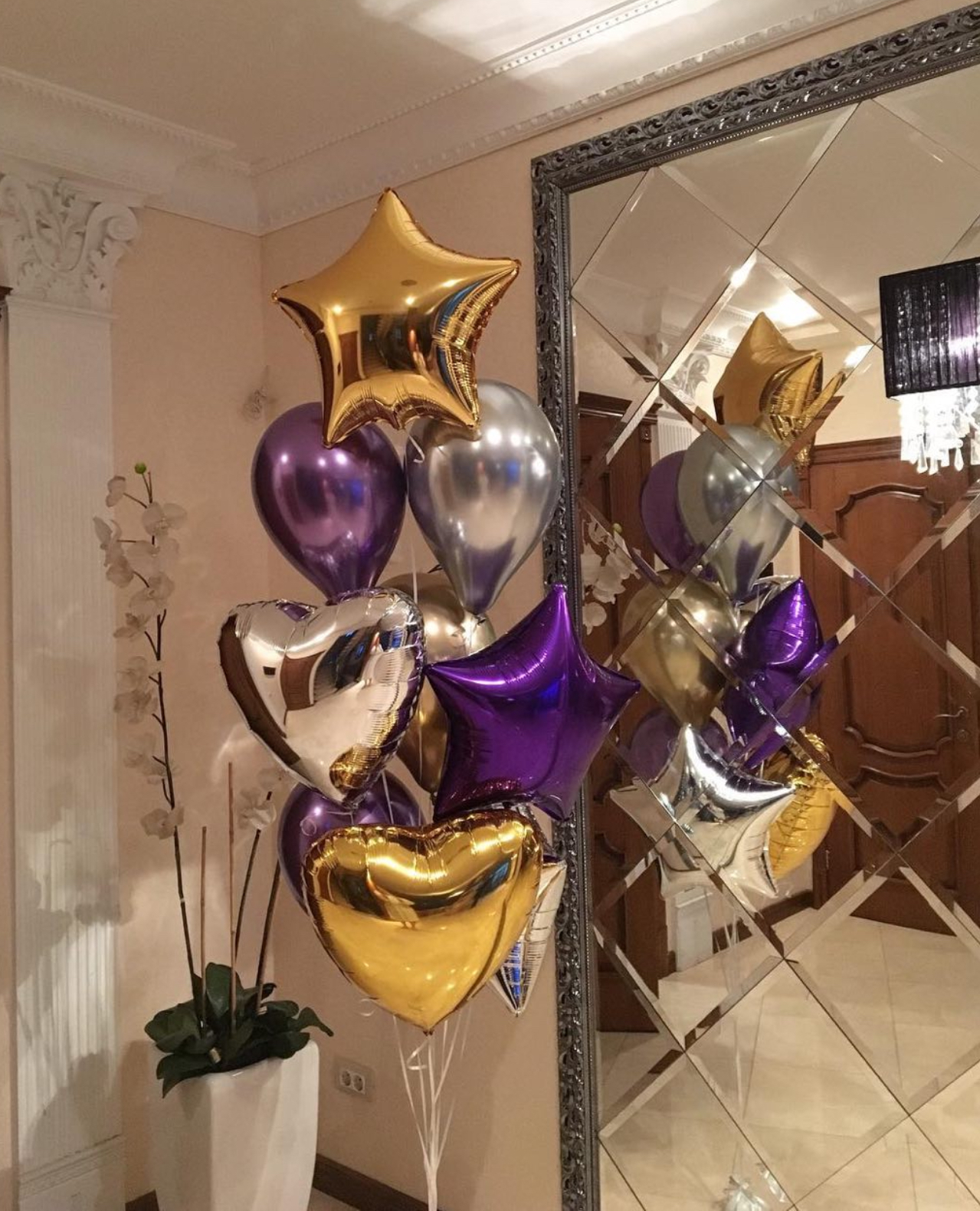 В фонтан входит : 2 фольгированные звёзды 2 фольгированных сердца 3 шара с днём рождения 3 шара Агат 6 шаров хром 1 грузик